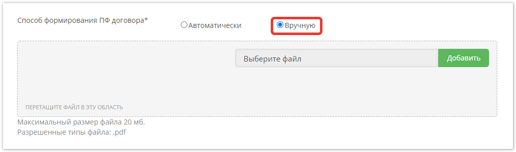 Способ формирования ПФ договора — выберите, каким способом будем формироваться печатная форма договора. Автоматически — печатная форма сформируется на основе введенных данных. Вручную — появится окно загрузки печатной формы договора, созданной покупателем самостоятельно. Допустимый формат файла — PDF.