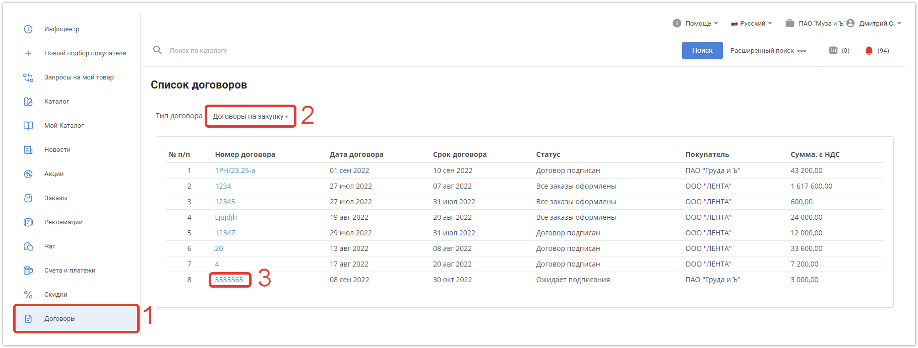 В личном кабинете поставщика он сможет ознакомиться с договором, кликнув по его номеру в разделе Договоры. Чтобы договор начал отображаться в списке, в выпадающем меню должен быть выбран тип договора Договоры на закупку.