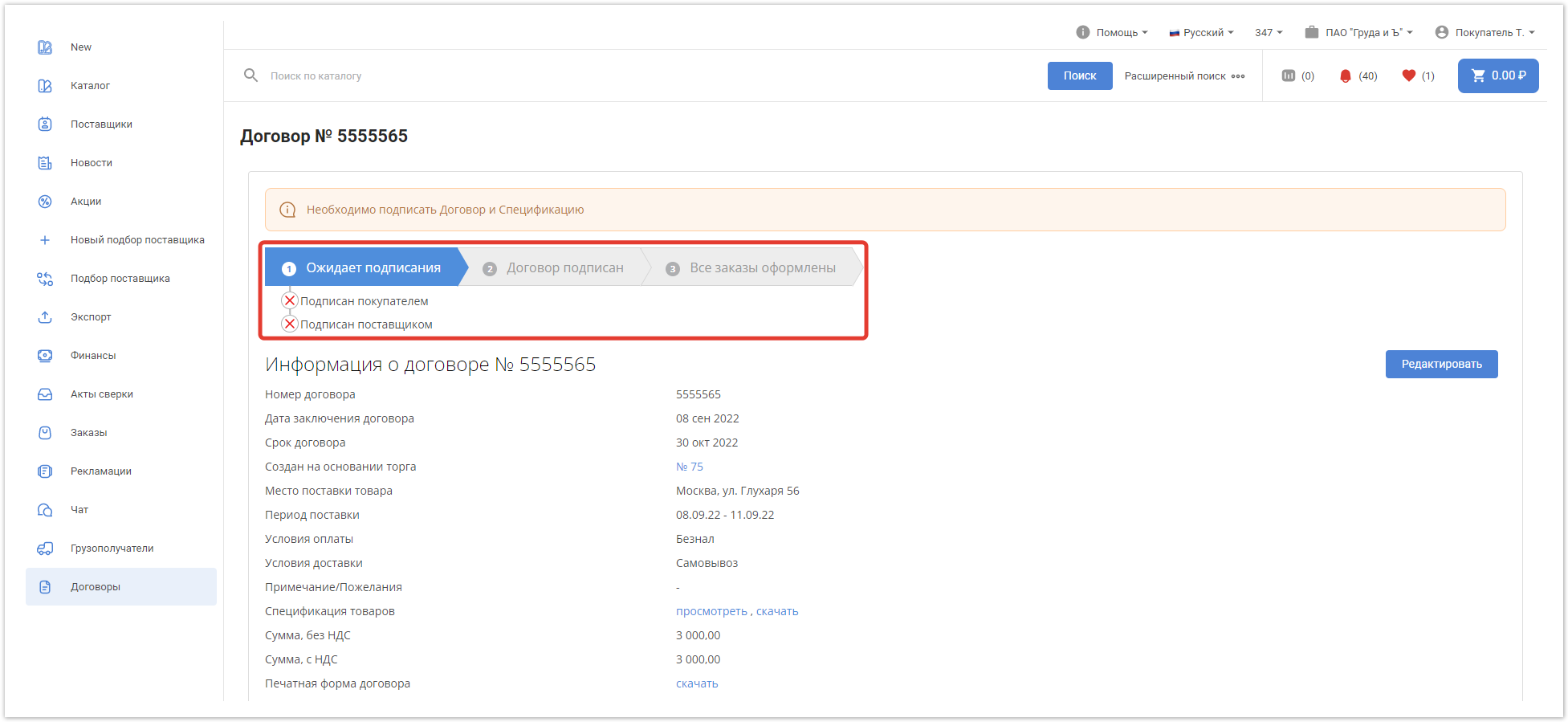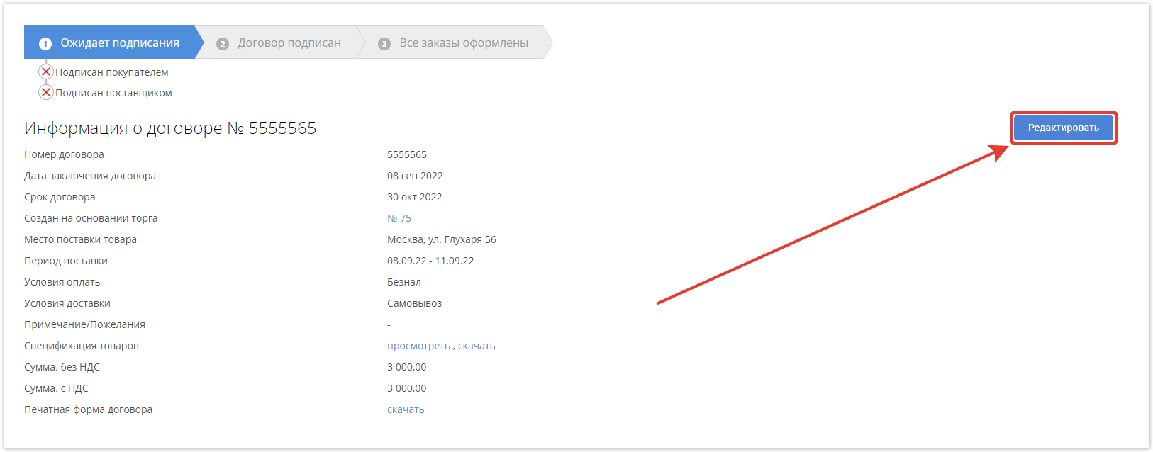 Поставщик после перехода в договор видит аналогичную страницу, за исключением кнопки Редактировать, она доступна только покупателю, организовавшему торг.