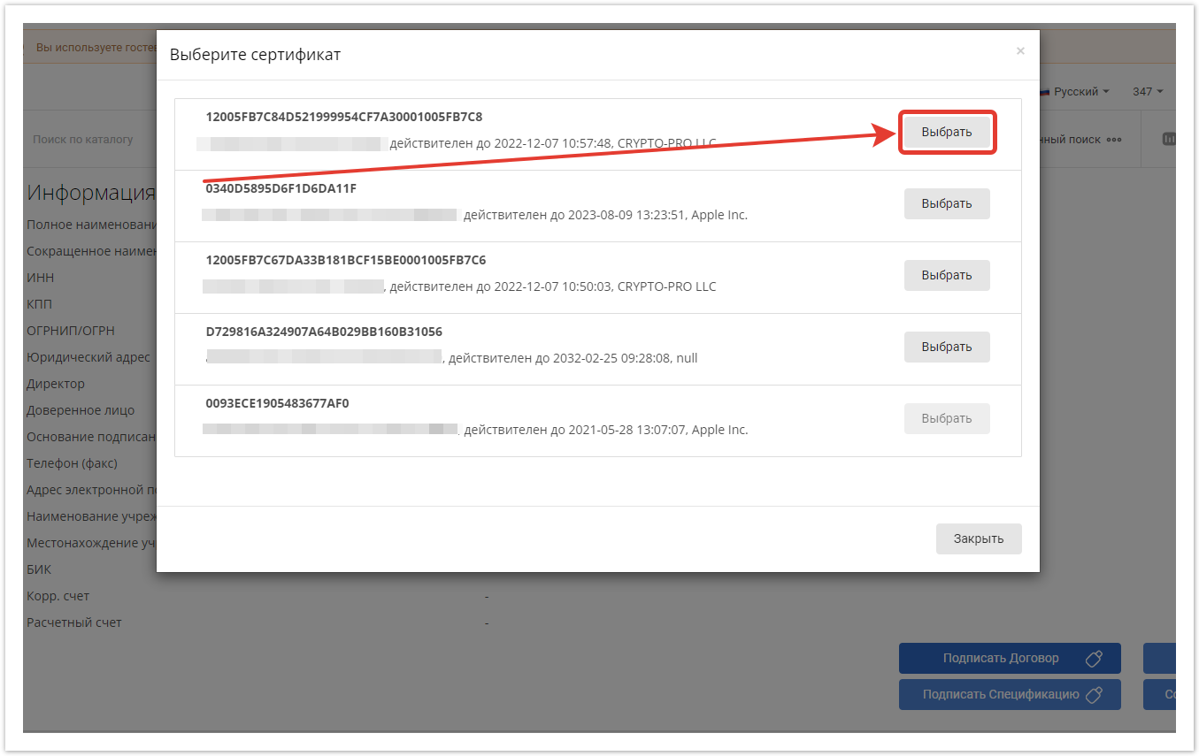 При клике по кнопке подписания откроется список электронных подписей, которыми можно подписать документы. Для подписи нажмите на кнопку Выбрать у нужной подписи.