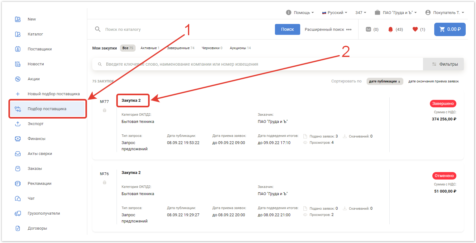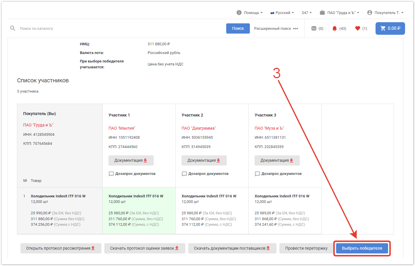По завершении процедуры торга покупателю необходимо выбрать победителя. Для этого в разделе Подбор поставщика перейдите в нужный торг и кликните по кнопке Выбрать победителя внизу страницы.