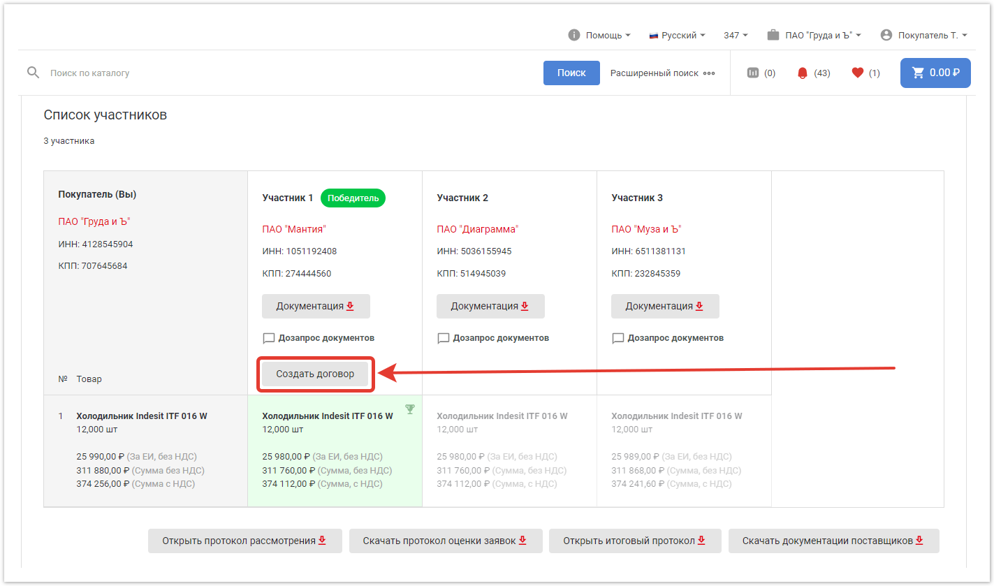 После этого в окне каждого победителя появится кнопка Создать договор.