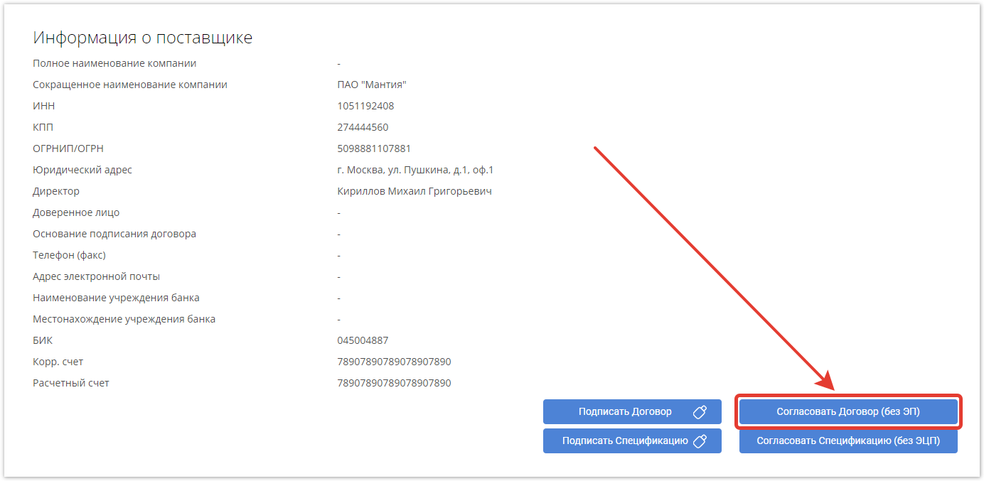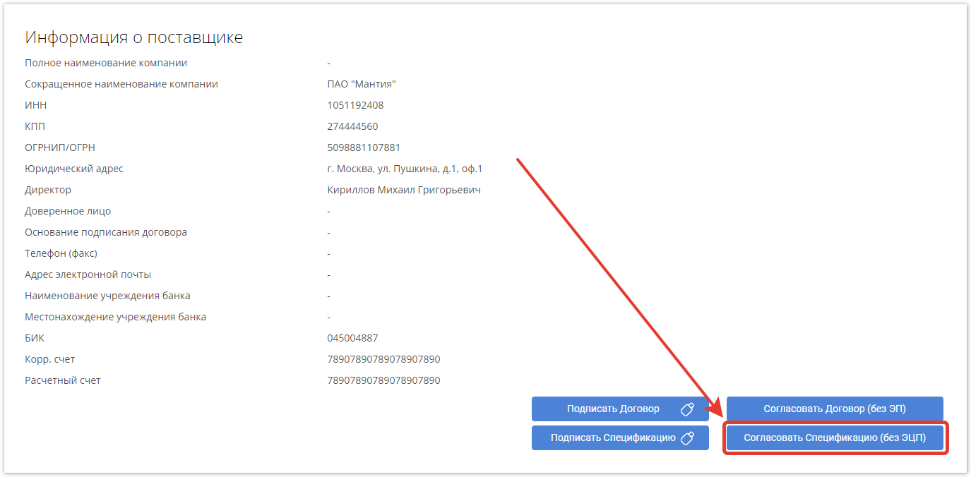 И по кнопке Согласовать Спецификацию (без ЭЦП), чтобы перевести договор в следующий статус.