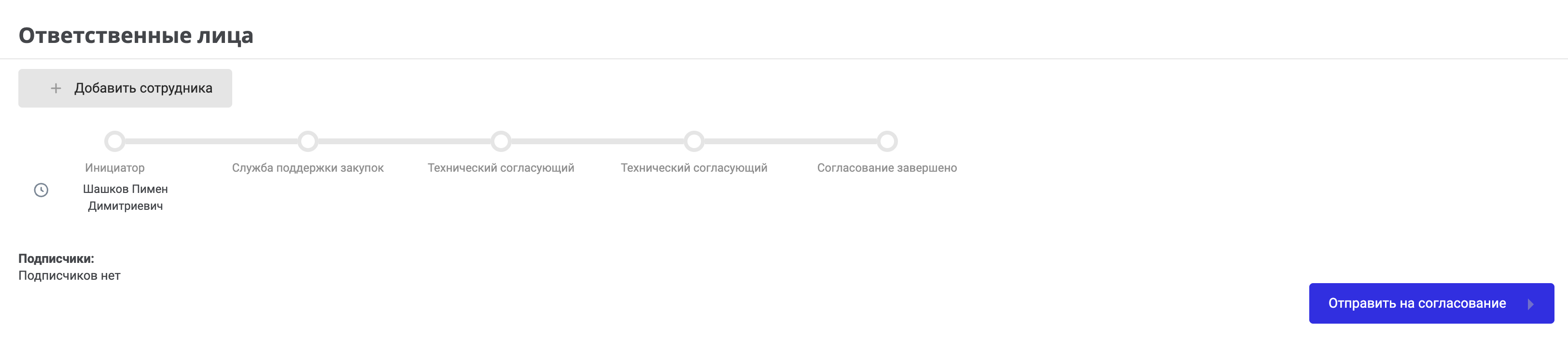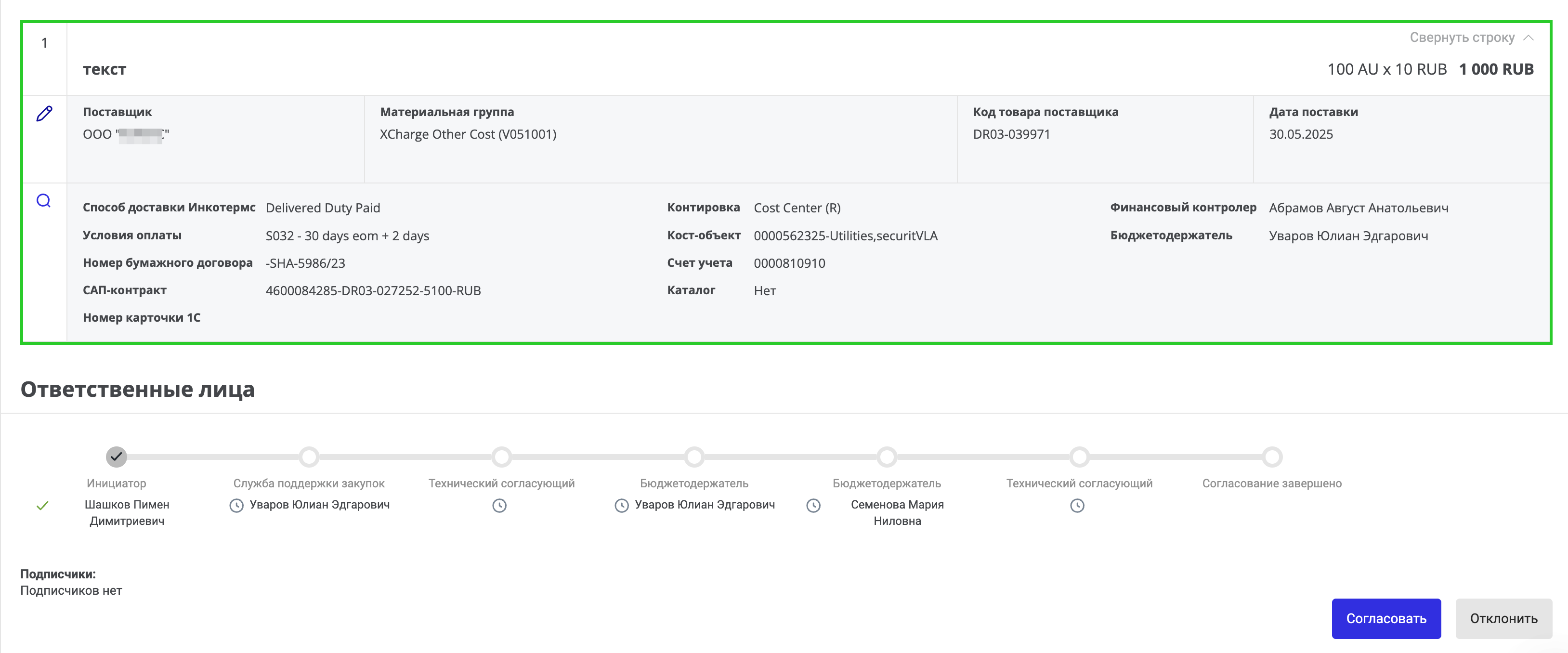 ИнициаторДанный этап согласуется автоматически после отправки заявки на согласование. Ответственным за данный этап является инициатор - пользователь, создавший заявку.