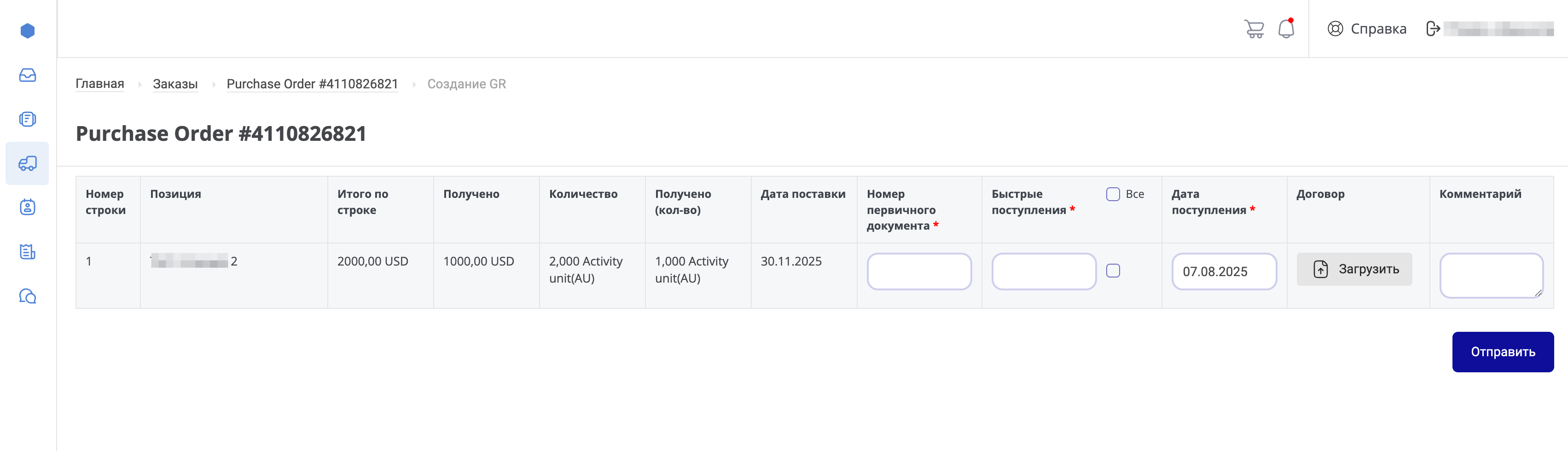 • После отправки поступления в ERP на платформу придёт номер документа из ERP.
