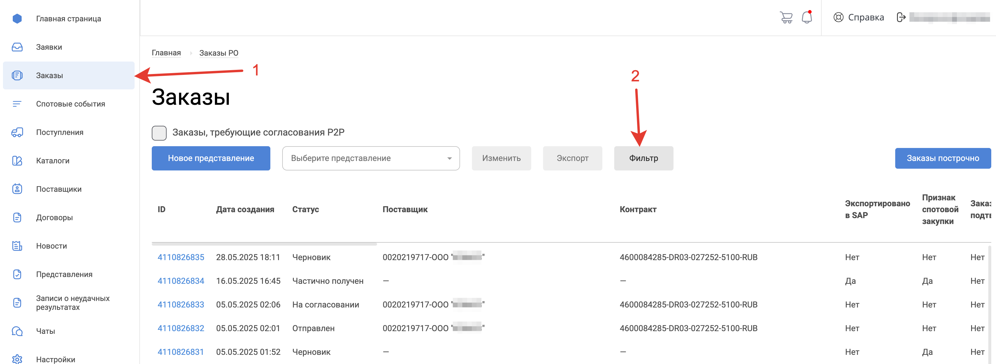 1. Перейти в желаемый раздел через главное меню портала (на примере раздела Заказы)