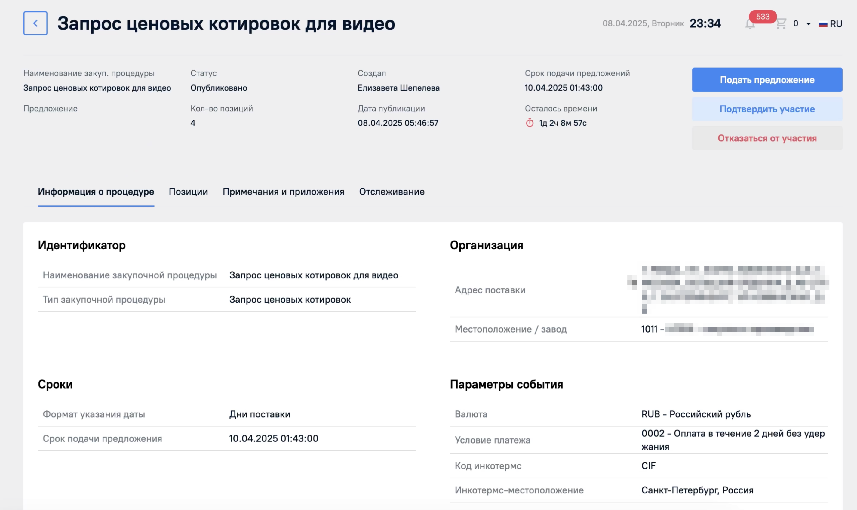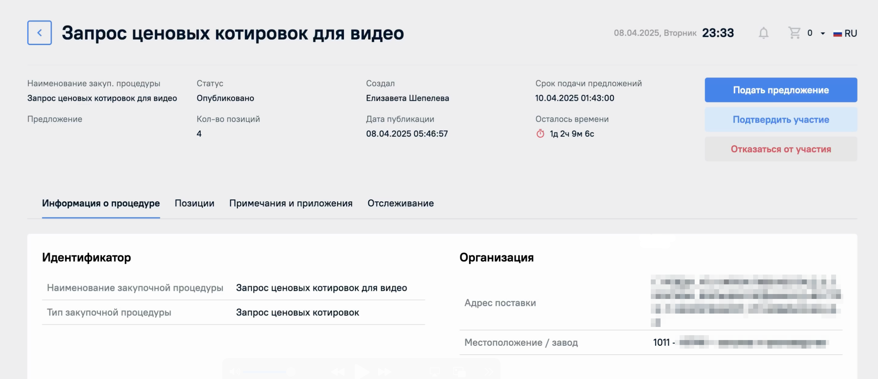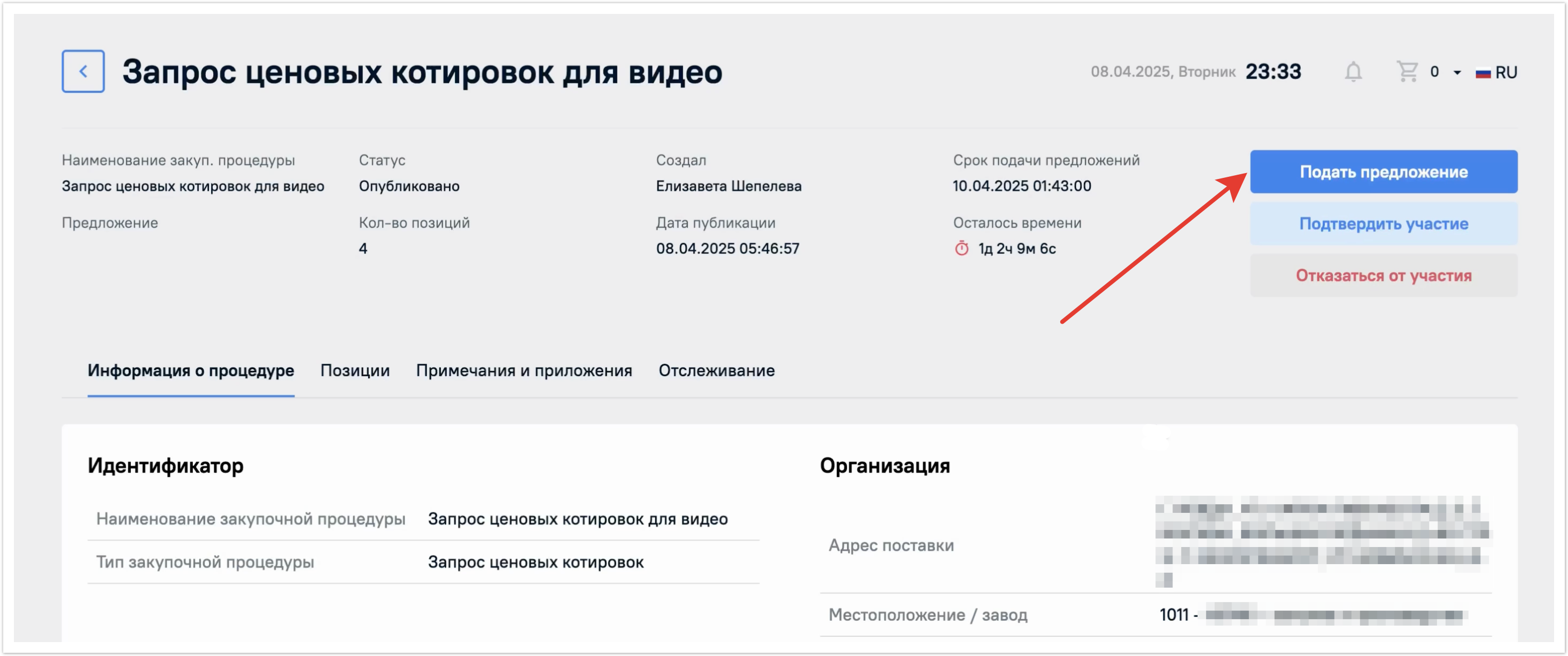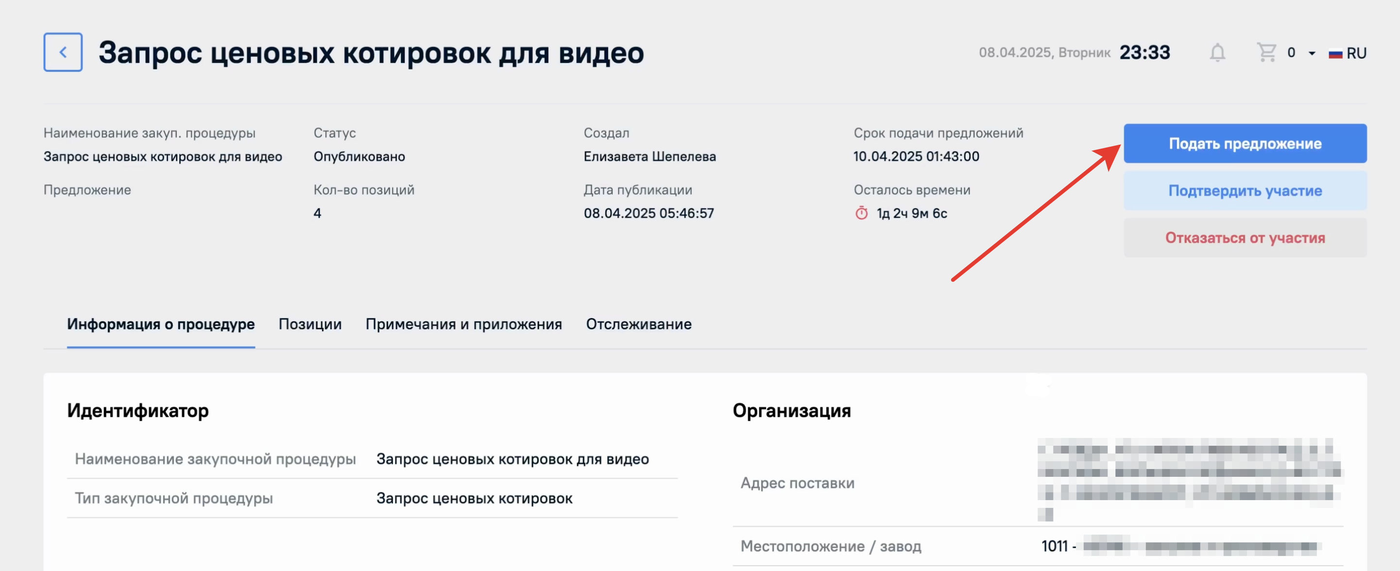- Срок подачи предложения - дата и время до которой нужно сделать предложения.