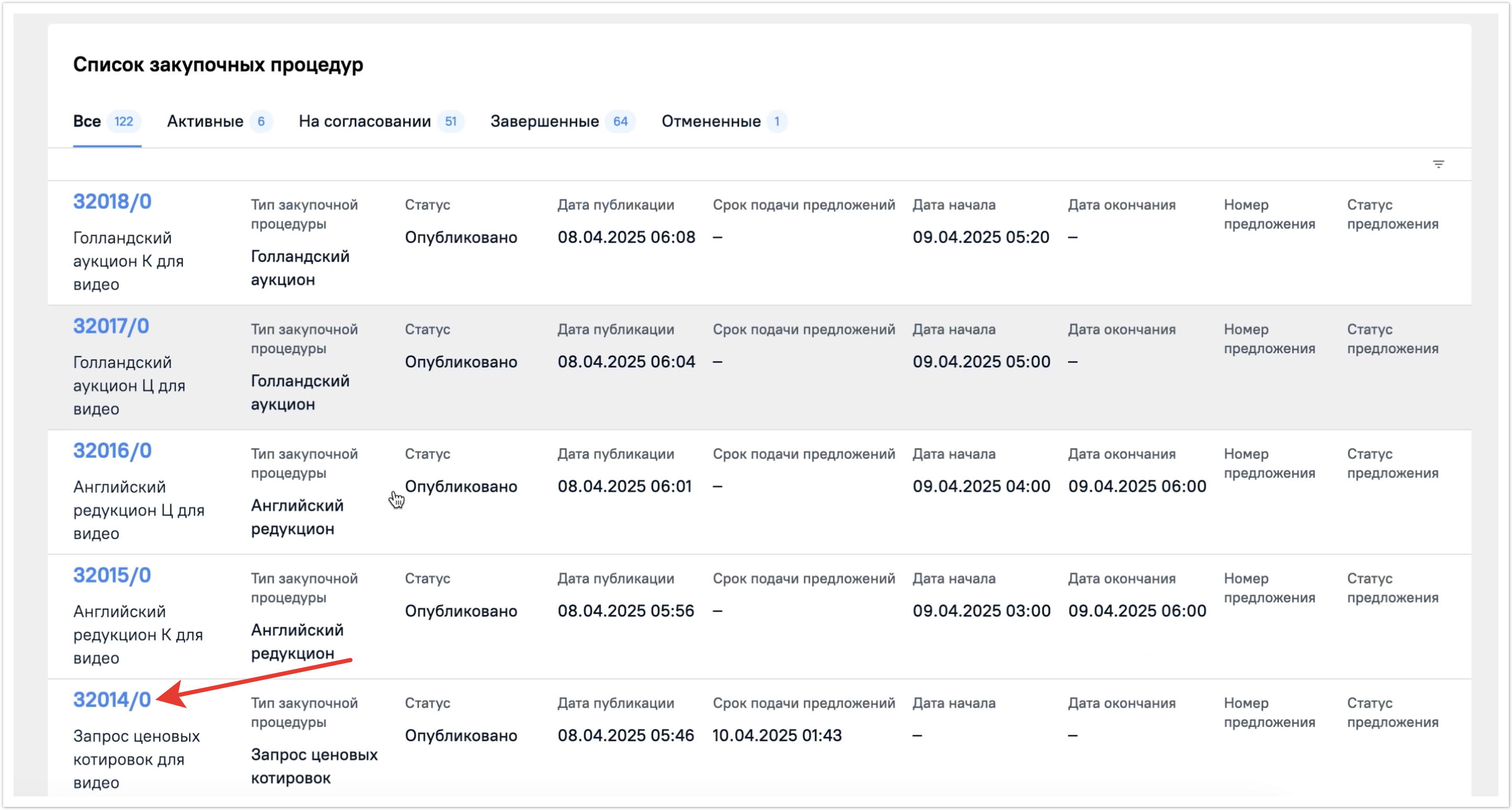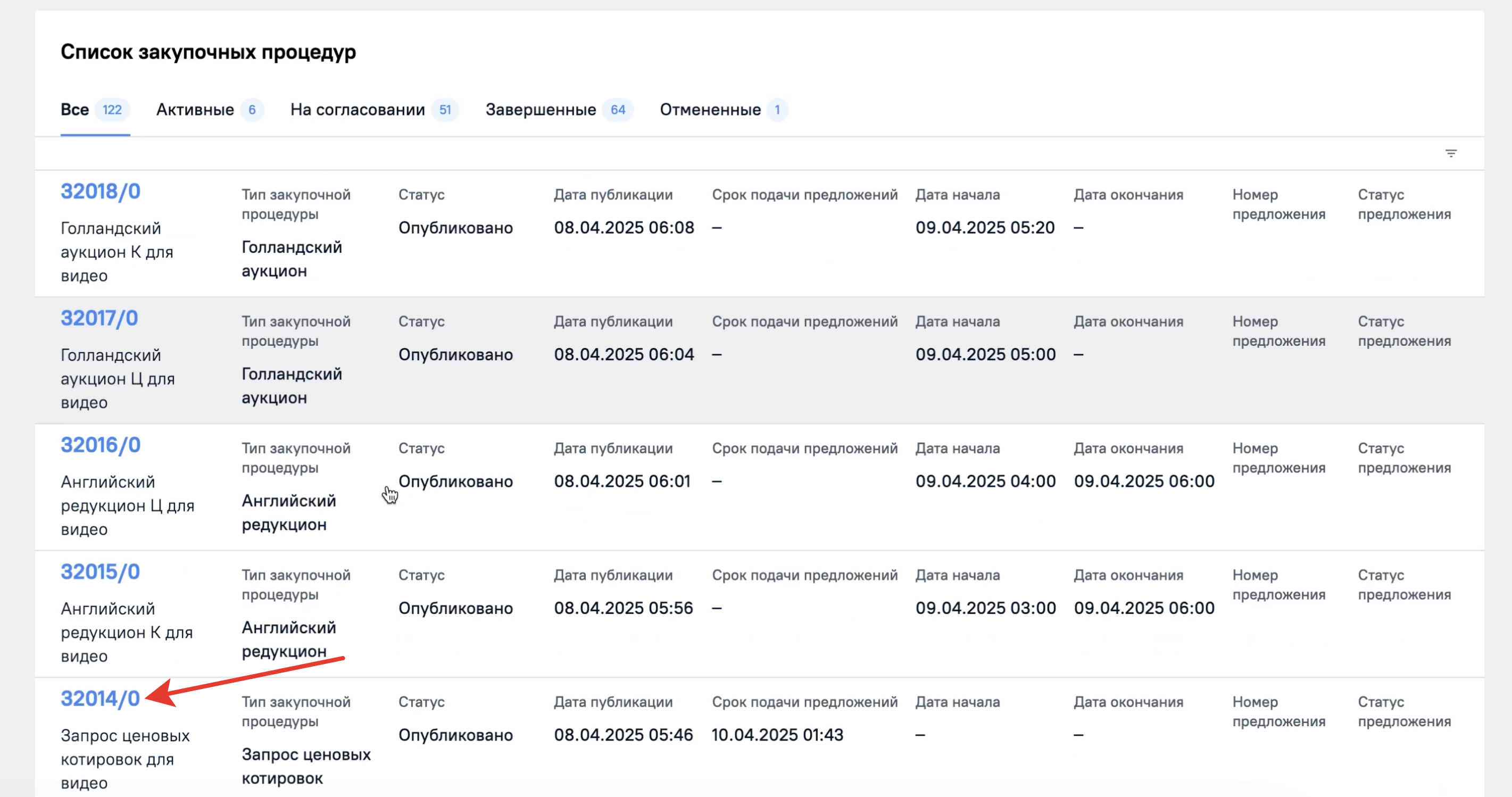 В разделе Мои процедуры будут отображены все закупочные процедуры, но их можно фильтровать по вкладкам Активные, На согласовании, Завершенные, Отмененные.