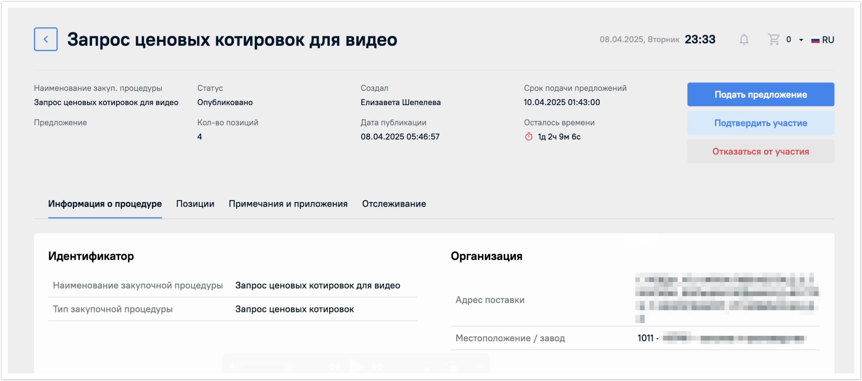 В верхней части страницы будет указана основная информация по закупочной процедуре: