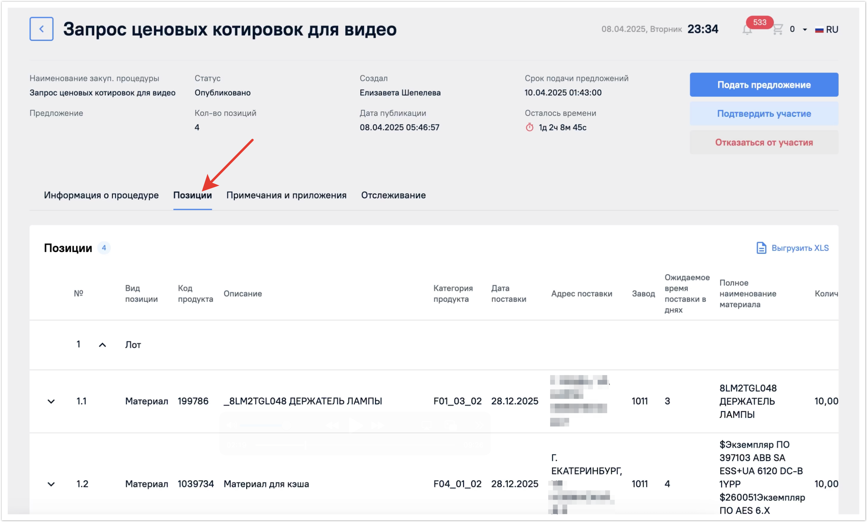 Следующая вкладка Позиции. Здесь можно ознакомиться с позициями, которые участвуют в закупочной процедуре и посмотреть комментарии к ним.