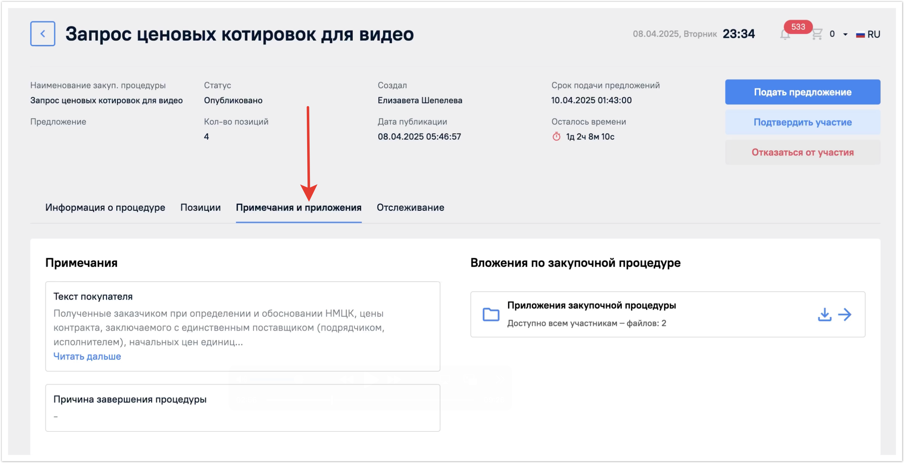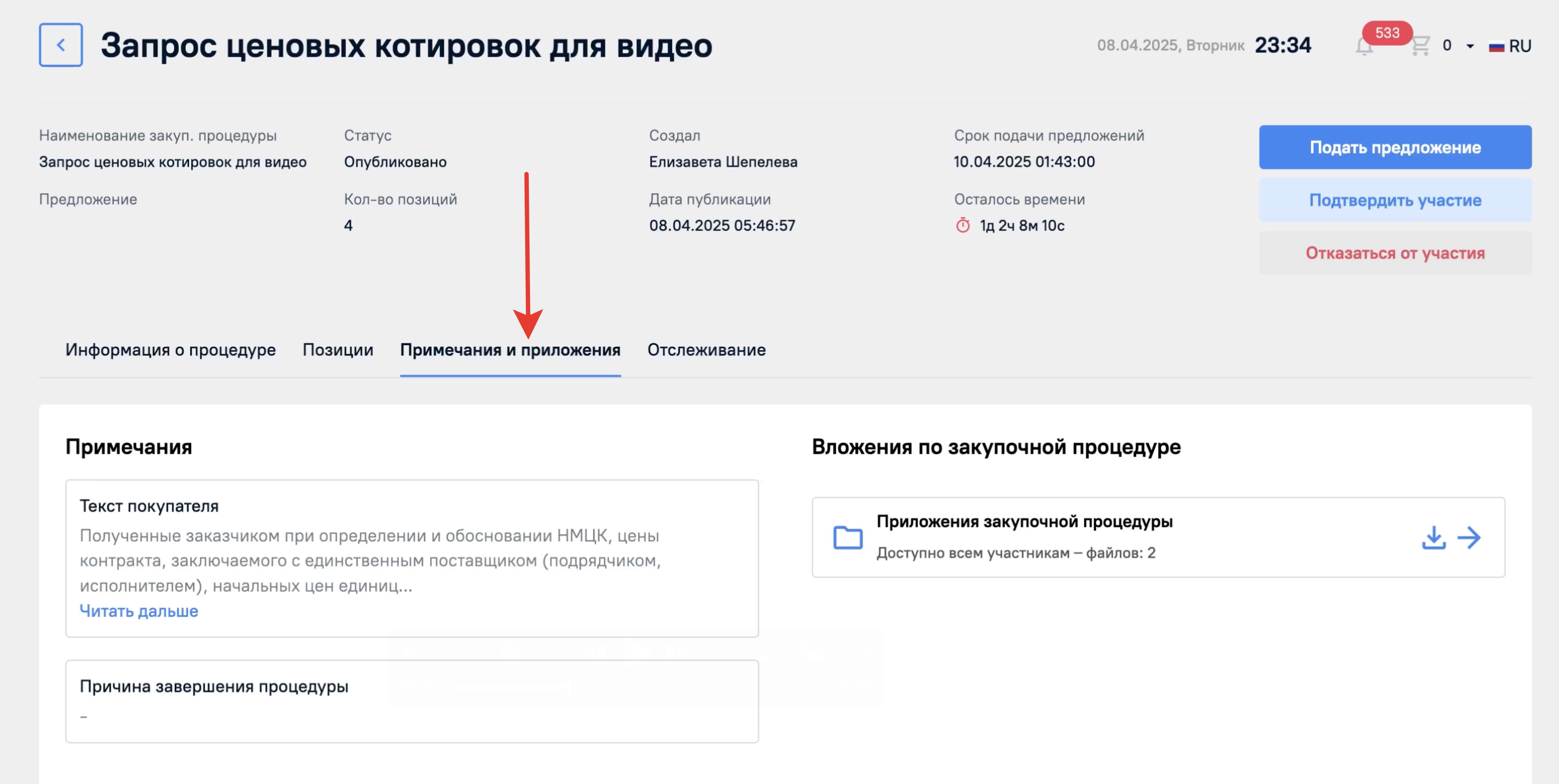Следующая вкладка Примечания и приложения, здесь можно ознакомиться с комментариями к закупочной процедуре, оставленными организатором. А также просмотреть вложения по закупочной процедуре.