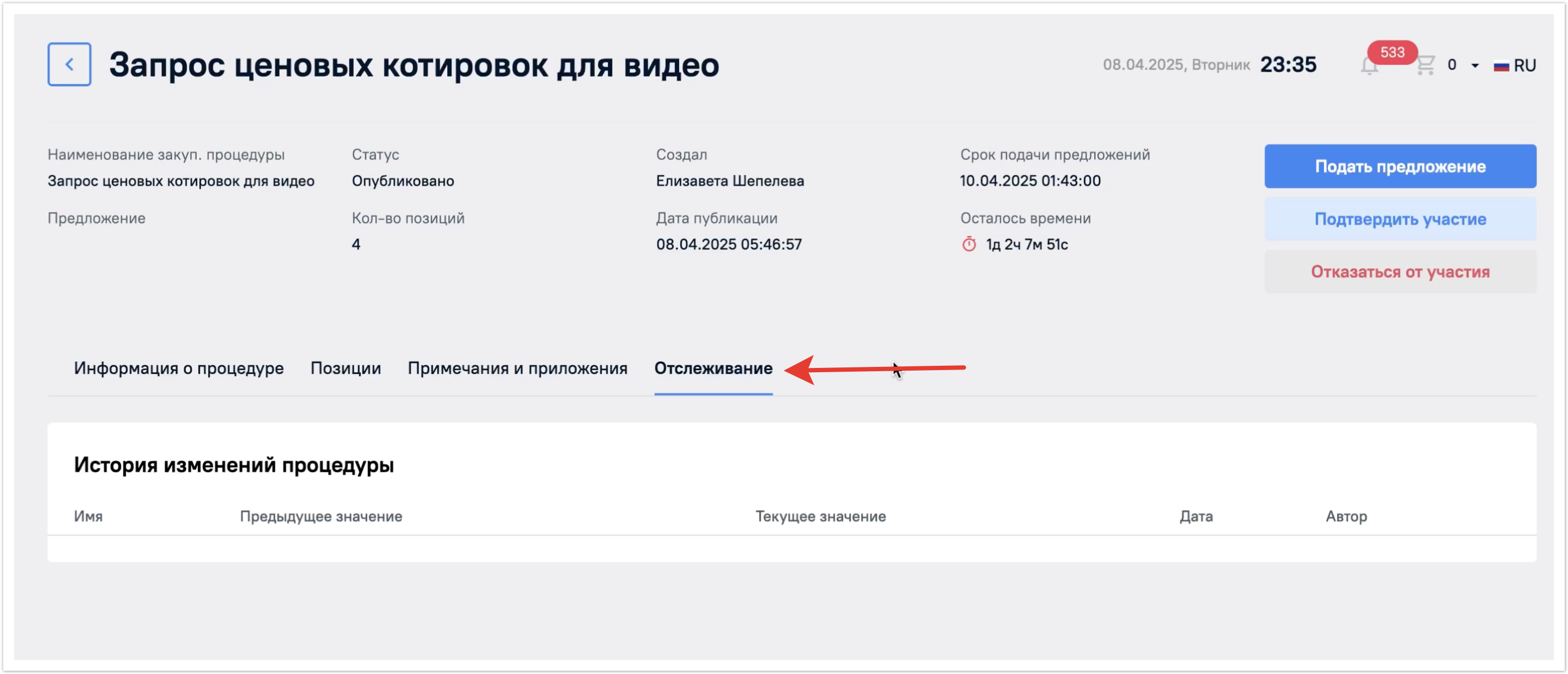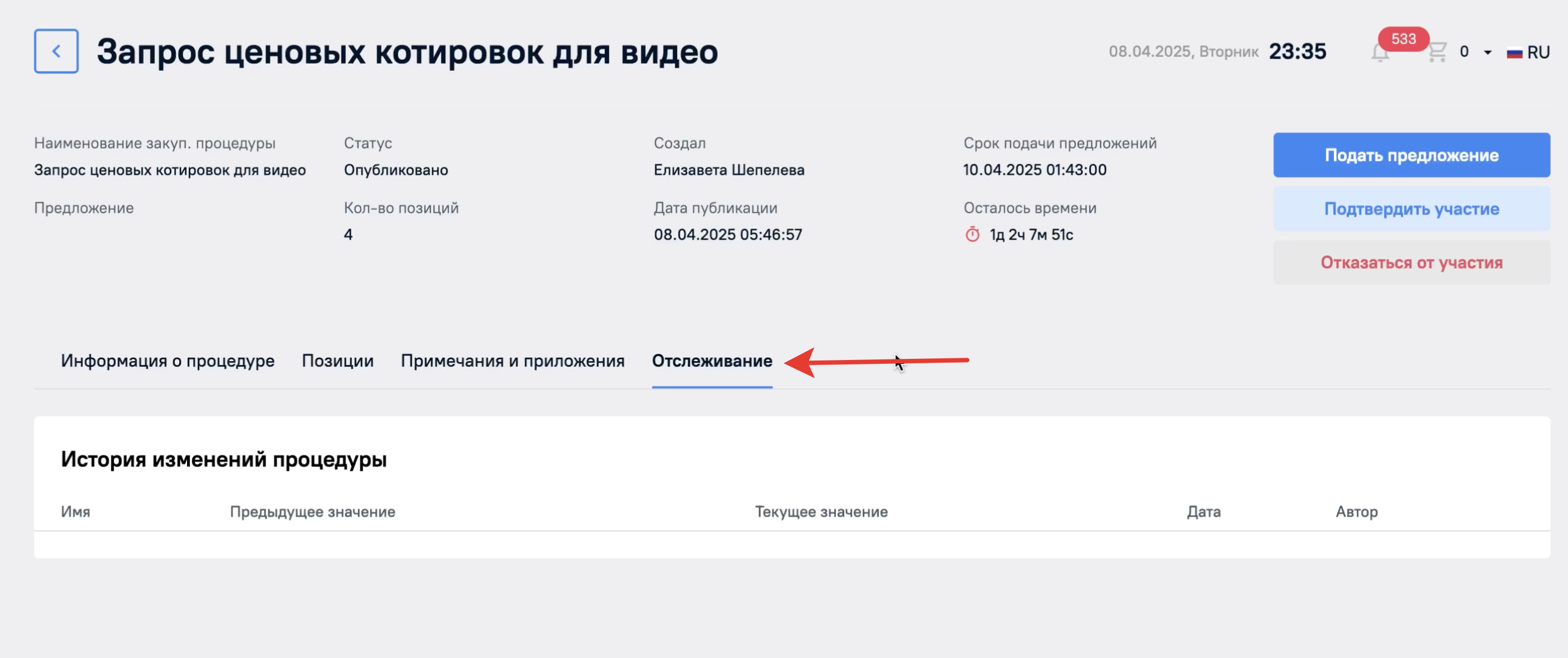 Последняя вкладка в закупочной процедуре Отслеживание. Здесь будет отображаться информация по изменению процедуры закупщиком и движение закупки по статусам.