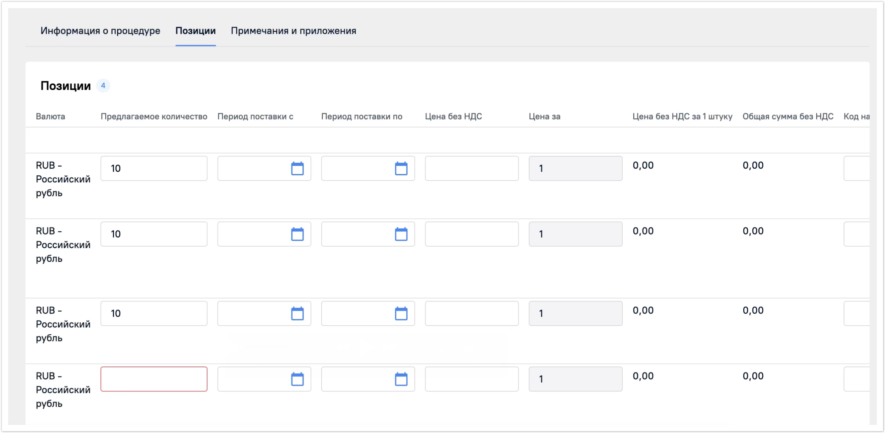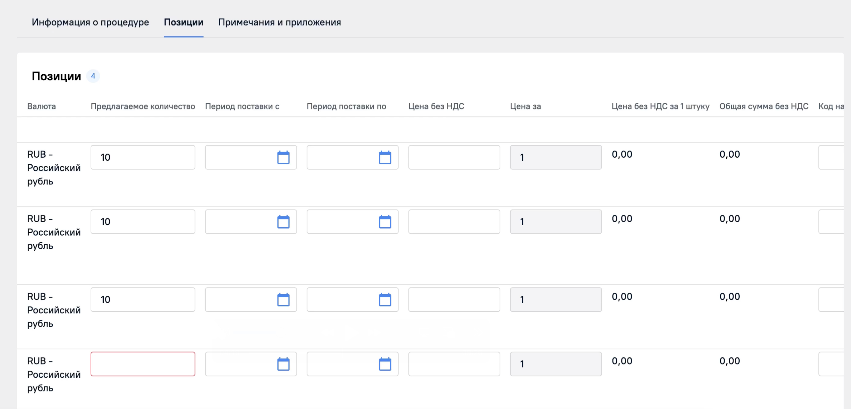- Кол-во позиций - количество позиций в закупочной процедуре;