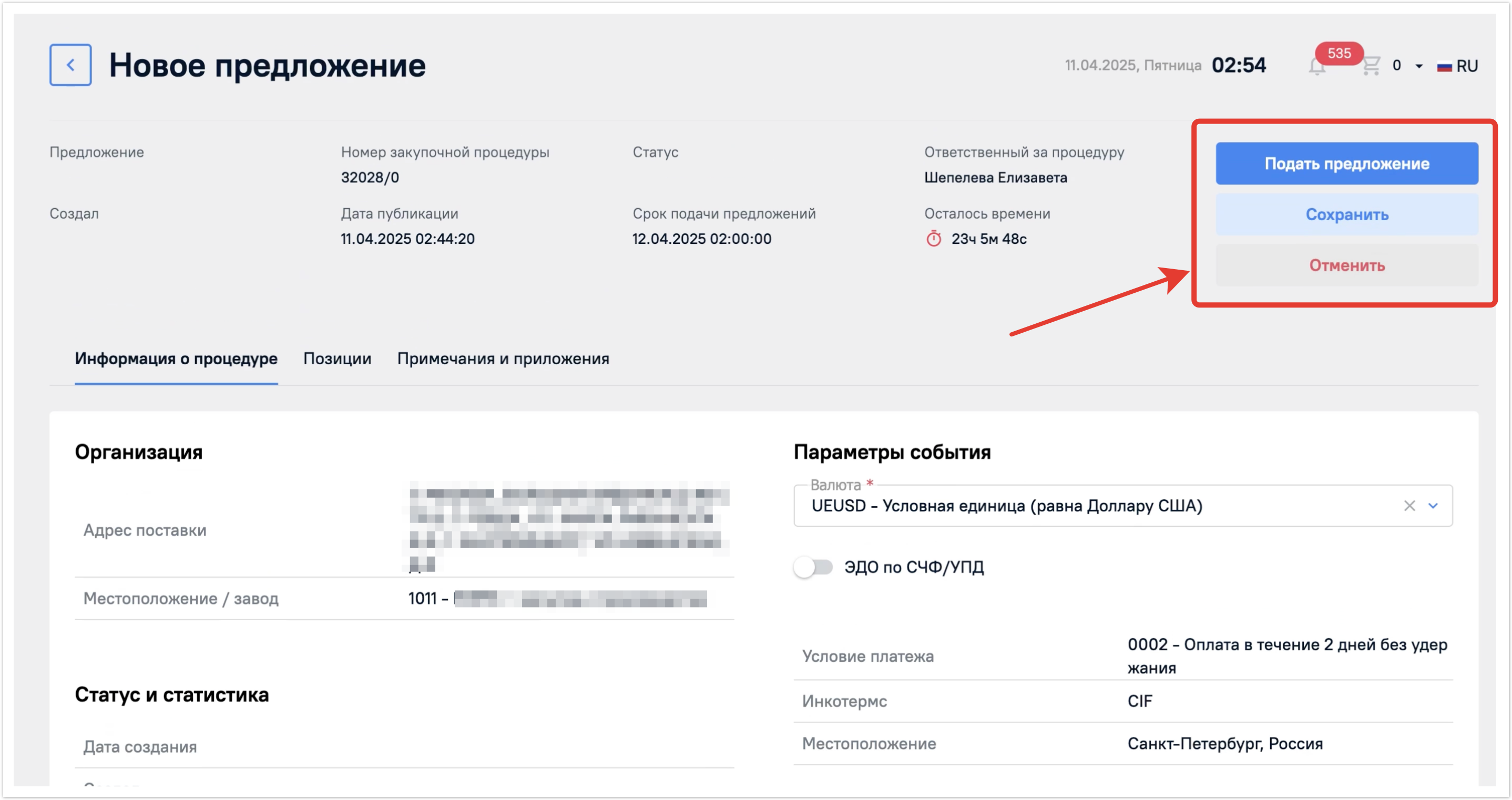 Для участия в закупочной процедуре нужно нажать на кнопку Подать предложение. Откроется форма для подачи нового предложения.