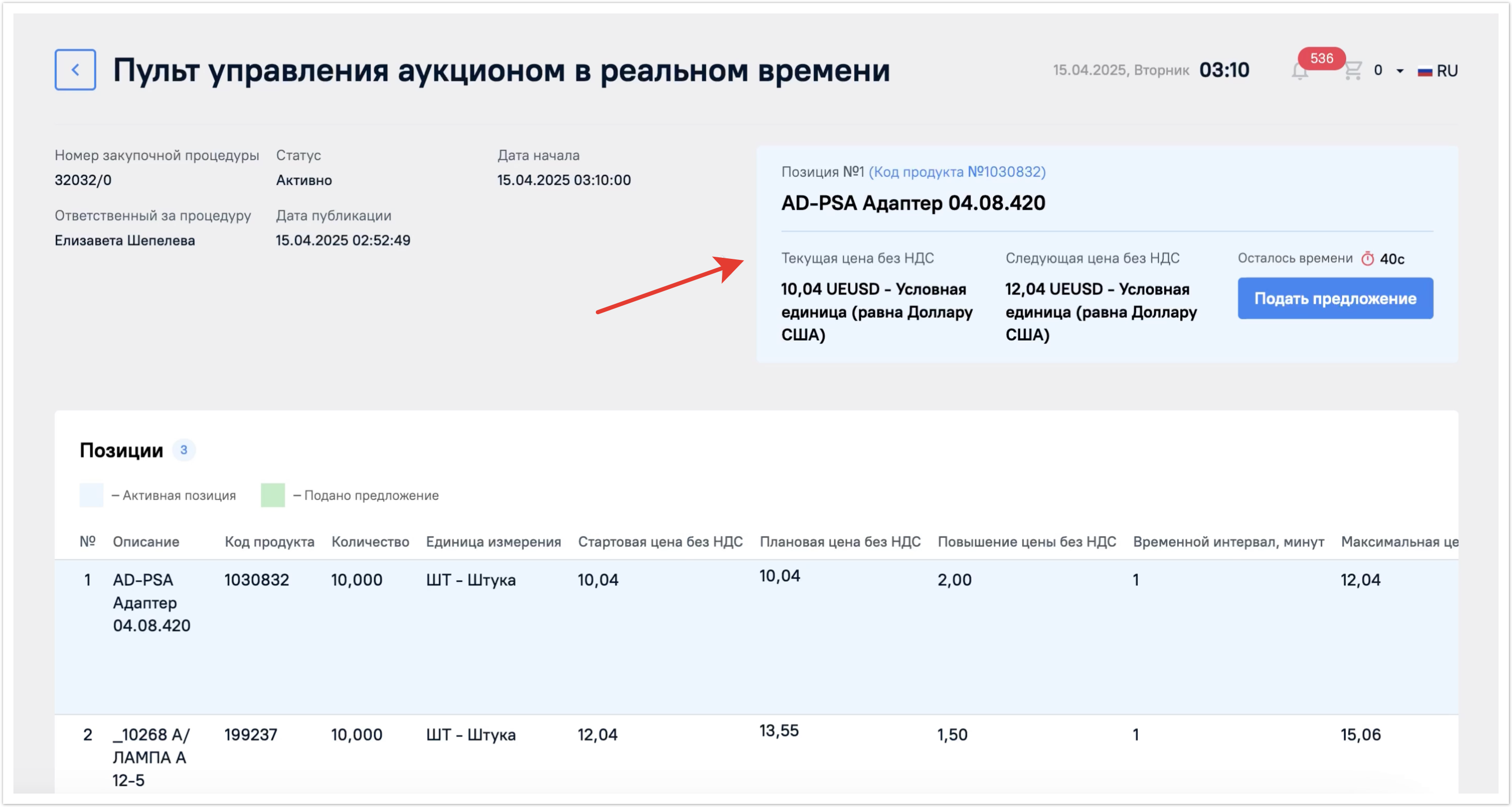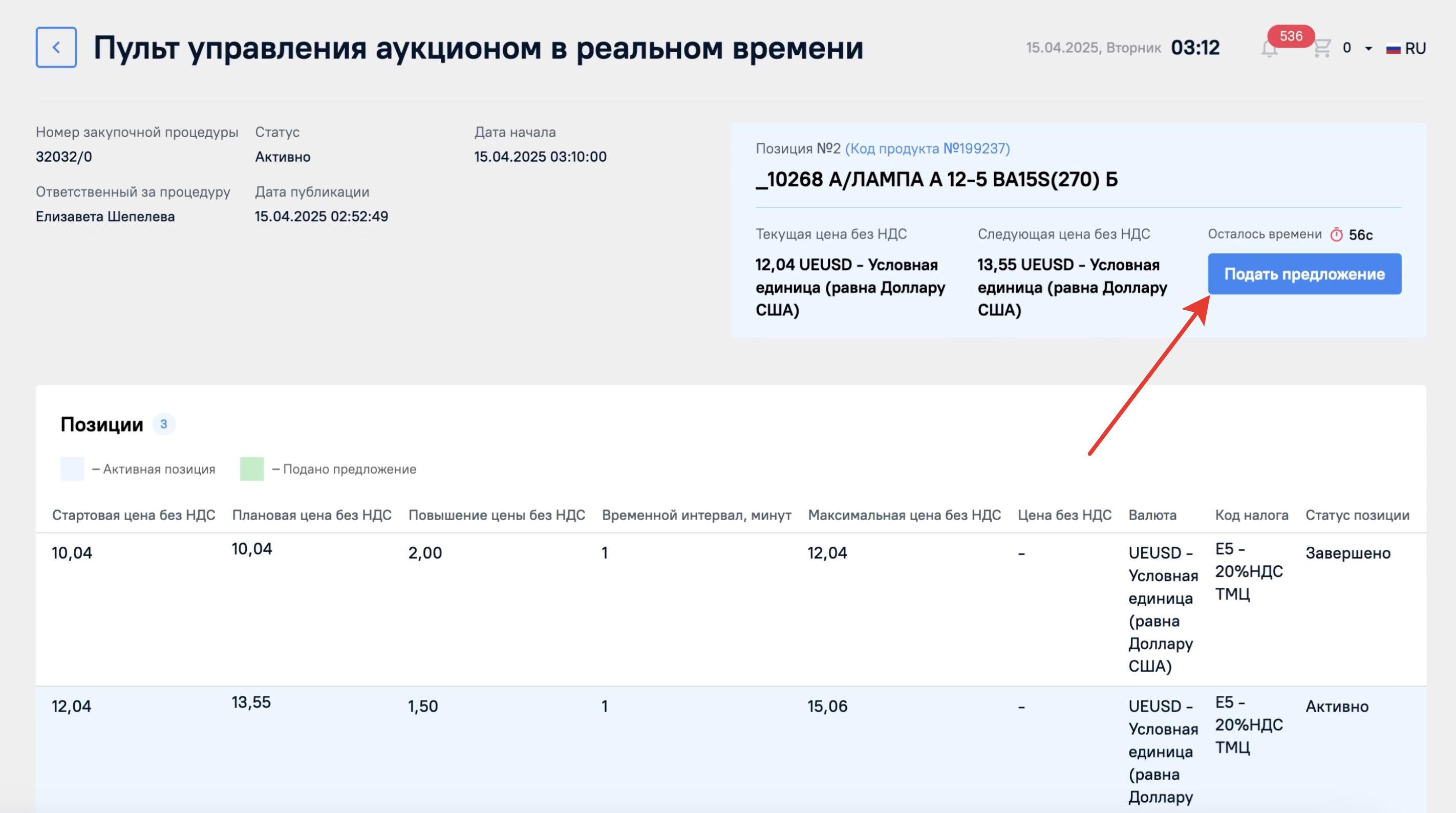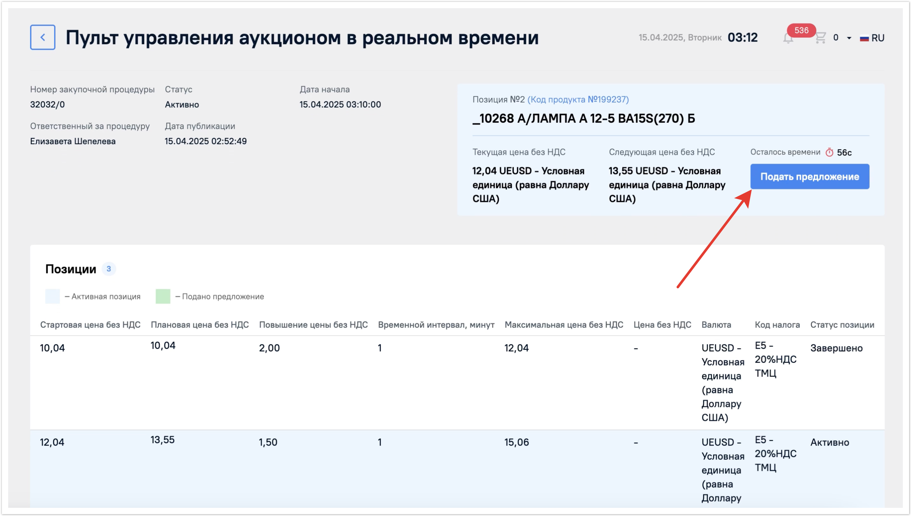 В поле Предложение будет указан номер вашего предложения после завершения аукциона, поэтому пока это поле останется пустым.