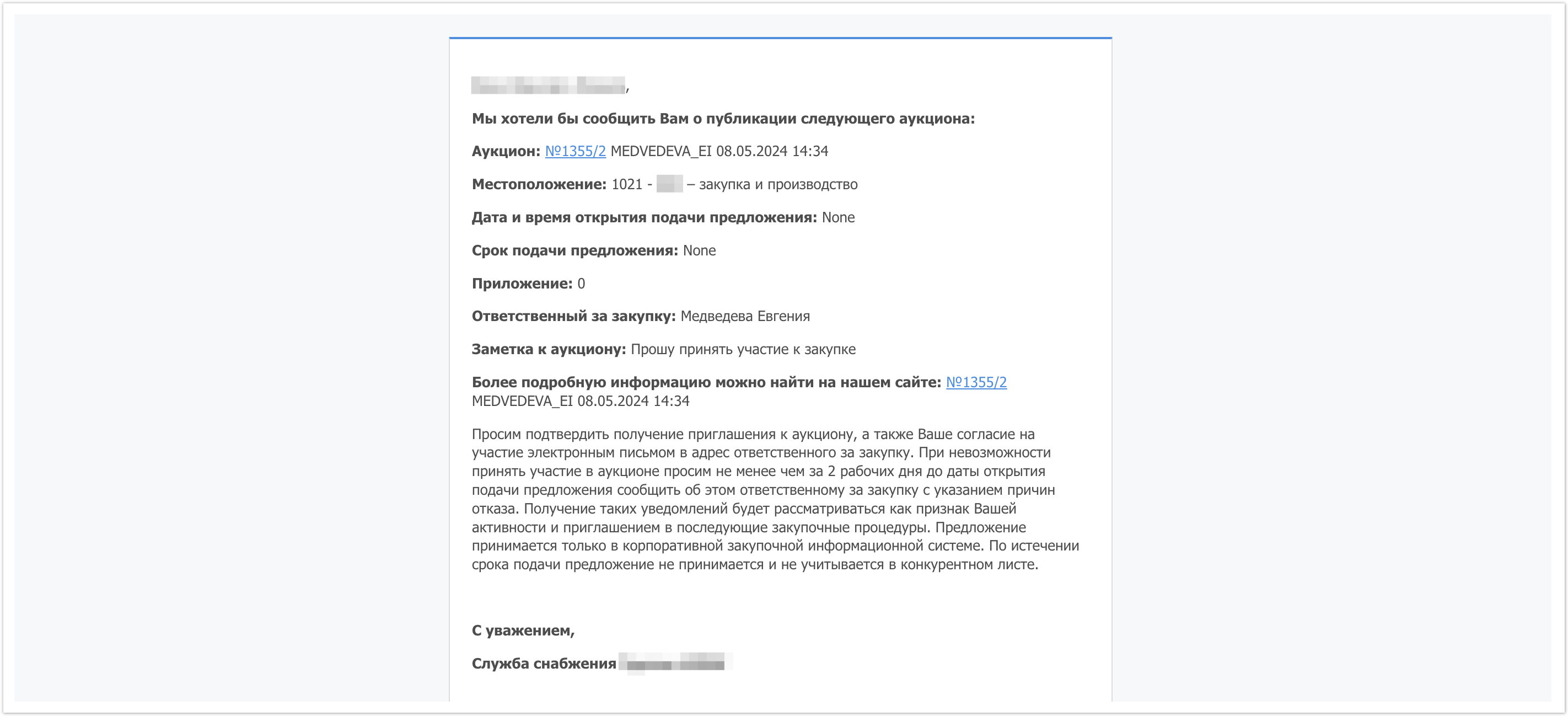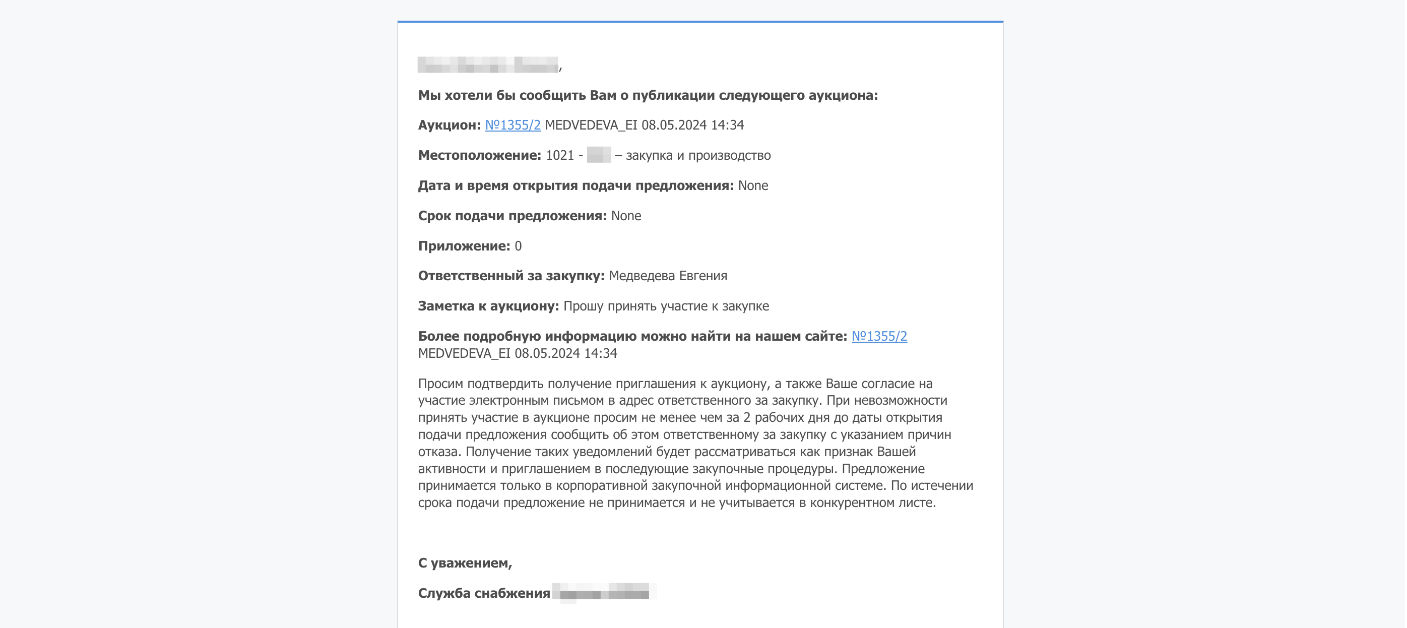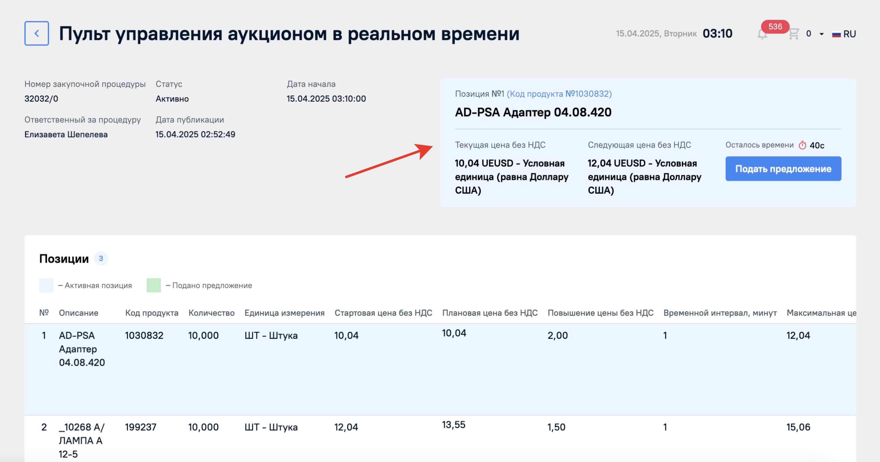 В поле Предложение будет указан номер вашего предложения после завершения аукциона, поэтому пока это поле останется пустым.