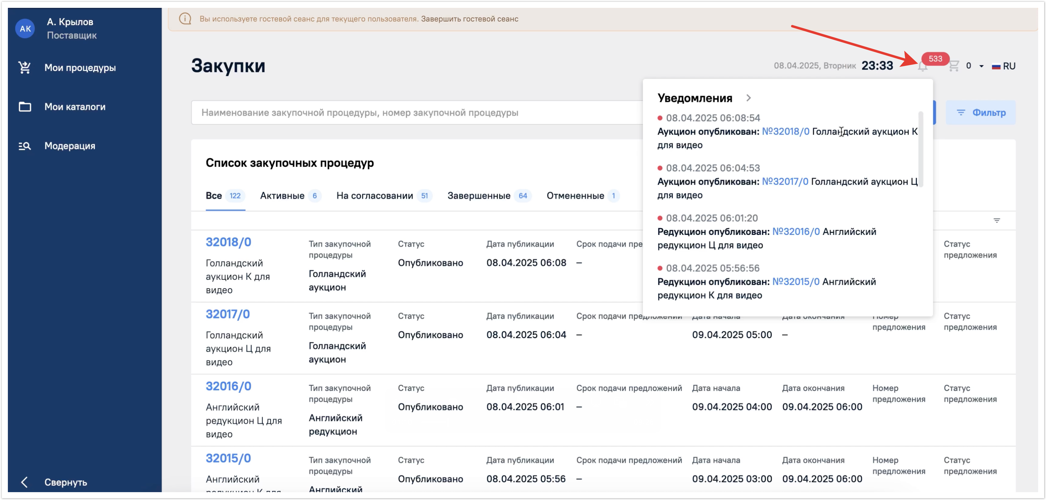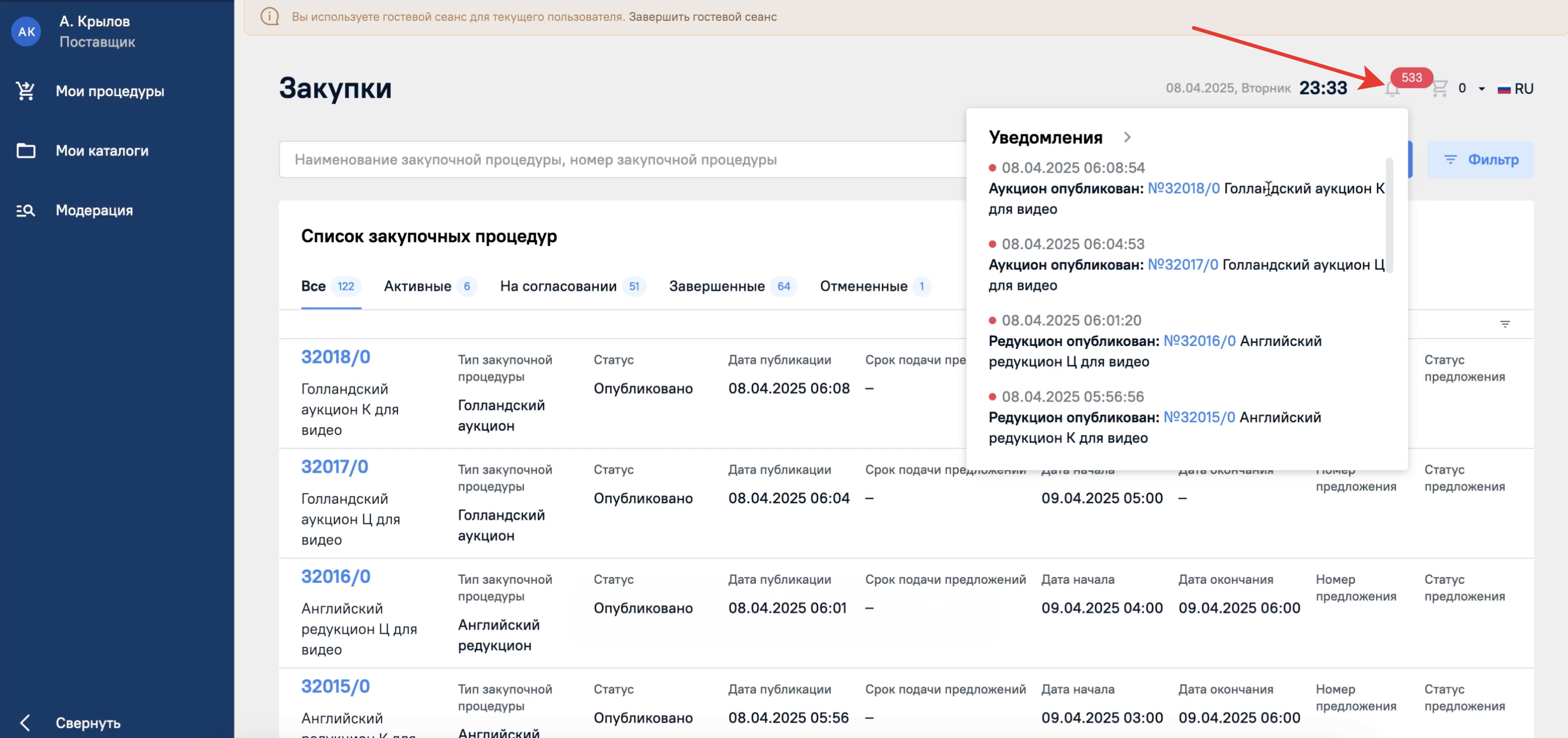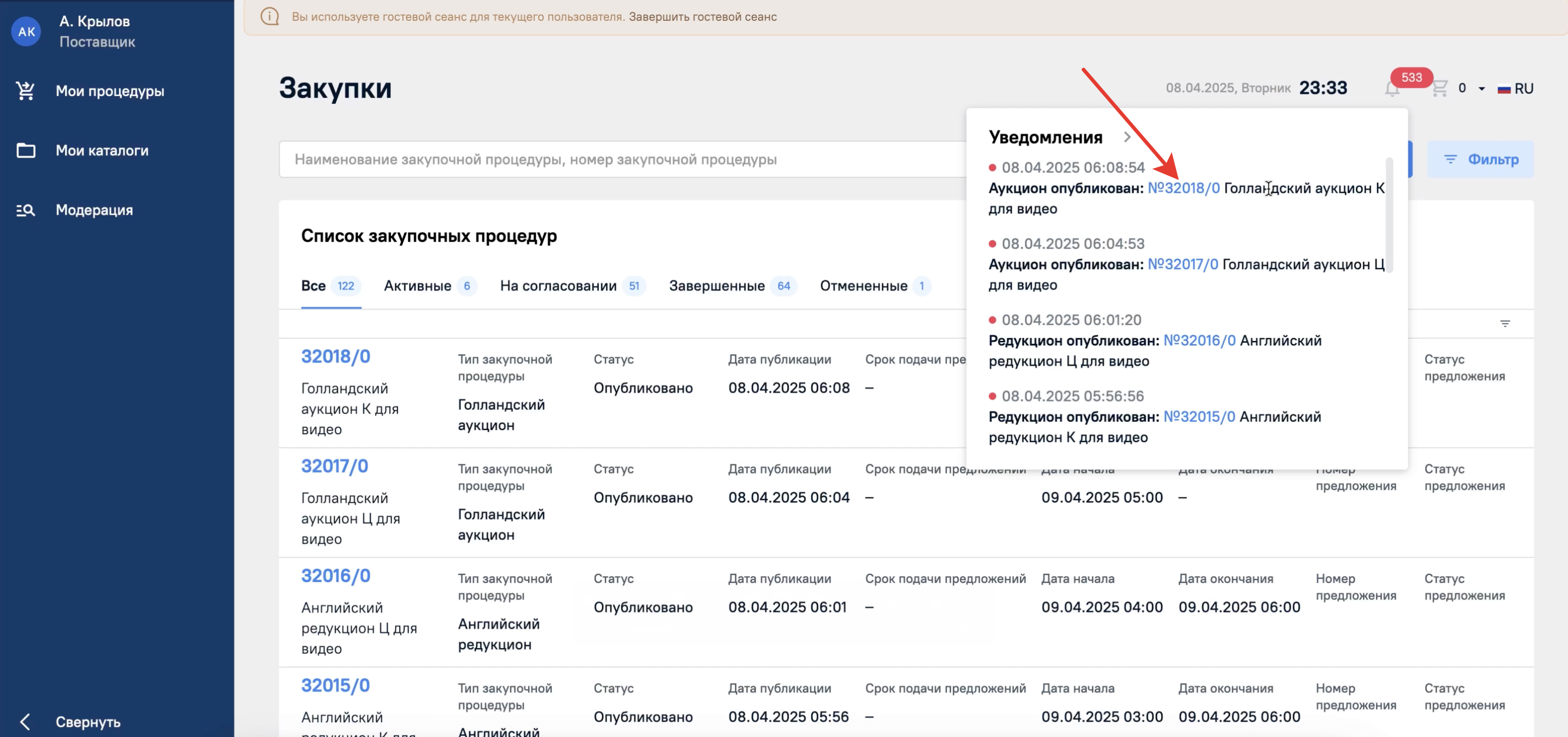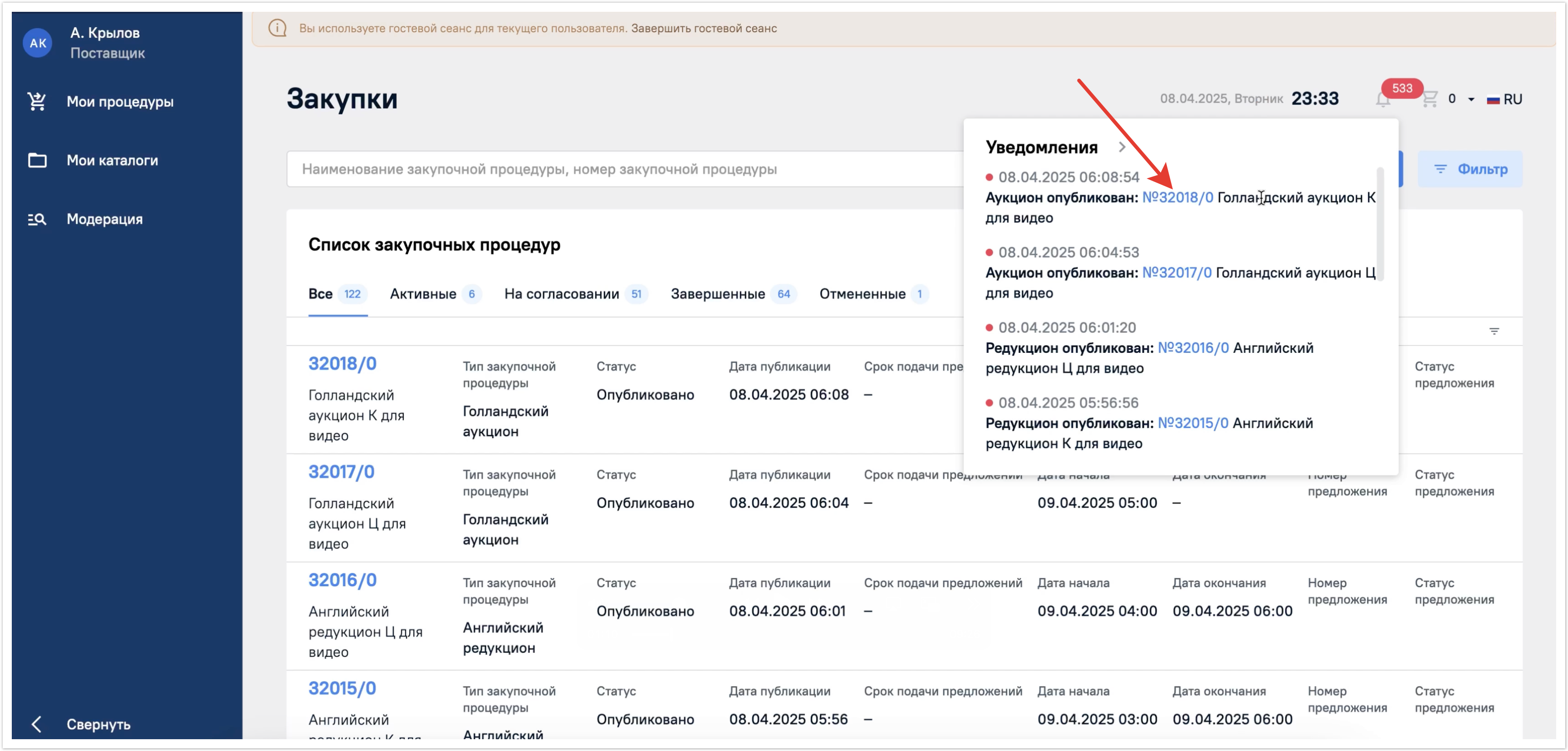 Из уведомления можно перейти сразу в нужную процедуру. Для этого достаточно нажать на ссылку с ее номером.