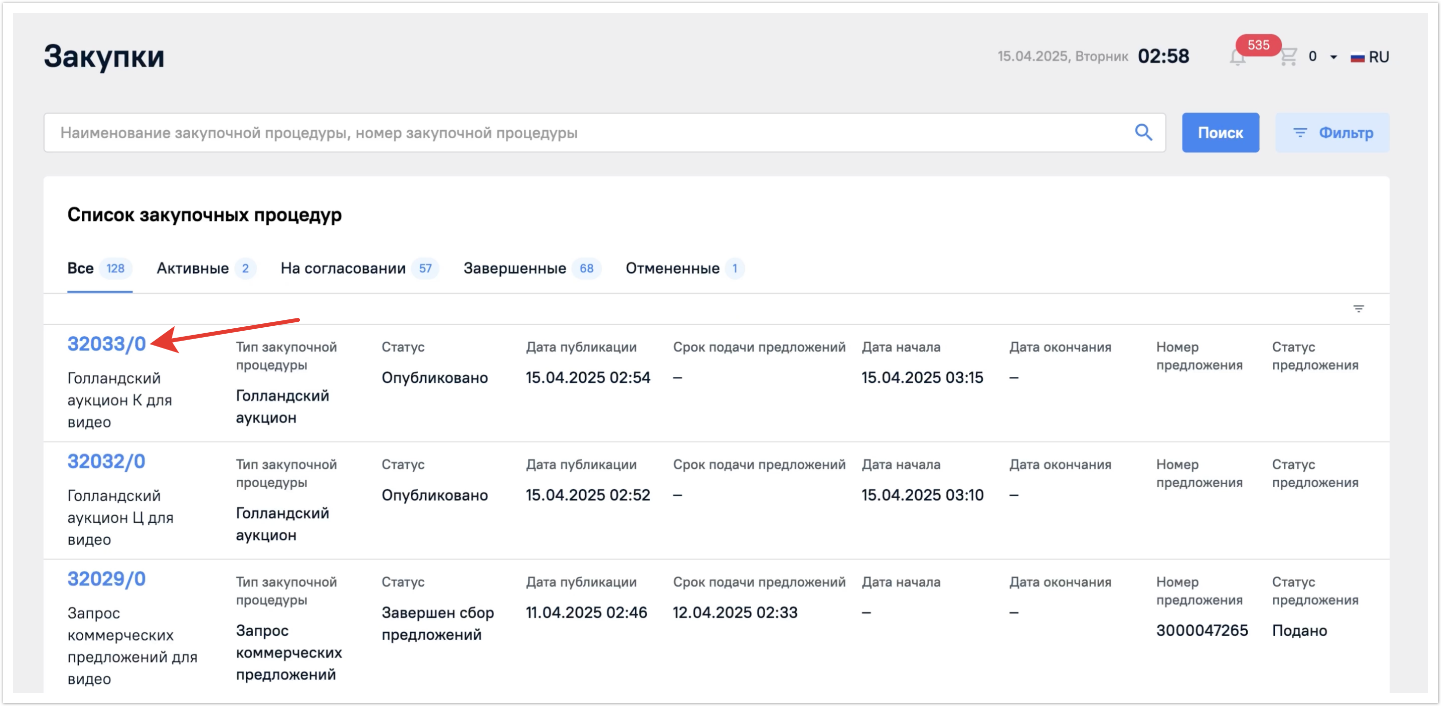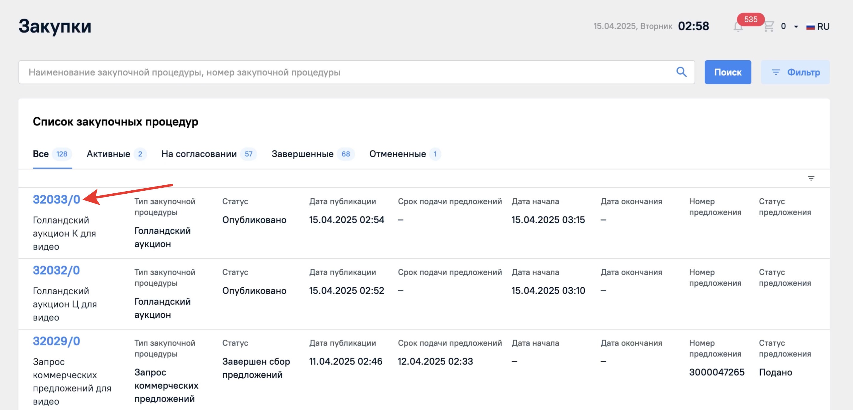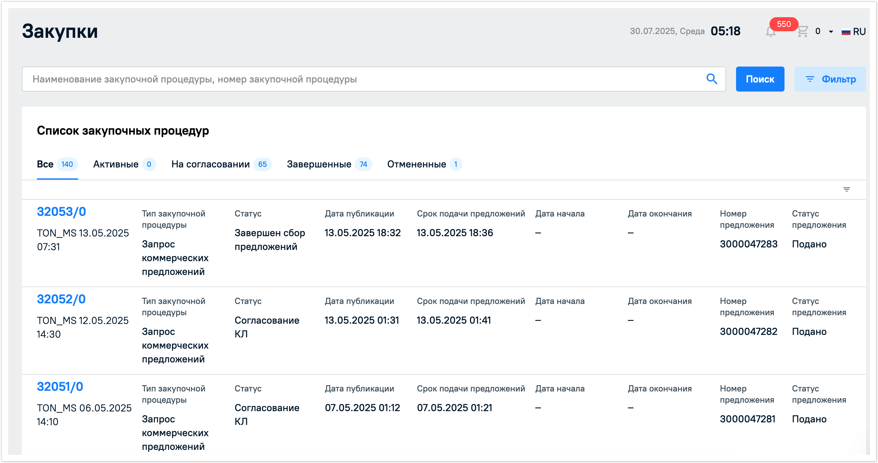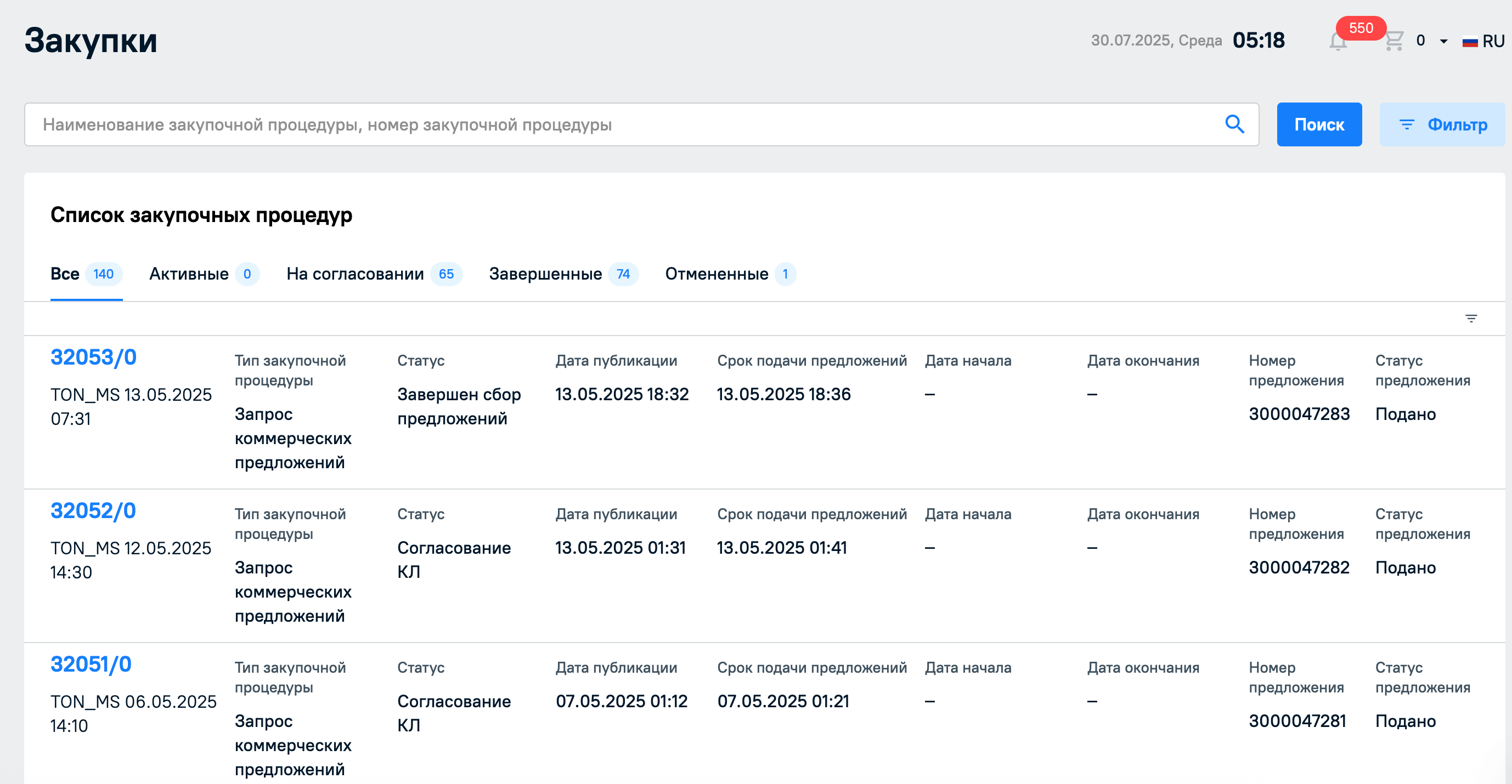 В разделе Мои процедуры будут отображены все закупочные процедуры, но их можно фильтровать по вкладкам Активные, На согласовании, Завершенные, Отмененные.