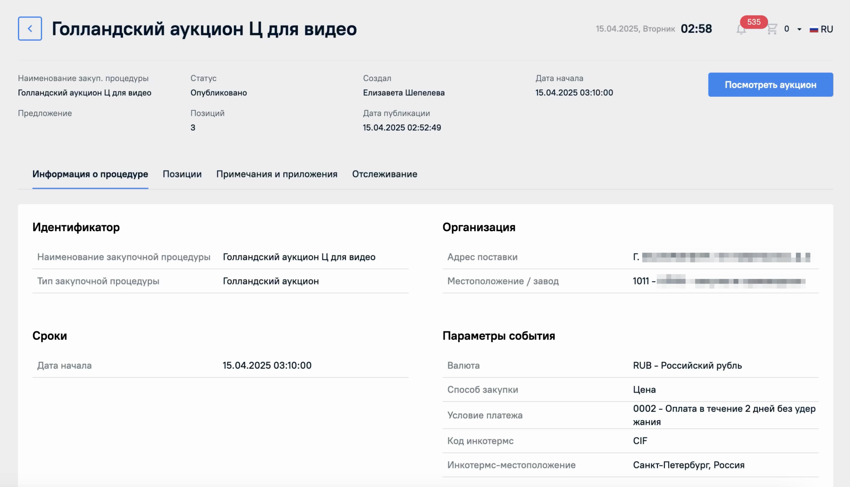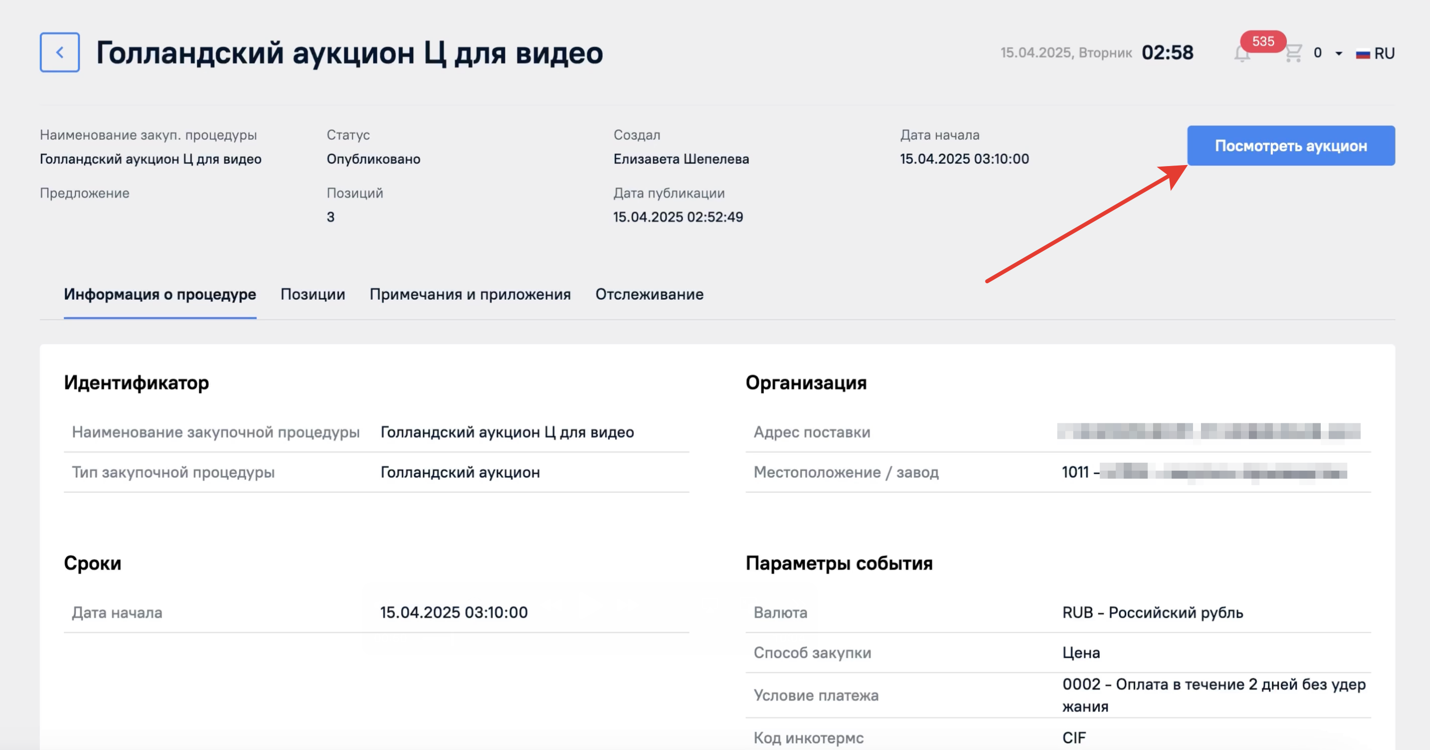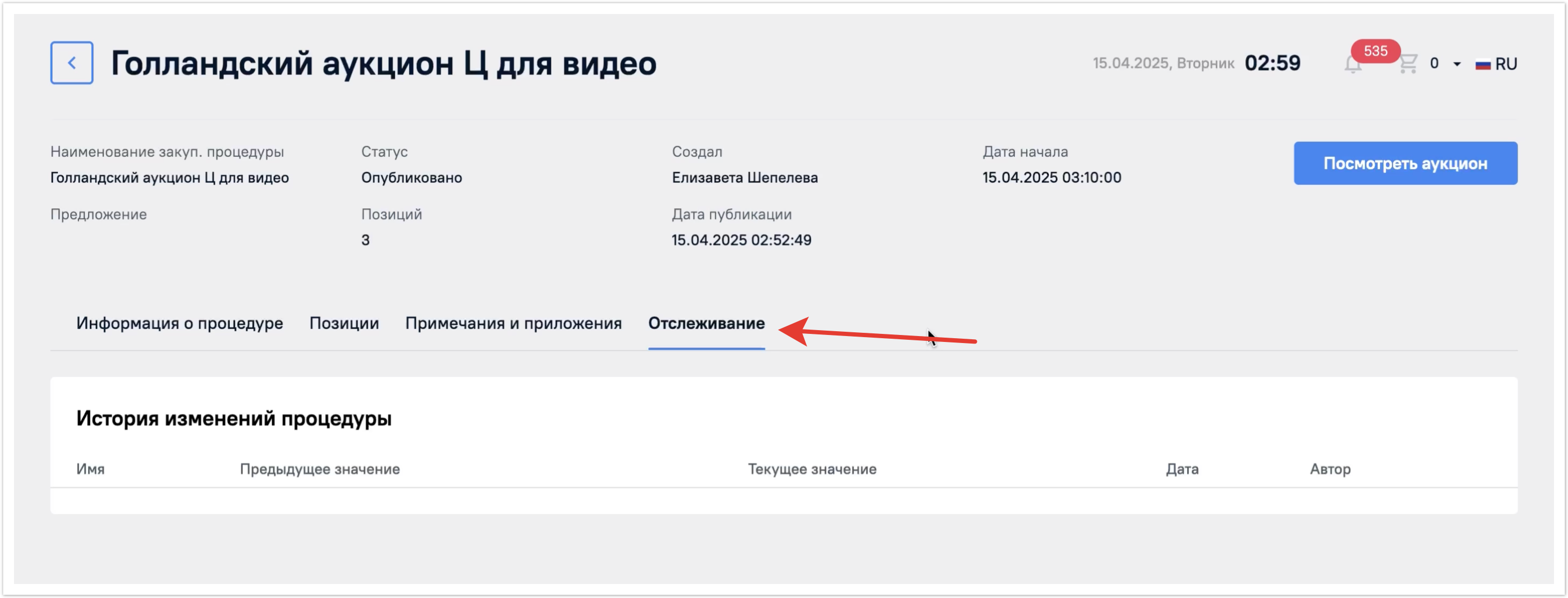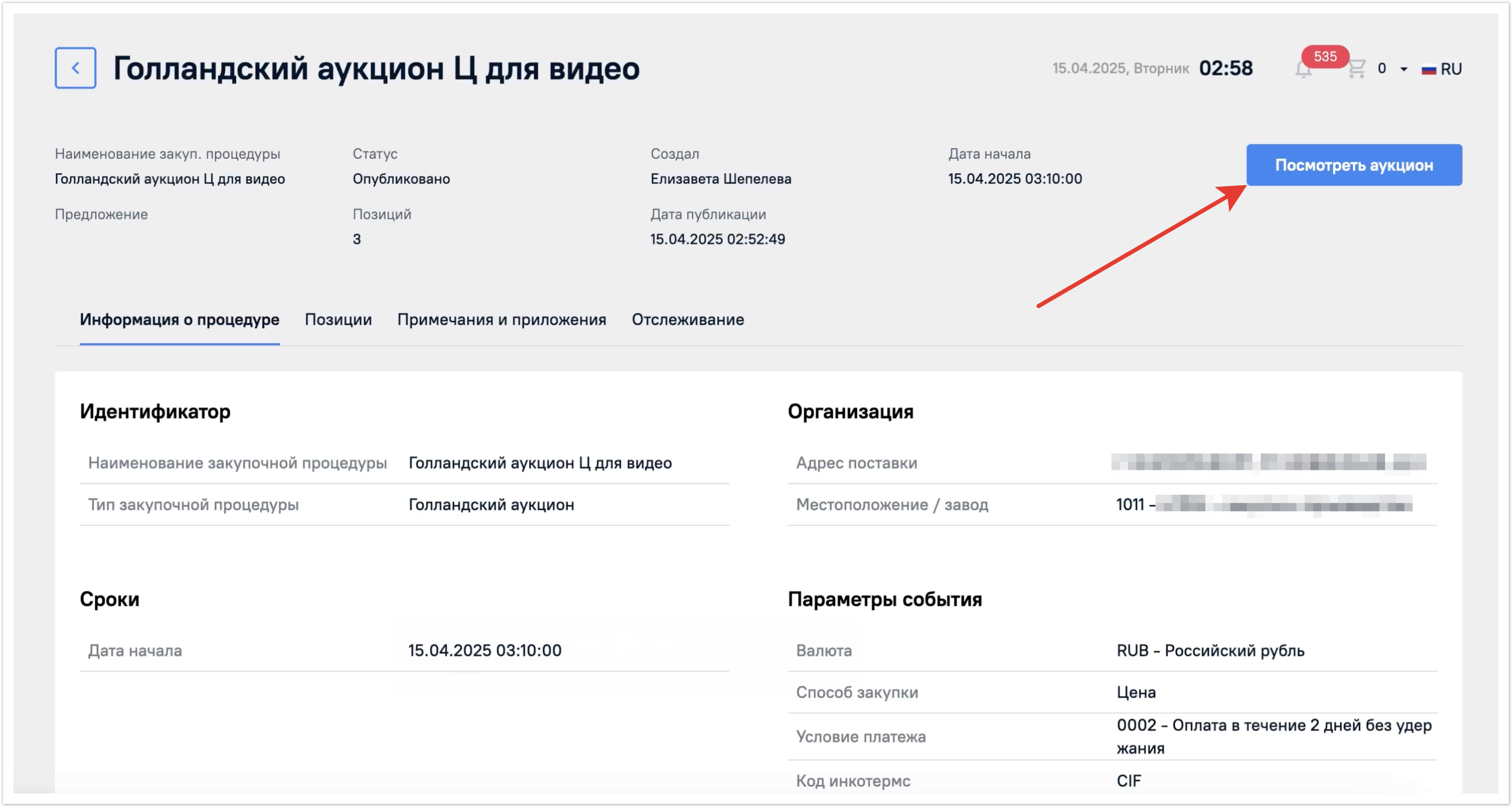 В статусе Опубликовано будет отображена кнопка Посмотреть аукцион. К ней мы вернемся далее.