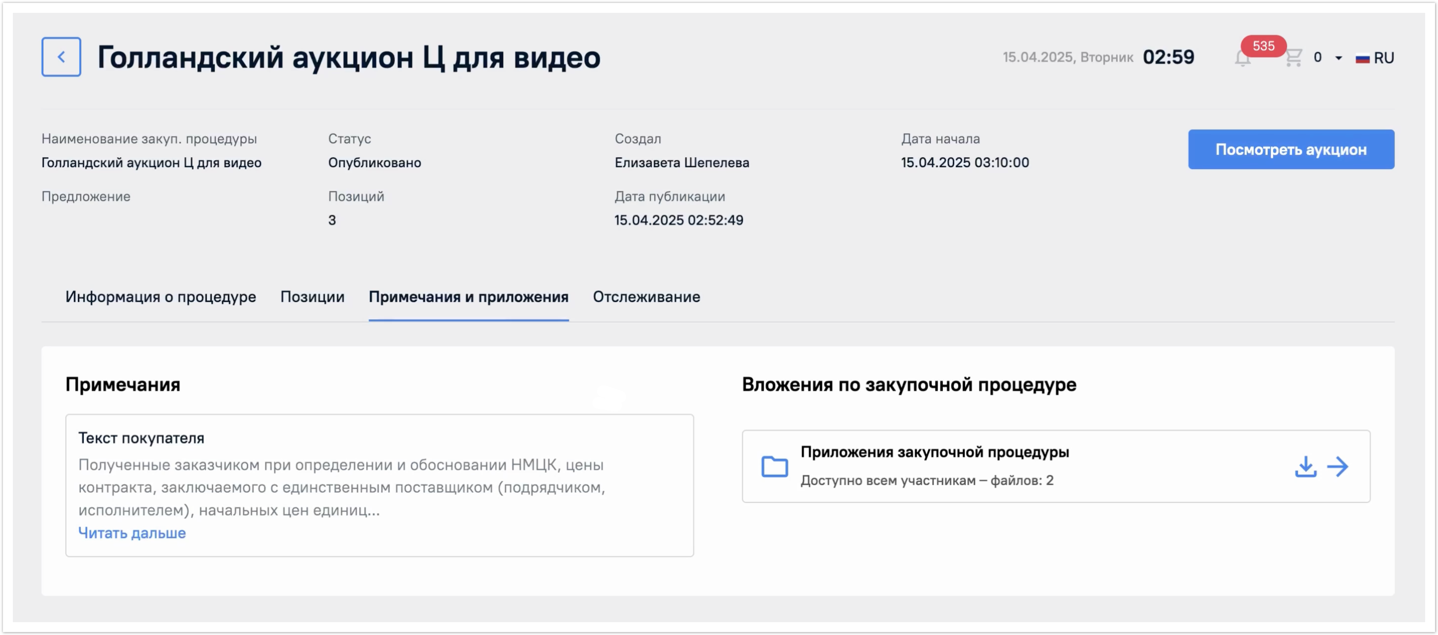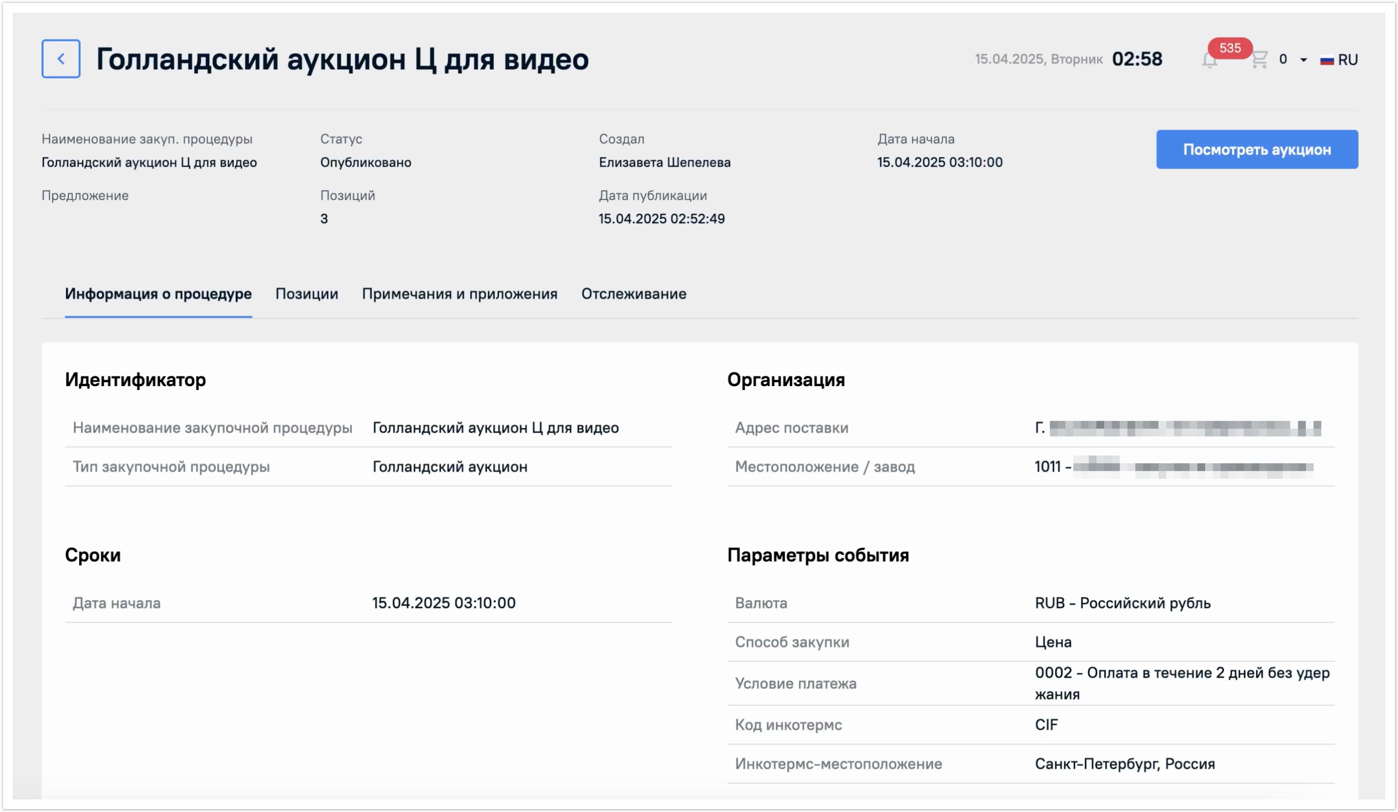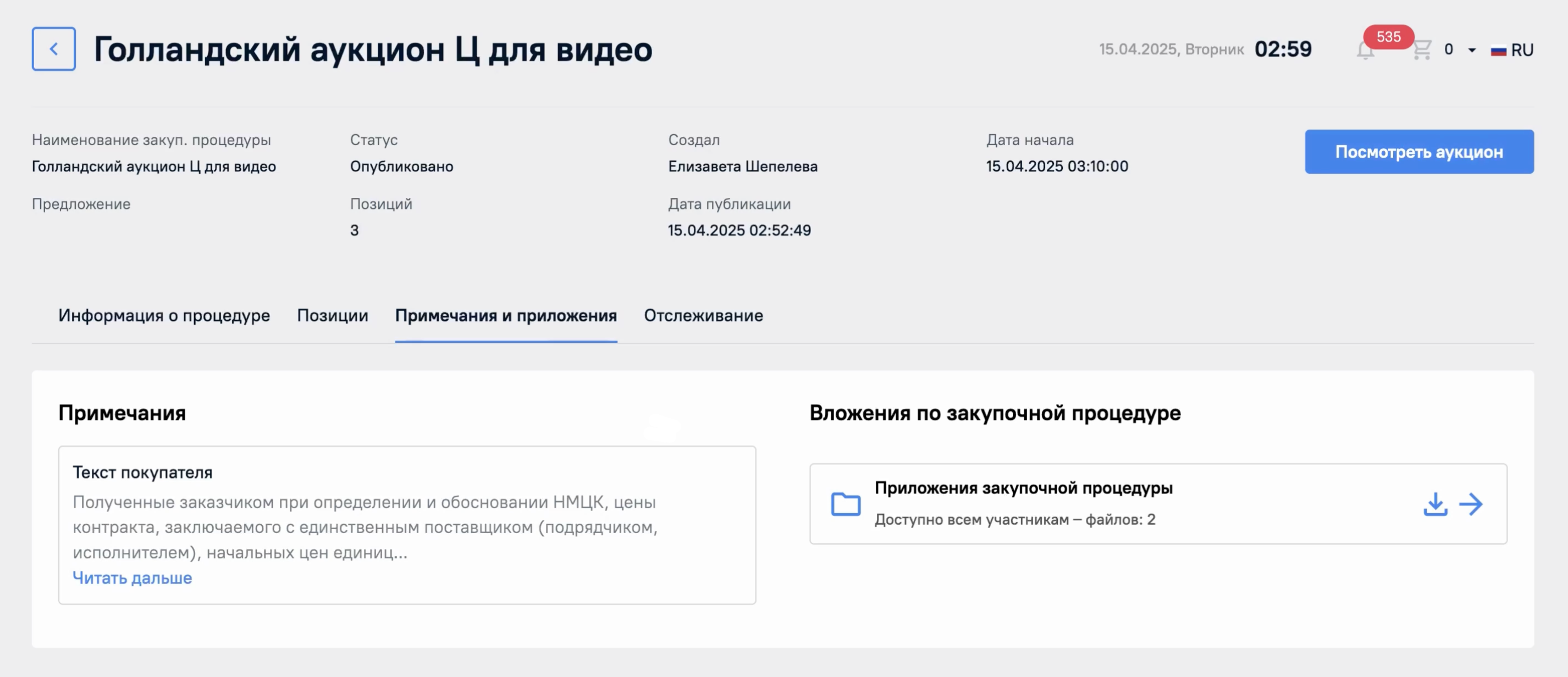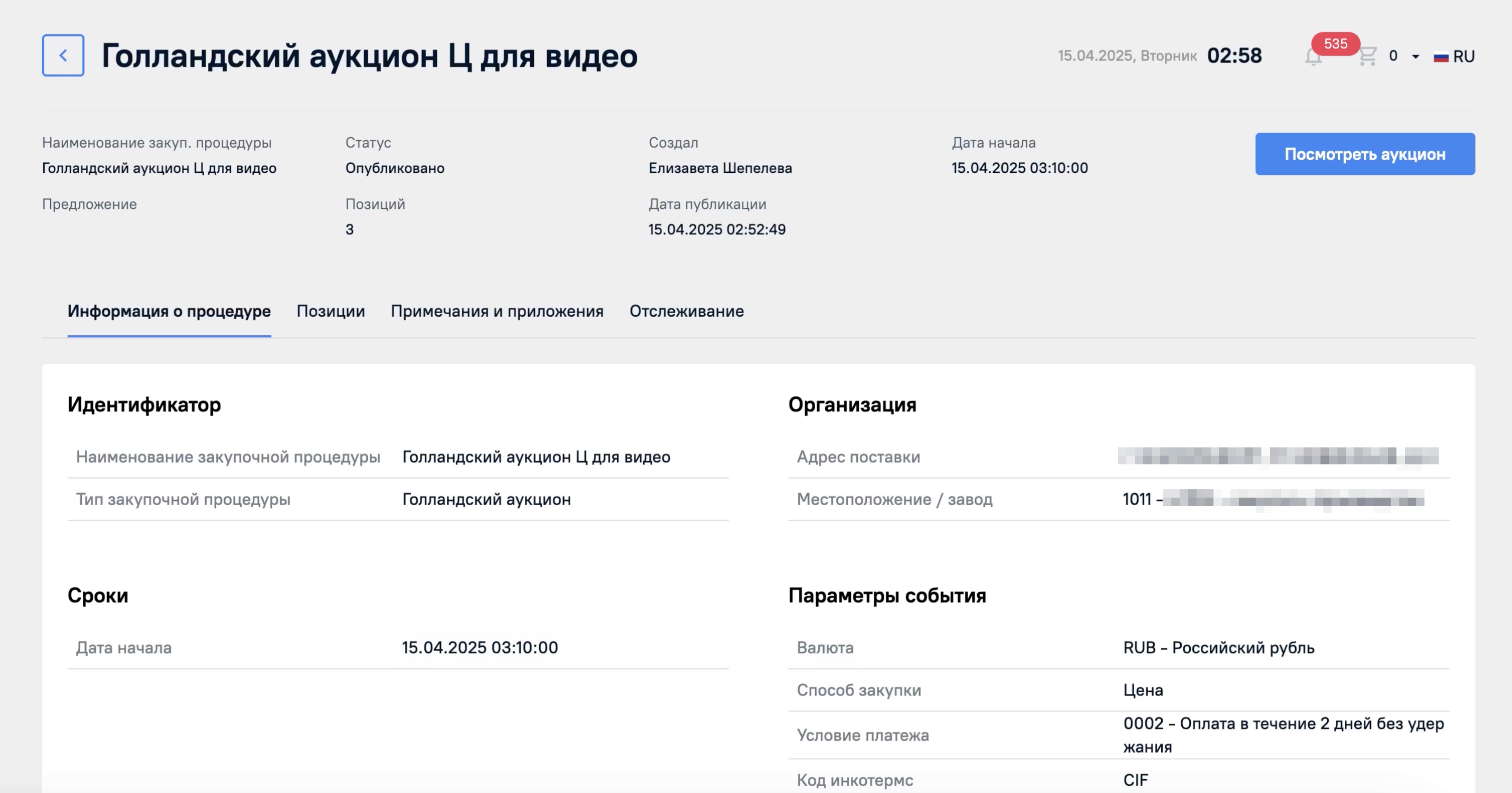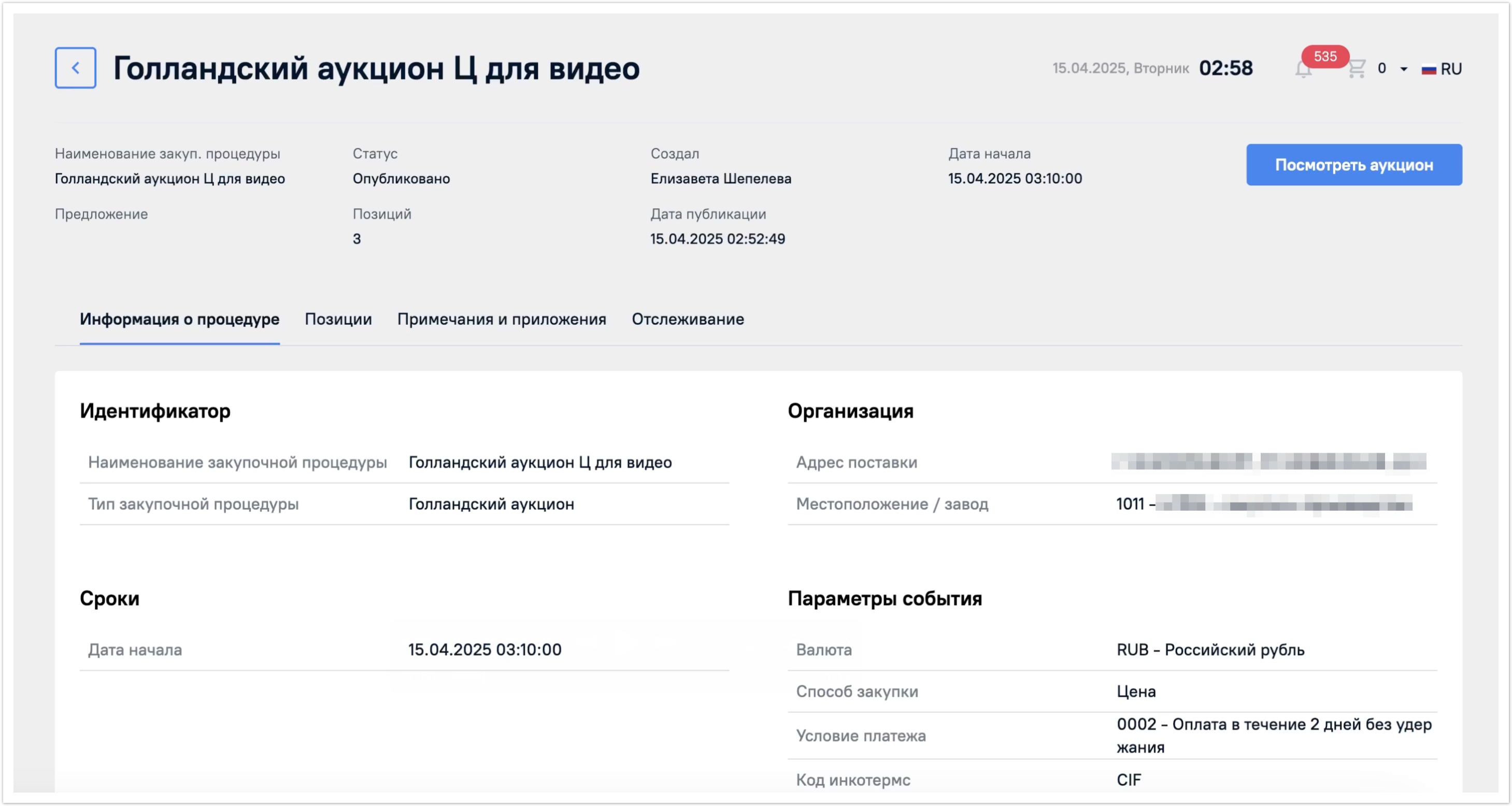 В статусе Опубликовано будет отображена кнопка Посмотреть аукцион. К ней мы вернемся далее.
