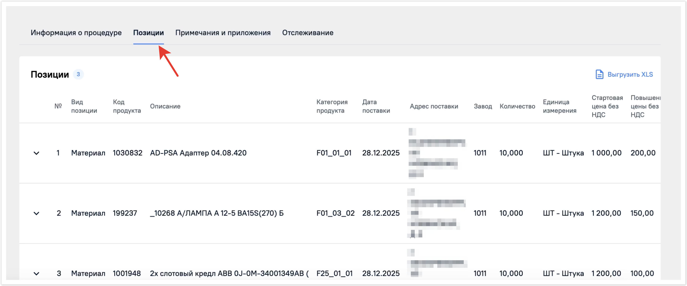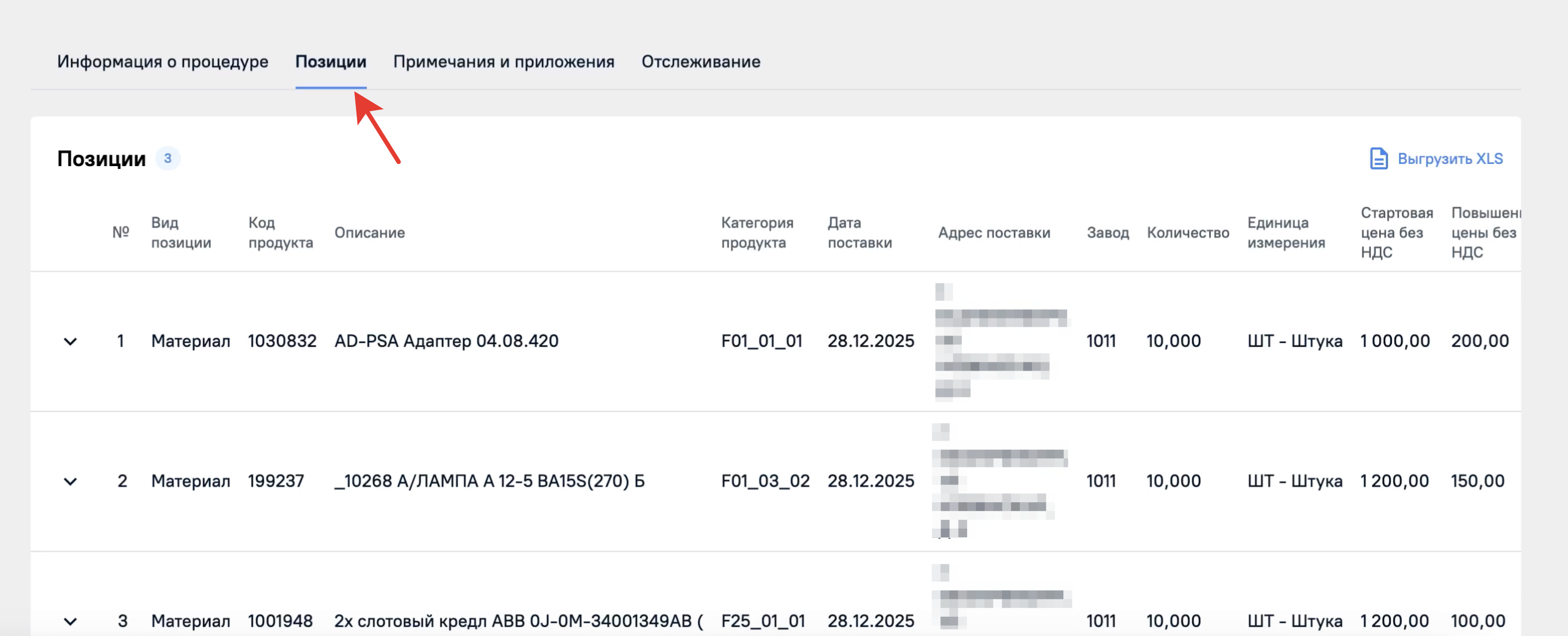 Следующая вкладка Позиции, тут располагается список позиций, которые участвуют в закупочной процедуре. Здесь будет выведена вся основная информация по позиции, а также дата и адрес поставки, количество и единица измерения; и комментарии закупщика.