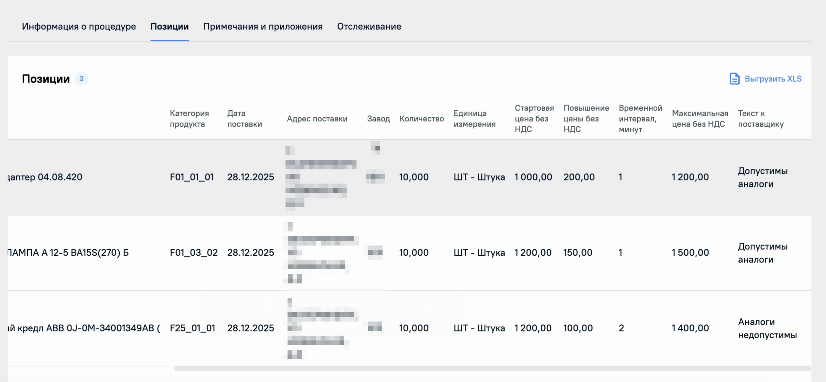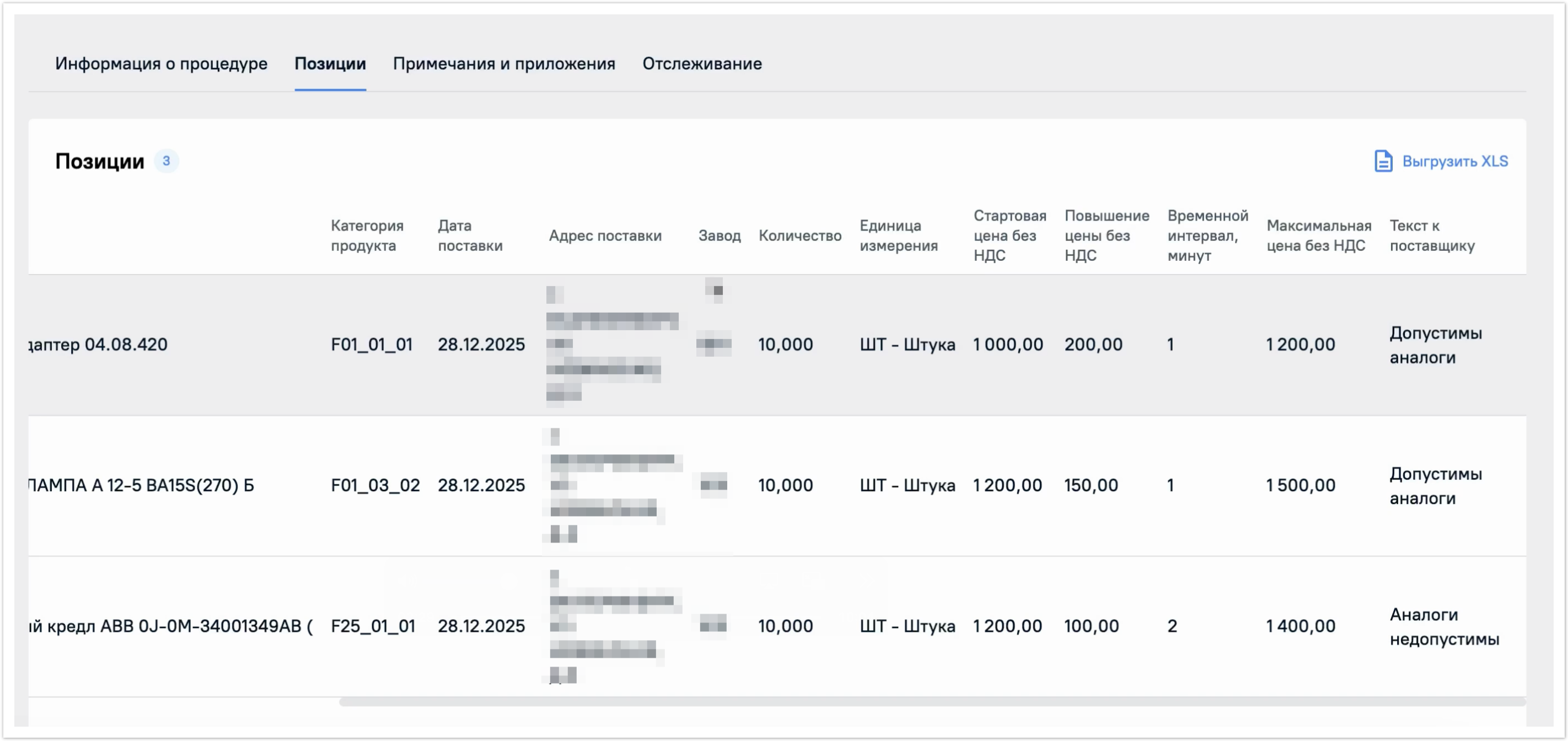 - Кол-во позиций - количество позиций в закупочной процедуре;
