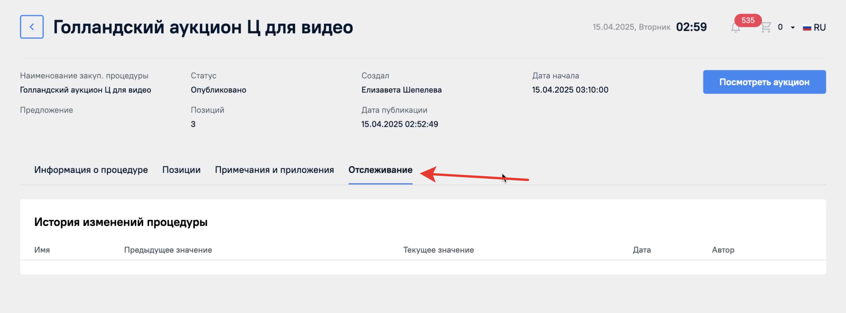 Последняя вкладка в закупочной процедуре Отслеживание. Здесь будет отображаться информация по изменению процедуры закупщиком и движение закупки по статусам.