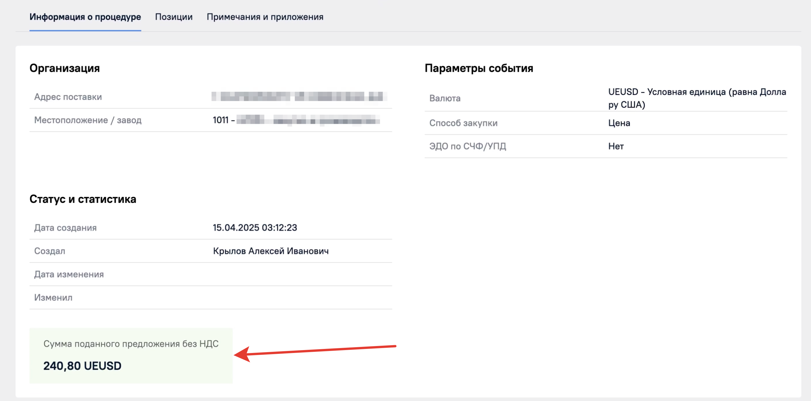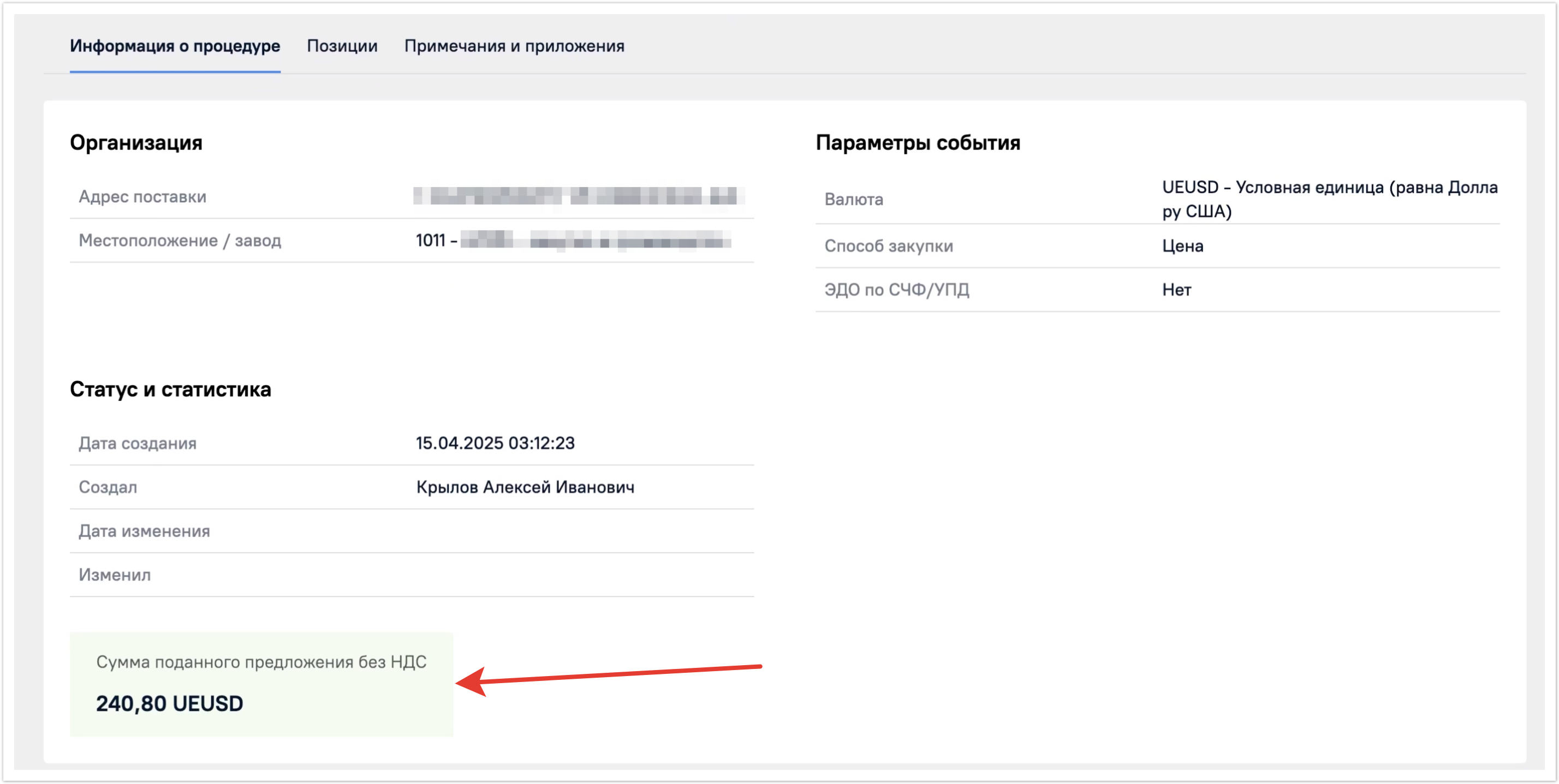 В верхней части страницы будет указана основная информация по закупочной процедуре: