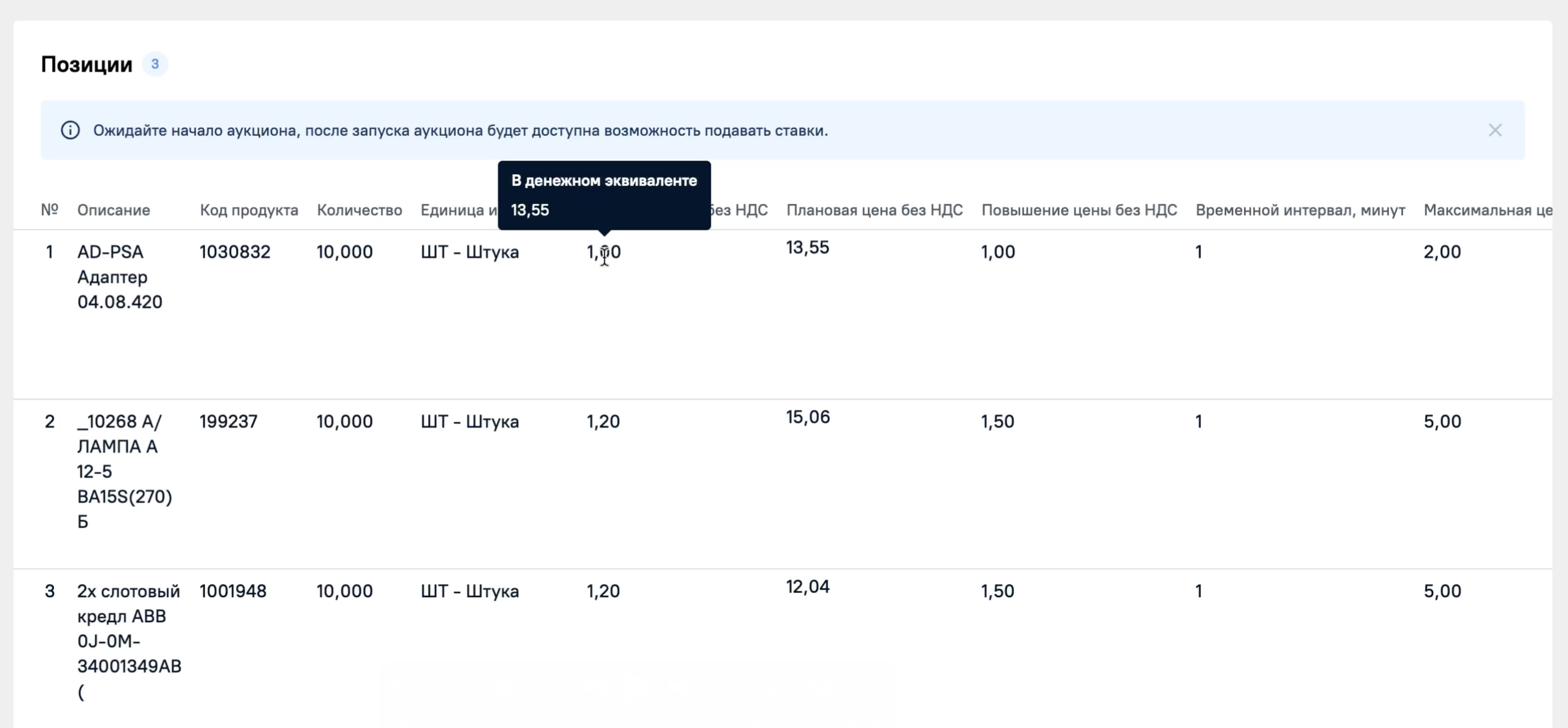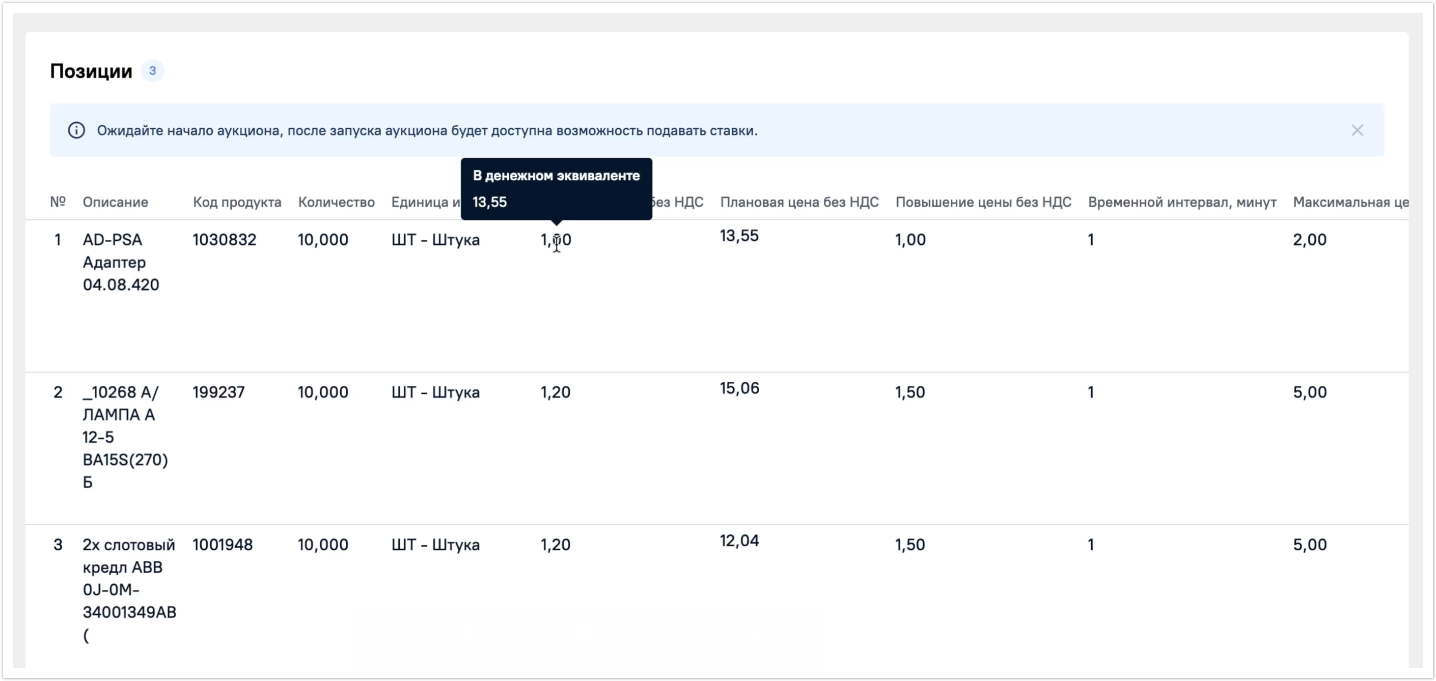 В зависимости от выбранного способа закупки будет отличаться отображение данных по цене на позицию. Сначала рассмотрим способ закупки Коэффициент. В этом случае Стартовая цена без НДС, Повышение цены без НДС и Максимальная цена без НДС будут выражены в виде коэффициентов. При наведении на значение коэффициента вы увидите его значение в денежном эквиваленте. На странице закупочной процедуры цены указаны в валюте закупочной процедуры. Далее при участии в закупке вы сможете выбрать валюту для участия. Плановая цена без НДС имеет денежное выражение.