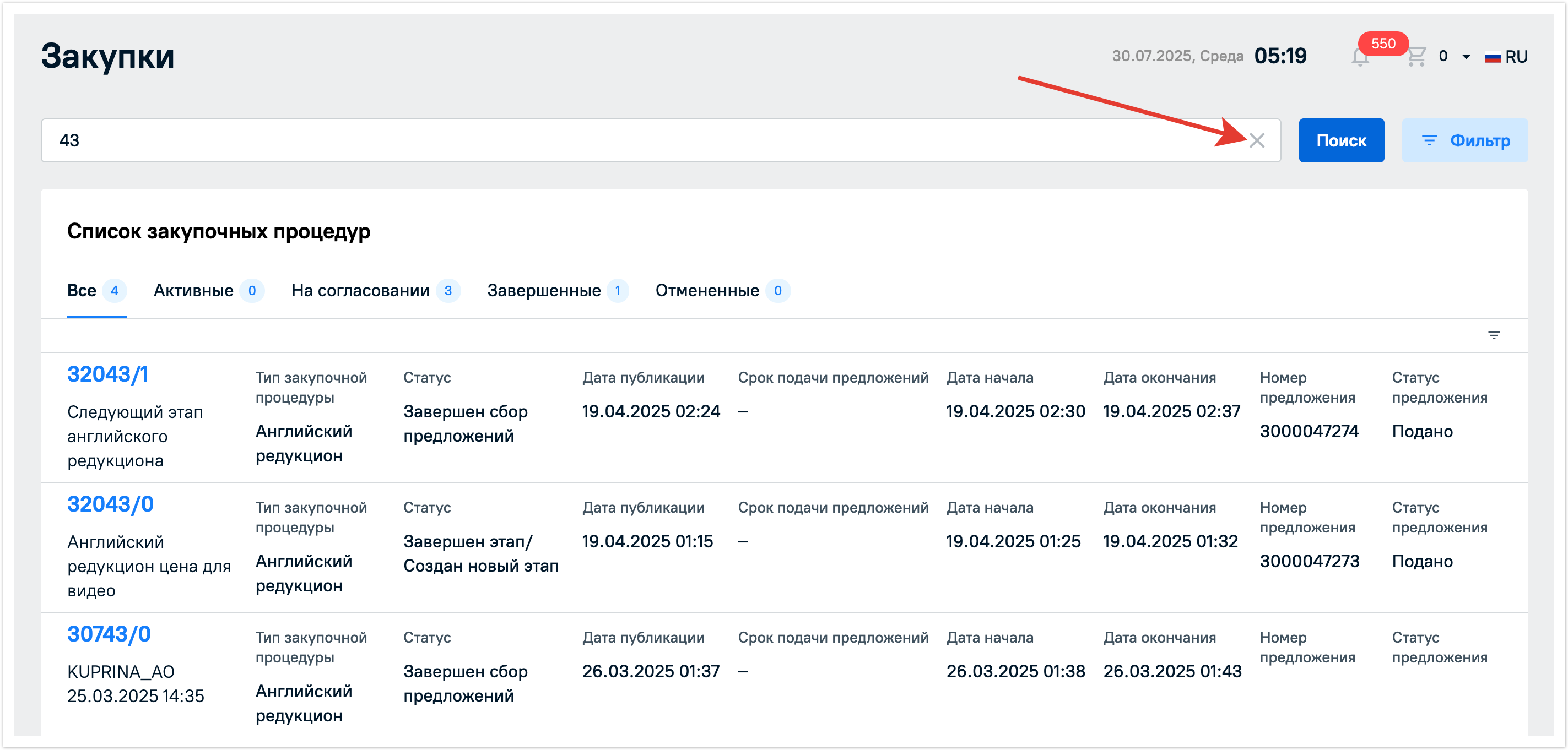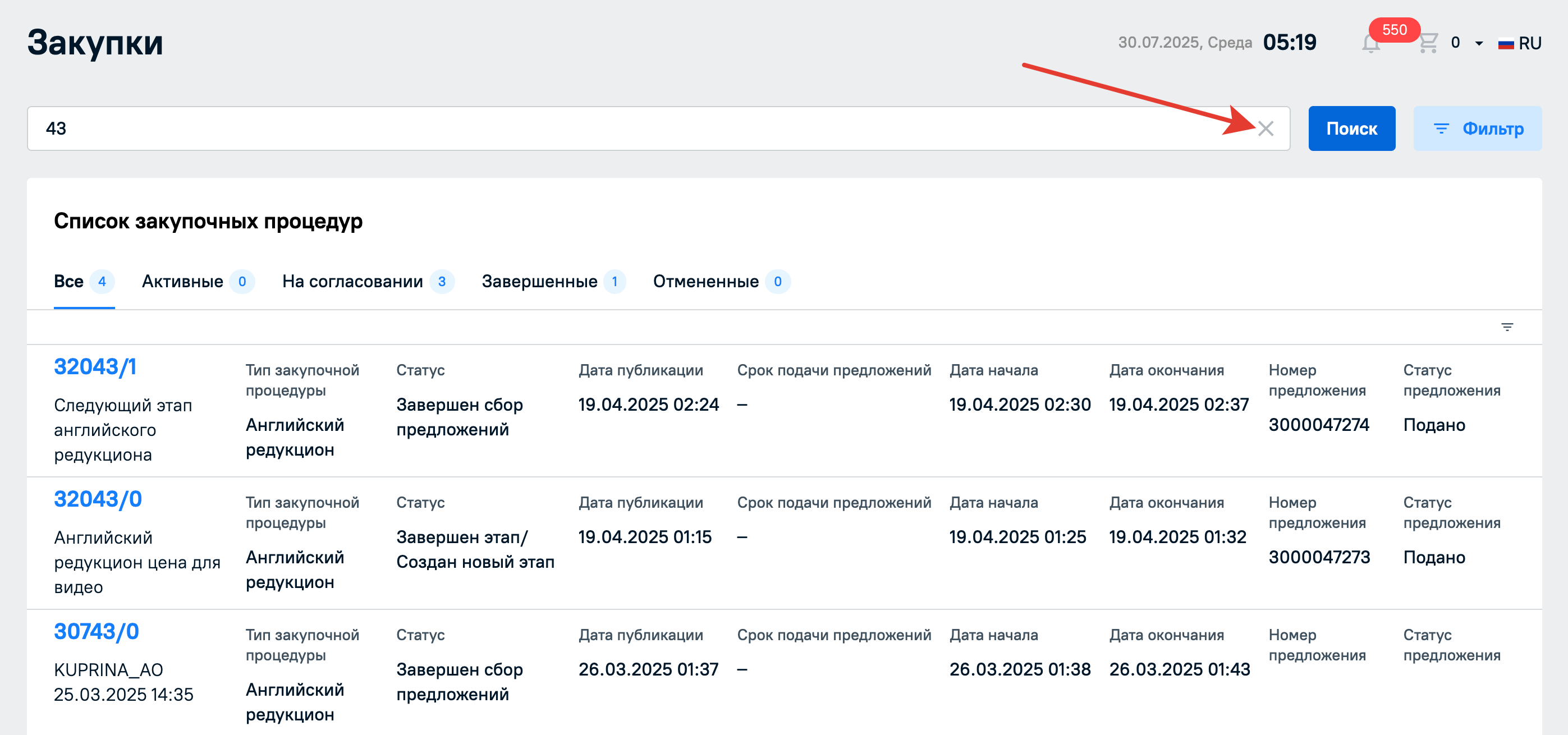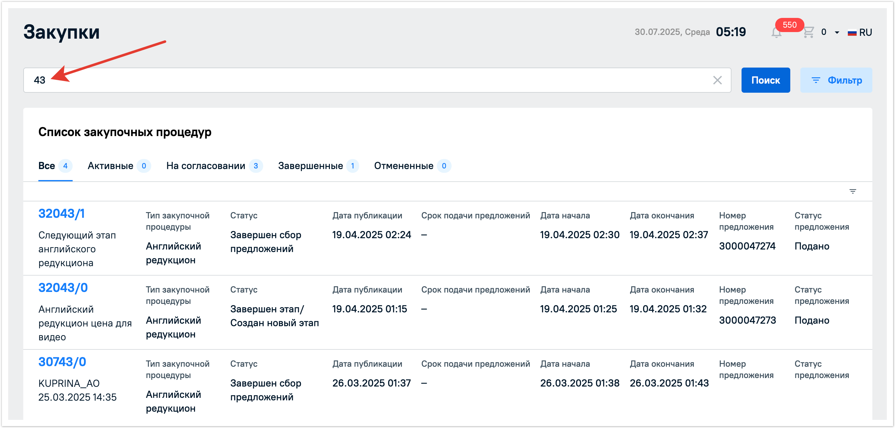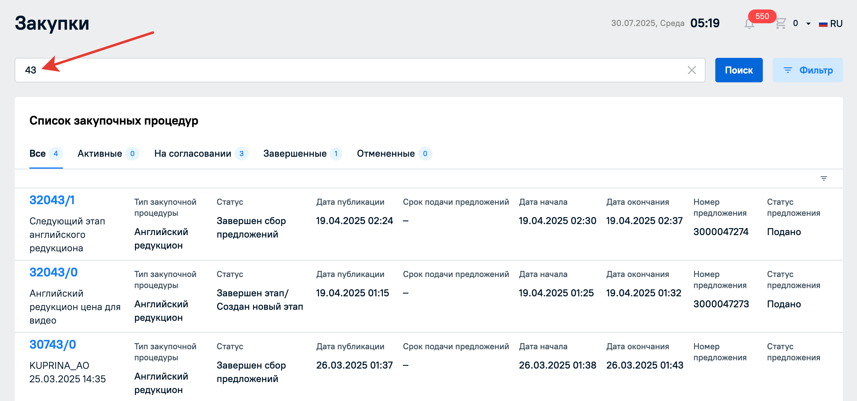 Закупочные процедуры можно искать по наименованию или по номеру процедуры через строку поиска в разделе Мои процедуры. Поиск будет успешно выполнен даже по частичному совпадению при наличии опечаток в запросе. Регистр не влияет на результаты выдачи.