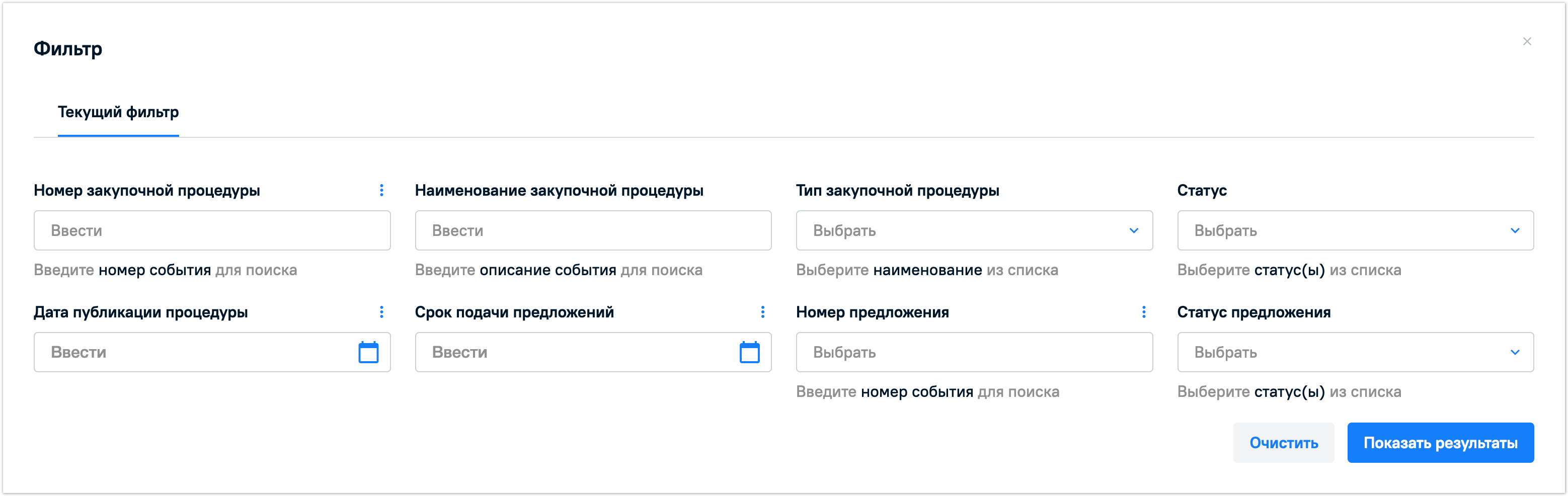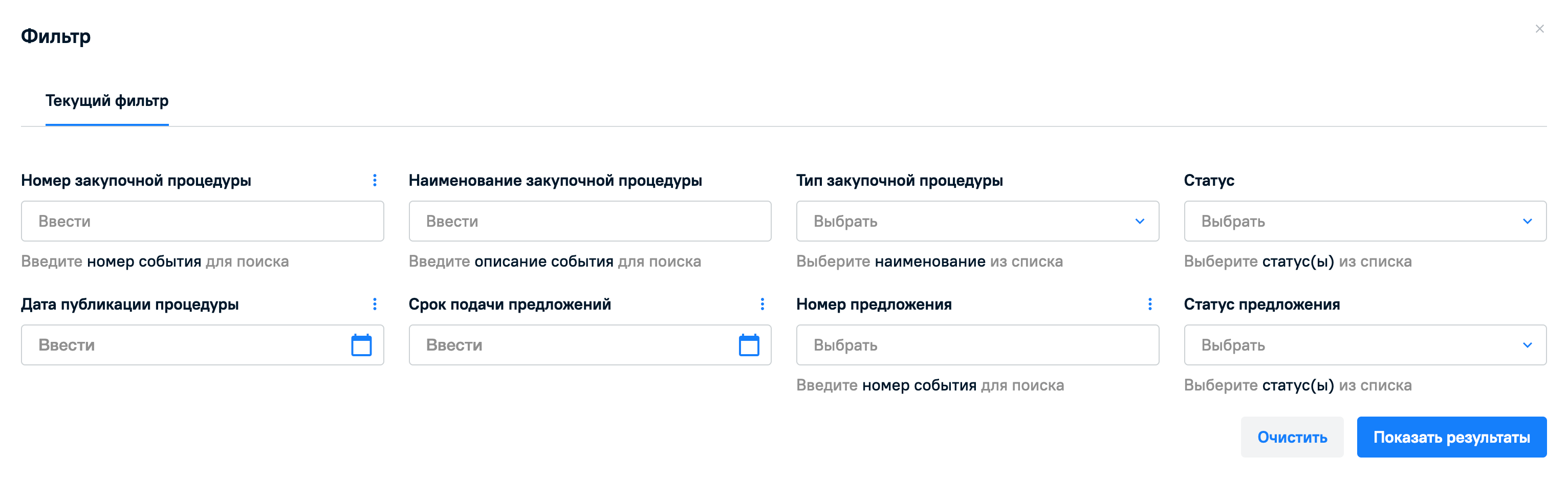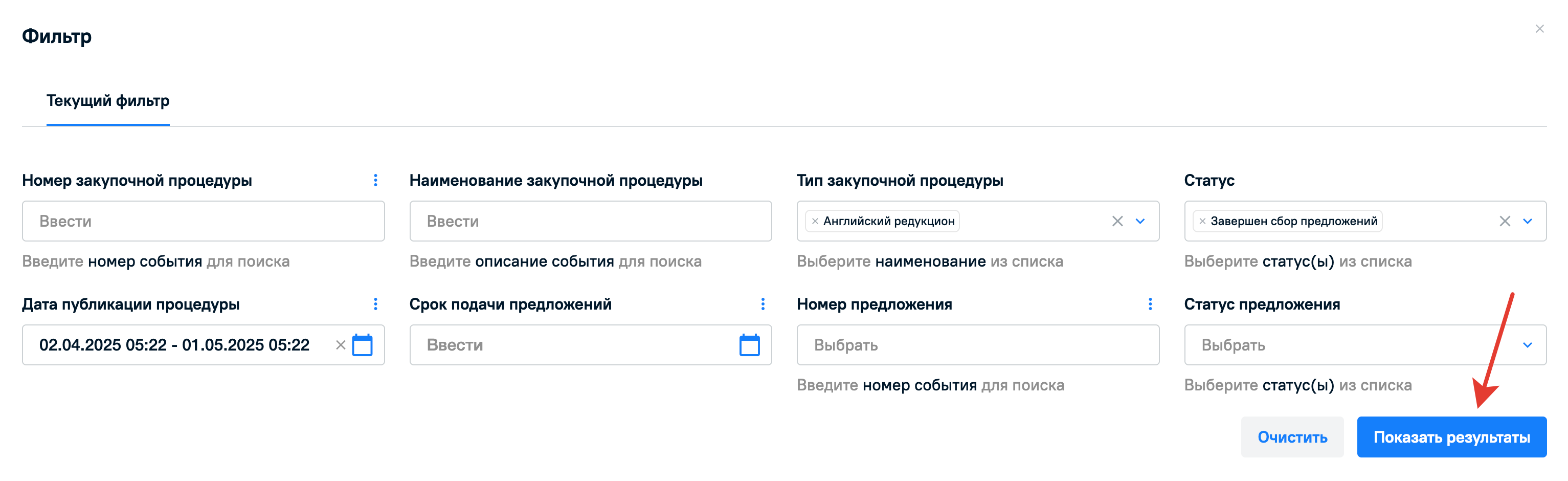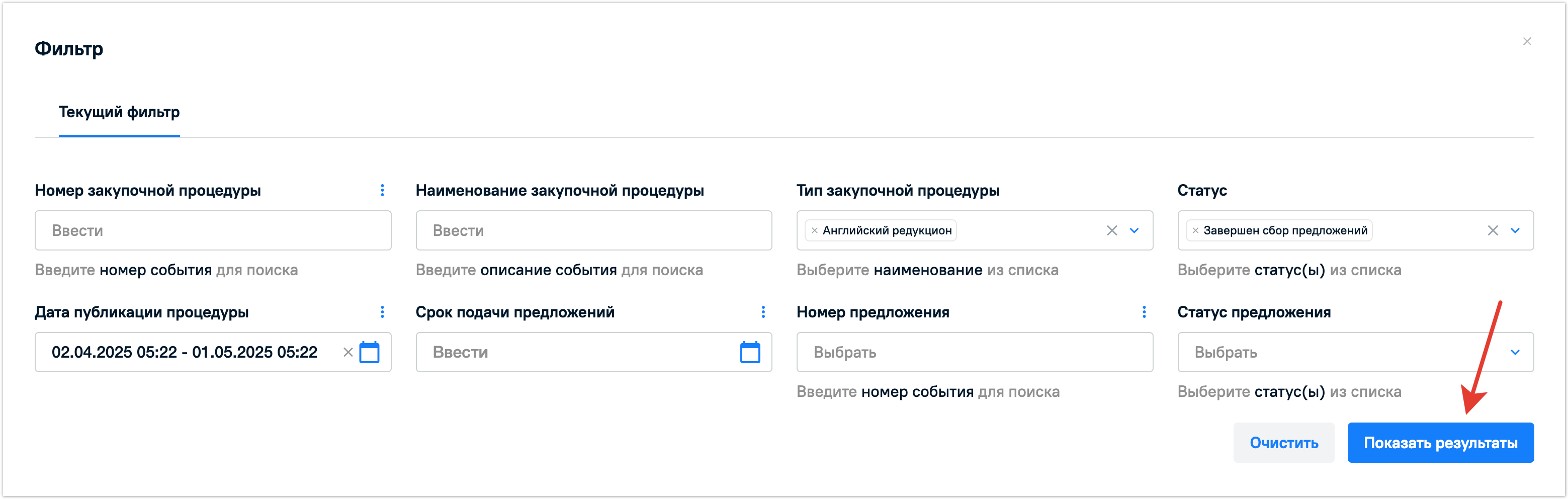 Можно применить одновременно несколько разных фильтров при поиске. После заполнения фильтров нажмите на кнопку Показать результаты, чтобы увидеть закупочные процедуры, которые попадают под заданную фильтрацию.