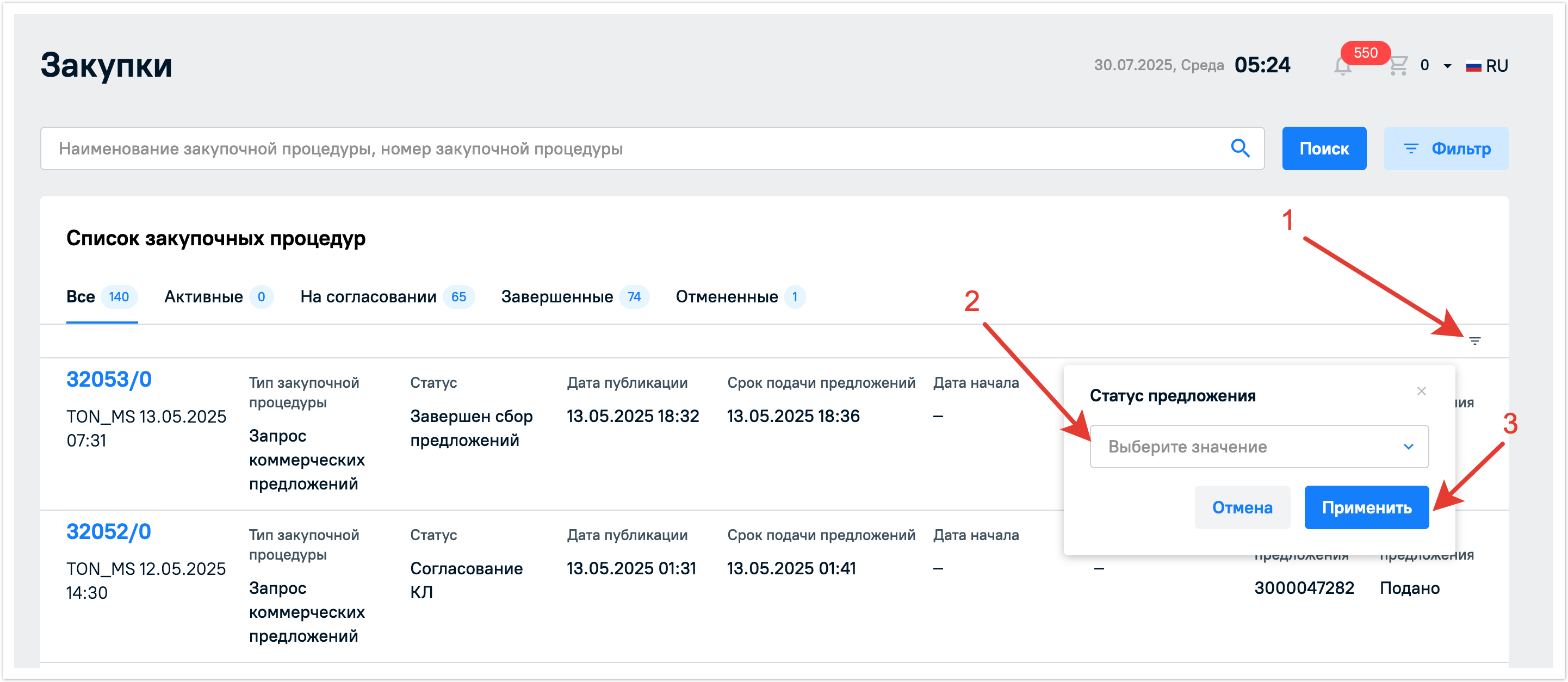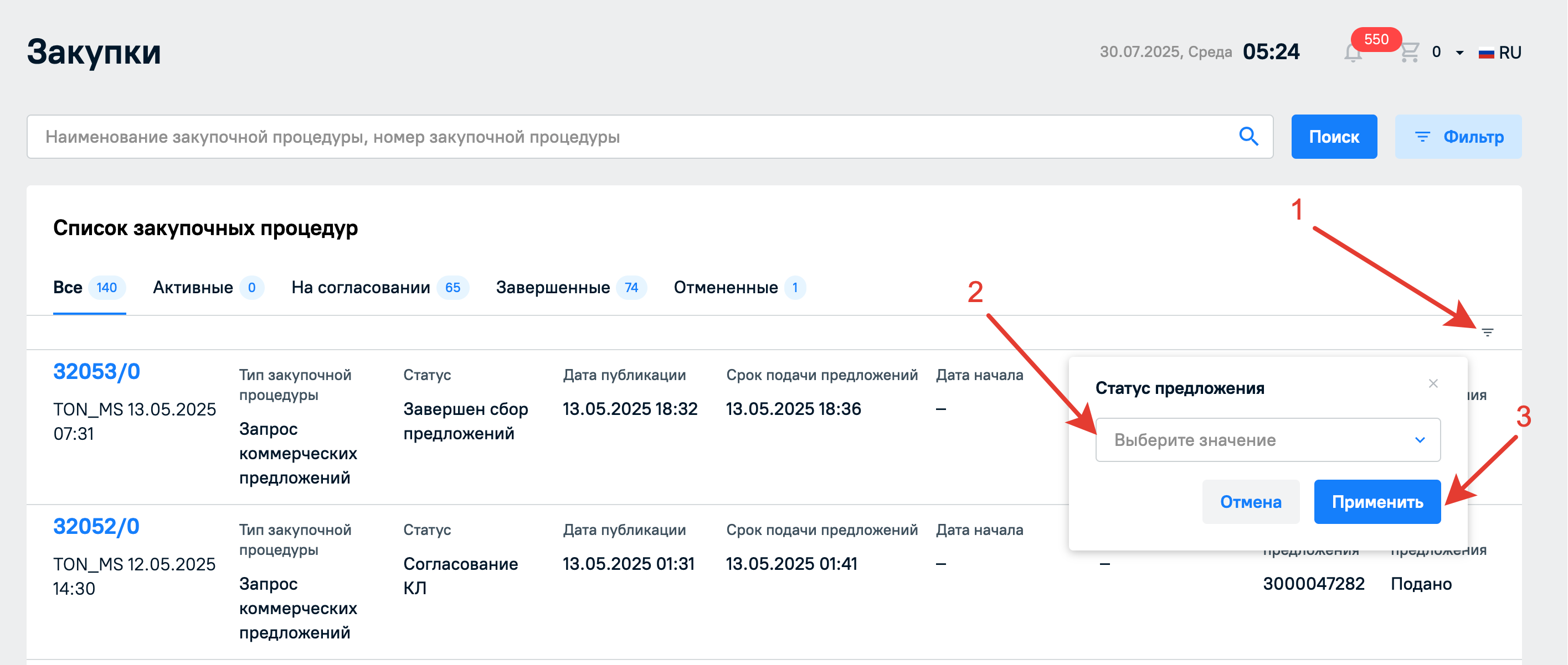 Кроме того для удобства есть дополнительная фильтрация процедур по прикрепленным к ним предложениям, если вы их подавали, и по статусу предложений, которая вынесена прямо в таблице с закупочными процедурами. Нажмите на кнопку фильтрации в столбце со статусом и выберите нужные значения. Далее нажмите на кнопку Применить чтобы фильтрация по статусам применилась к списку процедур.