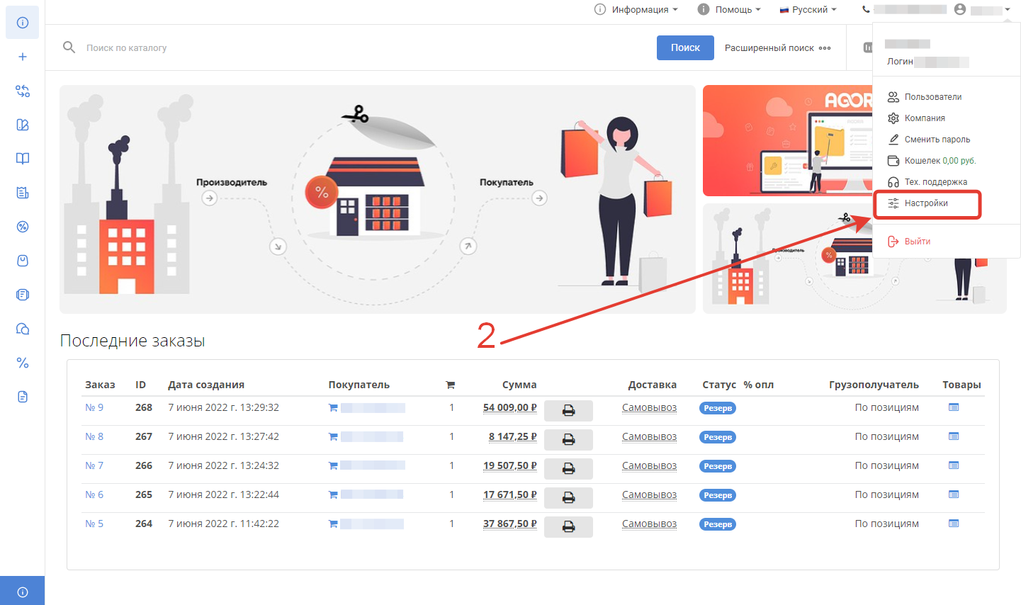 Чтобы настроить вывод в цен в каталоге, в выпадающем меню личного кабинета поставщика выберите раздел Настройки.