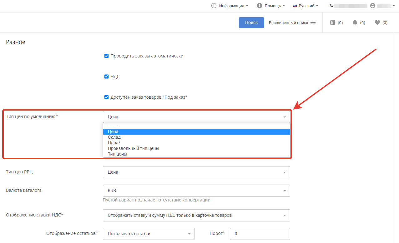 На открывшейся странице найдите поле Тип цен по умолчанию и выберите необходимый. В списке будут доступны типы цен, которые были загружены при импорте ваших товаров из XLS, YML, либо вашей ERP-системы.