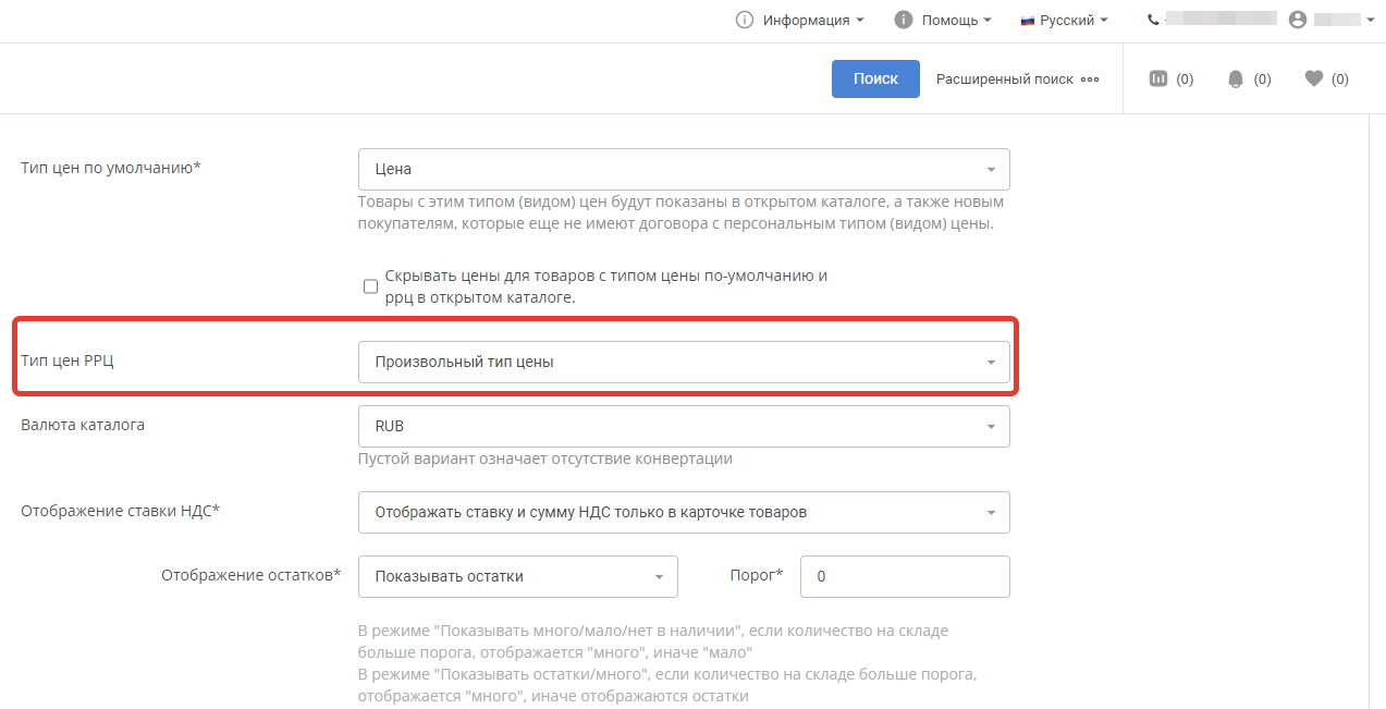 Тип цен Рекомендованной розничной цены (РРЦ) имеет ознакомительный характер. Выбрать его можно также в разделе Настройки личного кабинета поставщика.