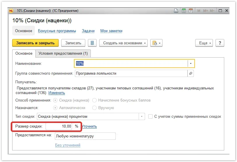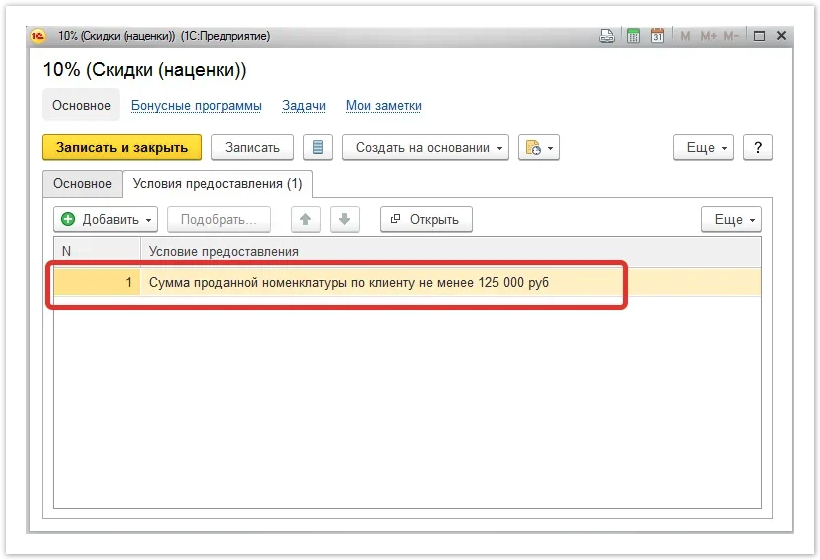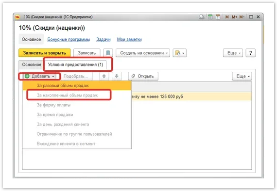 Для настройки программы лояльности можно использовать скидки, которые привязаны к накопленному объему продаж. Чтобы создать свою программу лояльности, в 1С откройте раздел Скидки(наценки). Выберите вкладку Условия предоставленияЗа наколенный объем продаж.