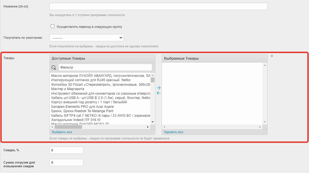Если товары выбраны, то скидка будет распространяться только на выбранные товары. Если товары не выбраны, то скидка по программе лояльности будет распространяться на все товары покупателя.