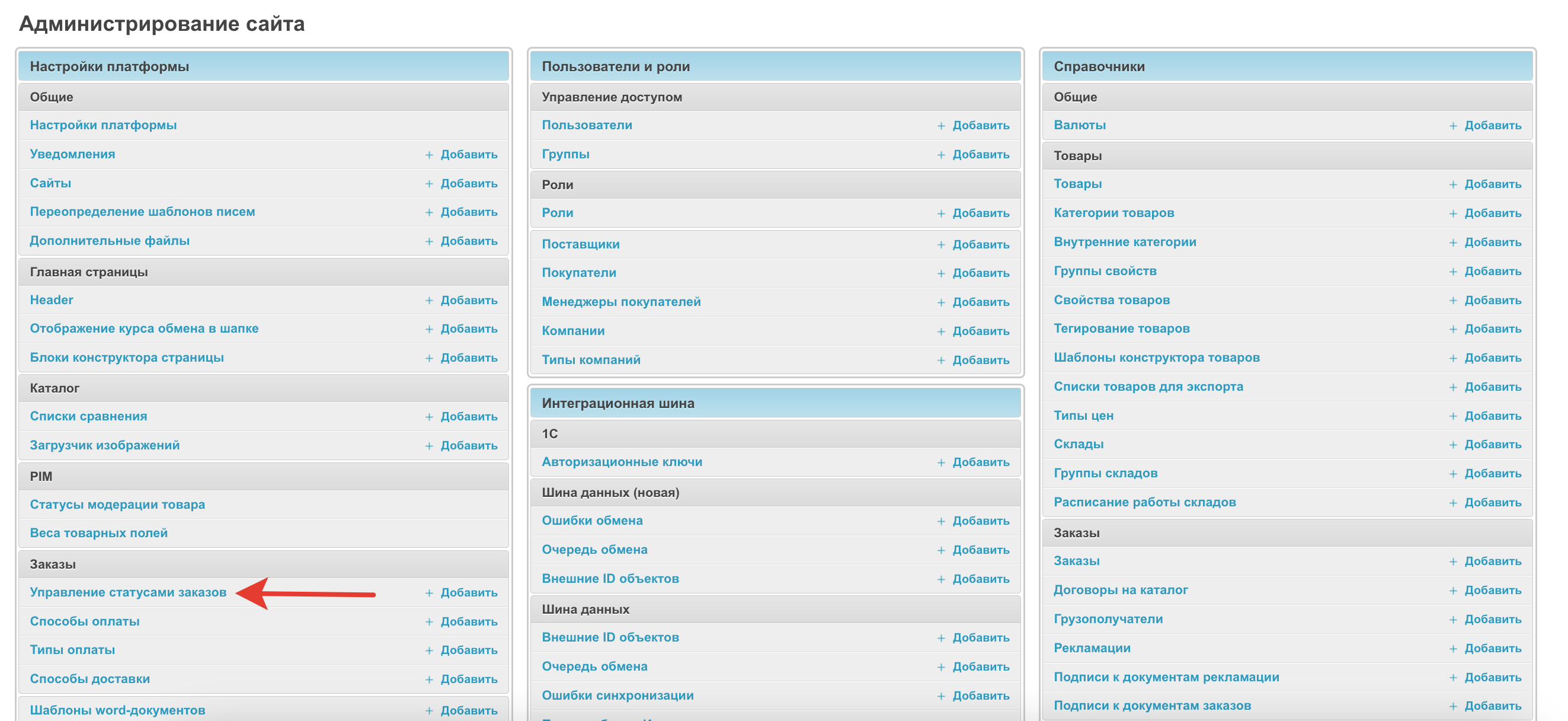 В административной панели Agora нужно установить, при каком статусе заказа он будет учитываться в программе лояльности. Для этого нужно перейти в раздел Управление статусами заказов.