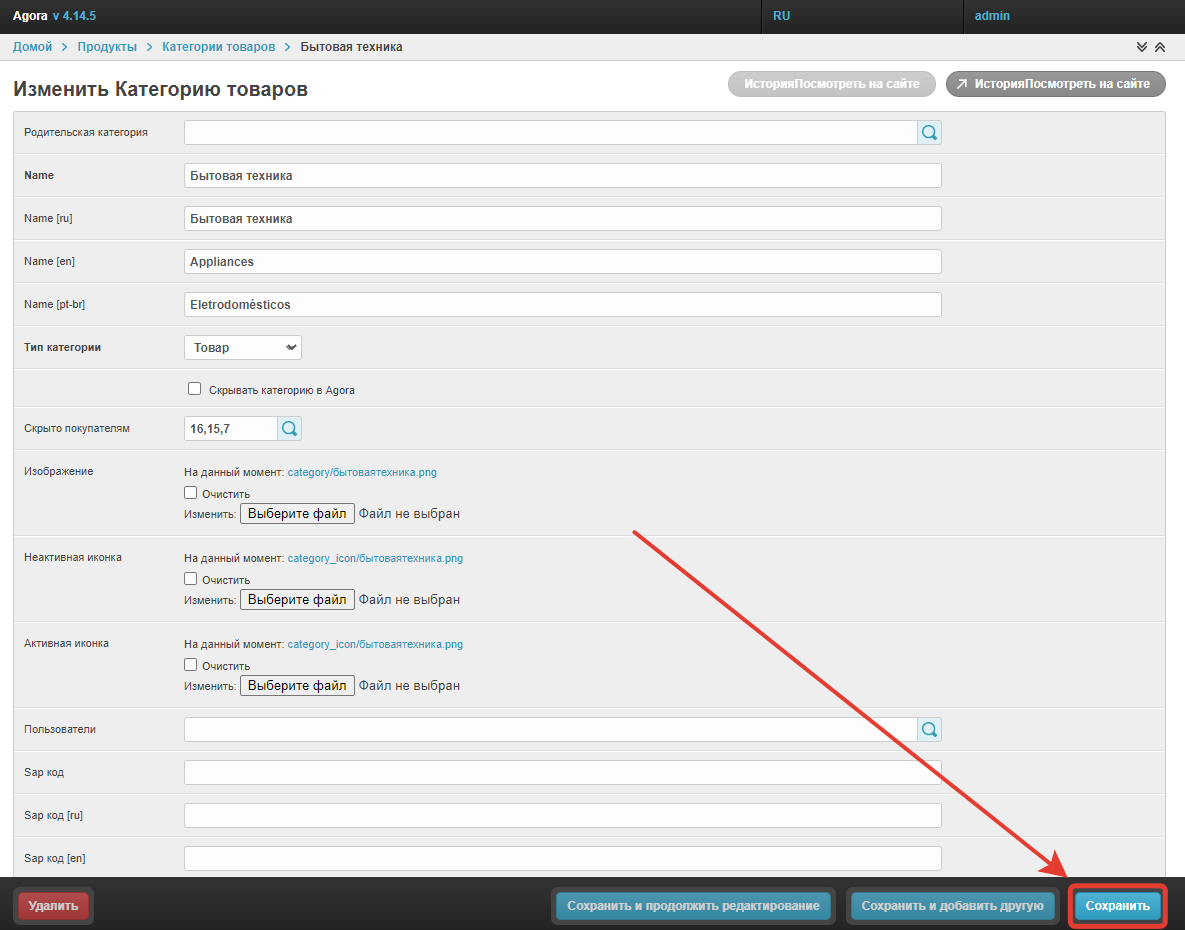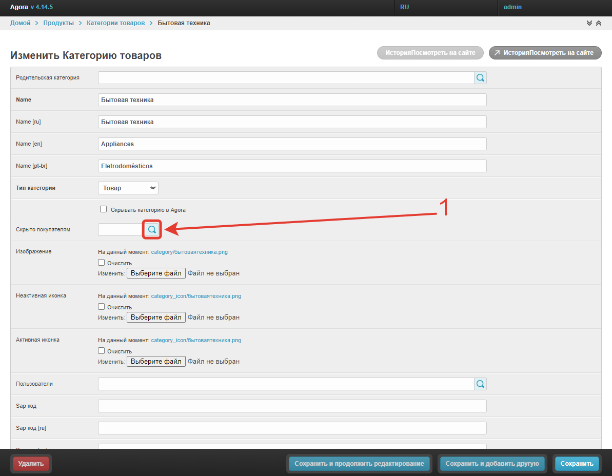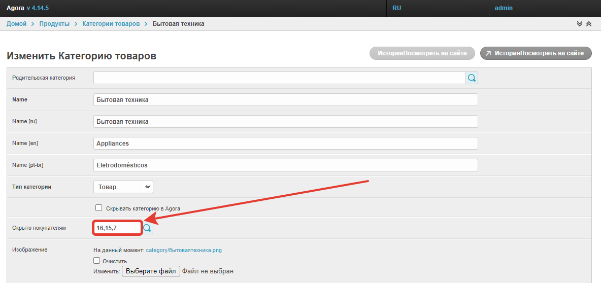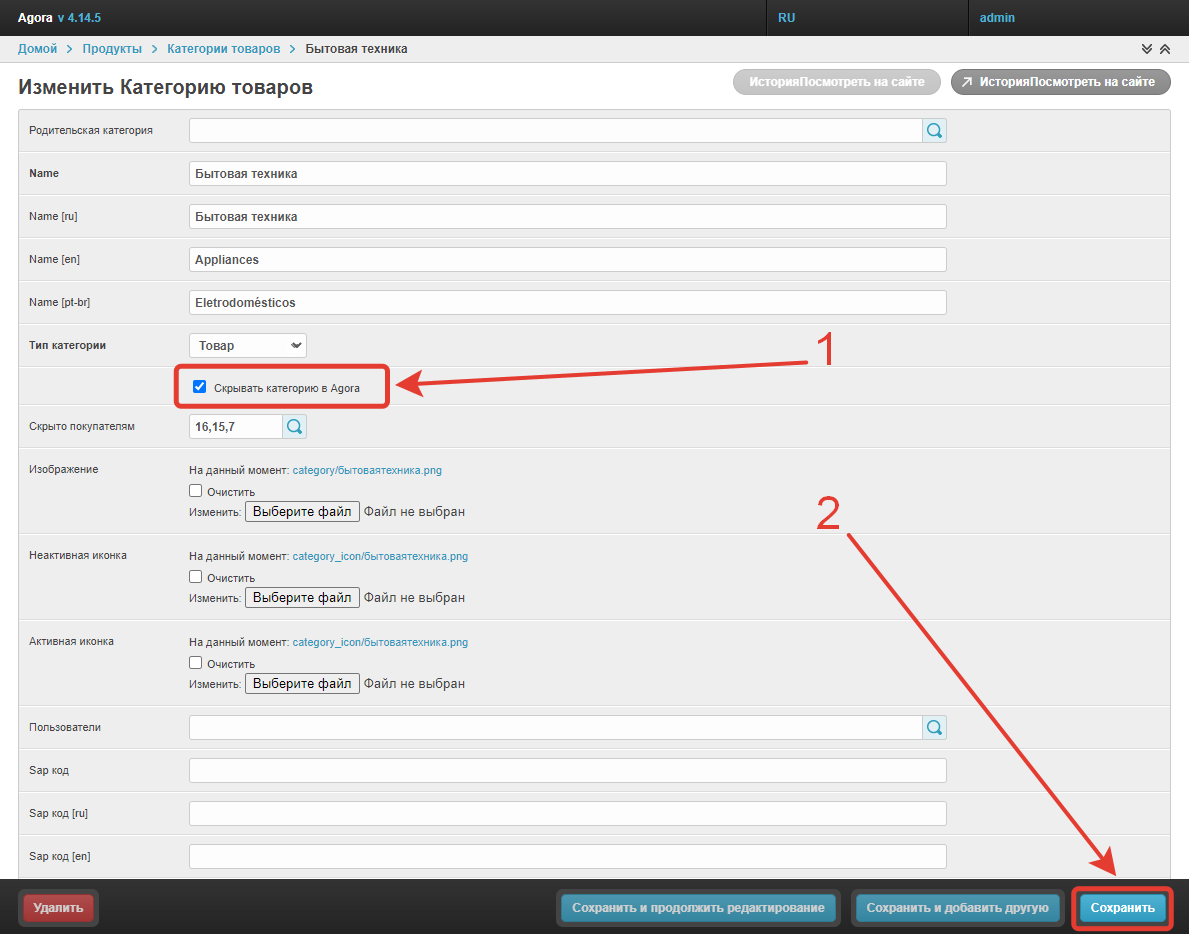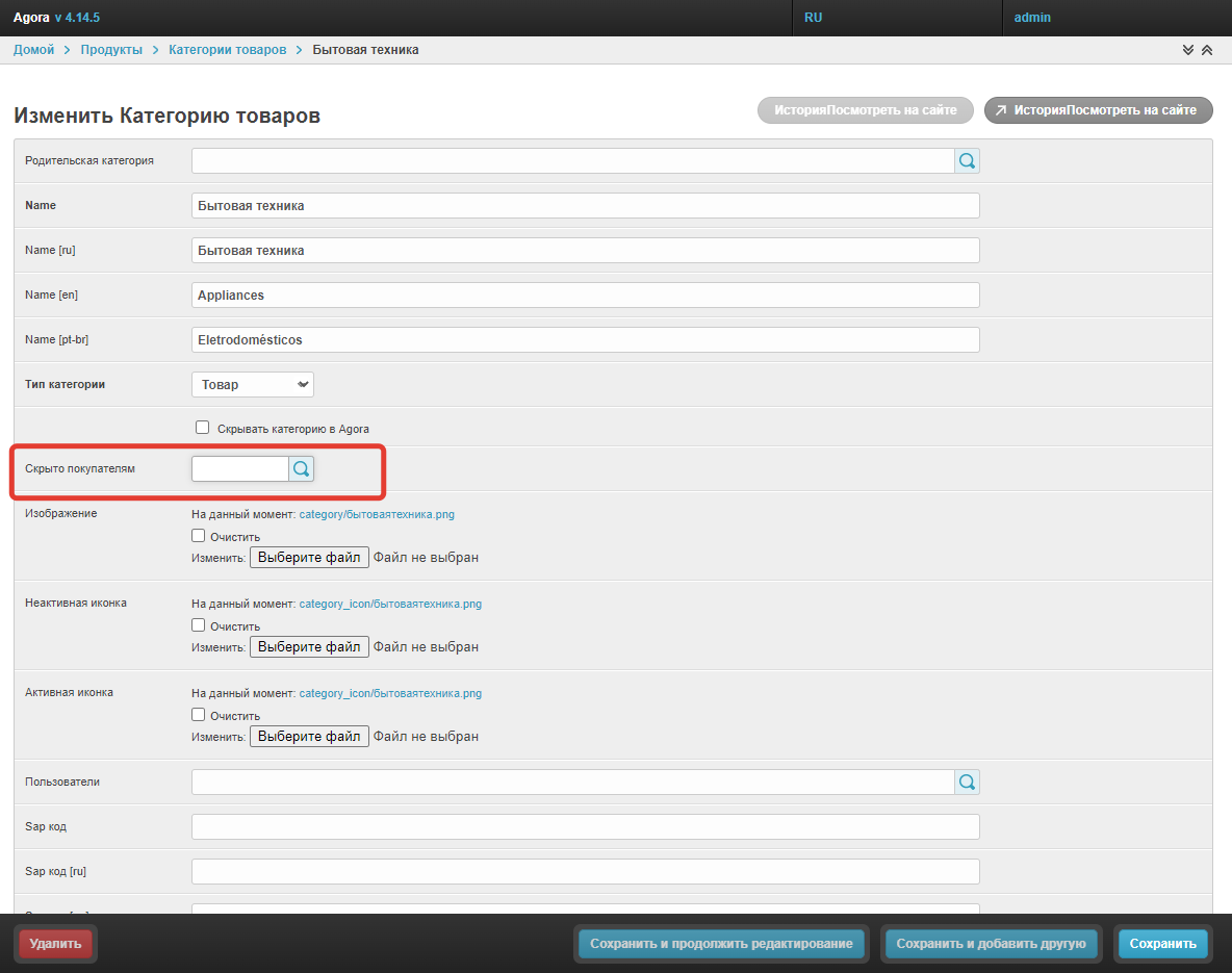 В окне изменения категорий есть возможность скрыть категорию для всех пользователей с помощью чекбокса Скрывать категорию в Agora. После его выбора и сохранения изменений категория перестанет отображаться для всех пользователей.