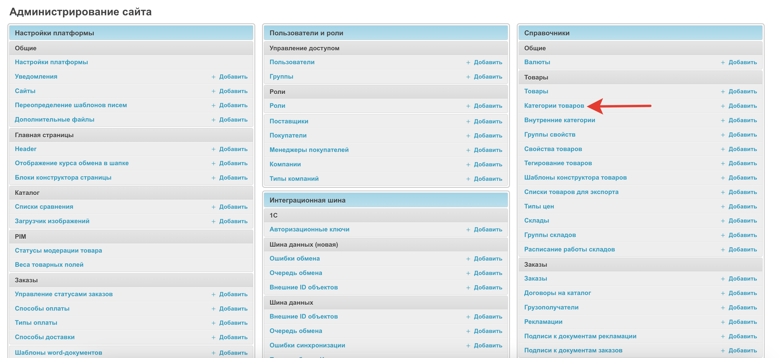 Настройка прав доступа к категориям товаров производится в разделе Категории товаров административной панели проекта.