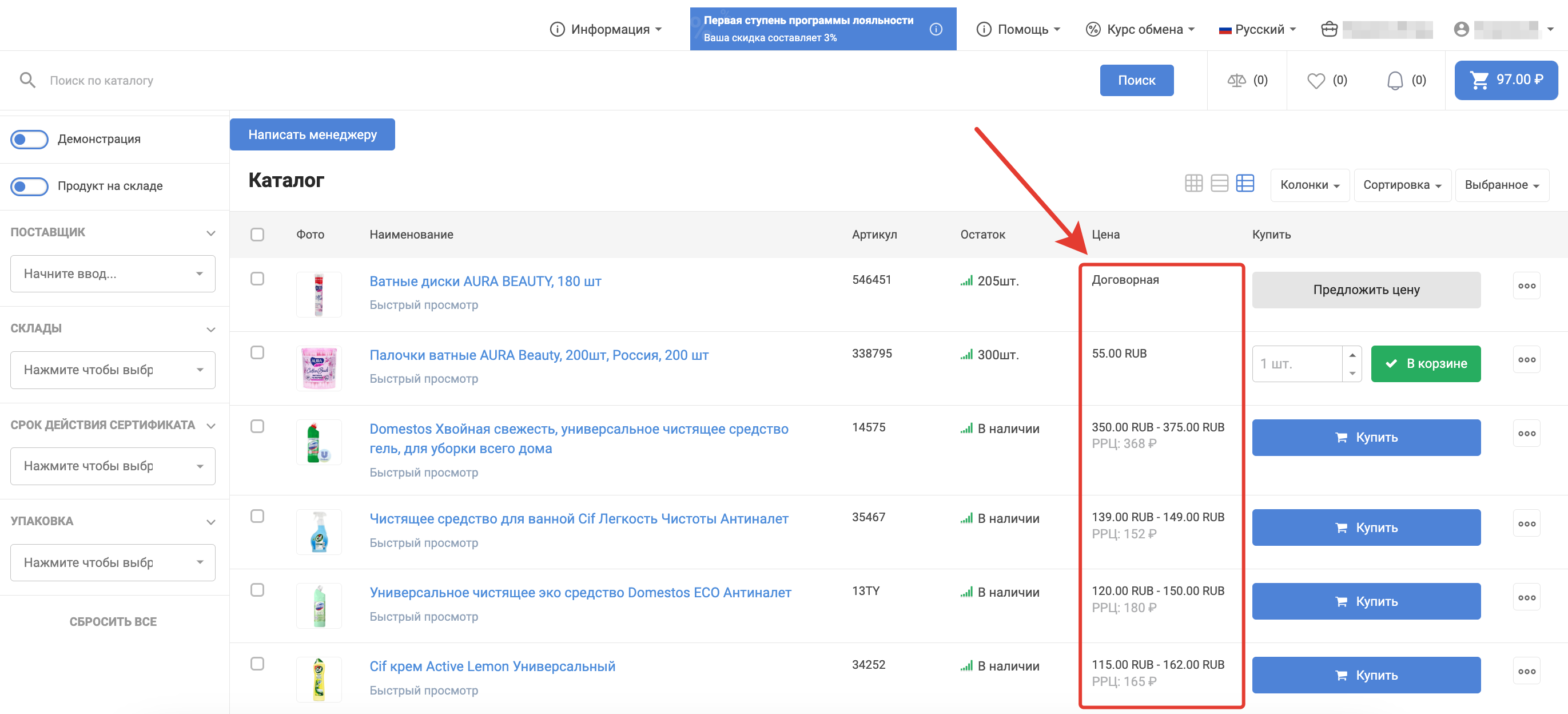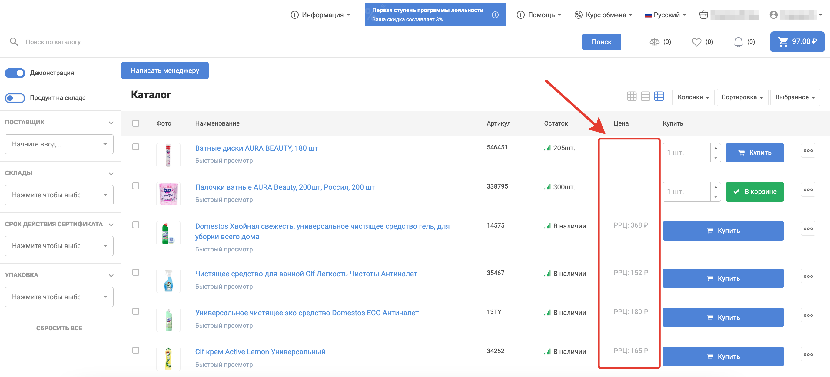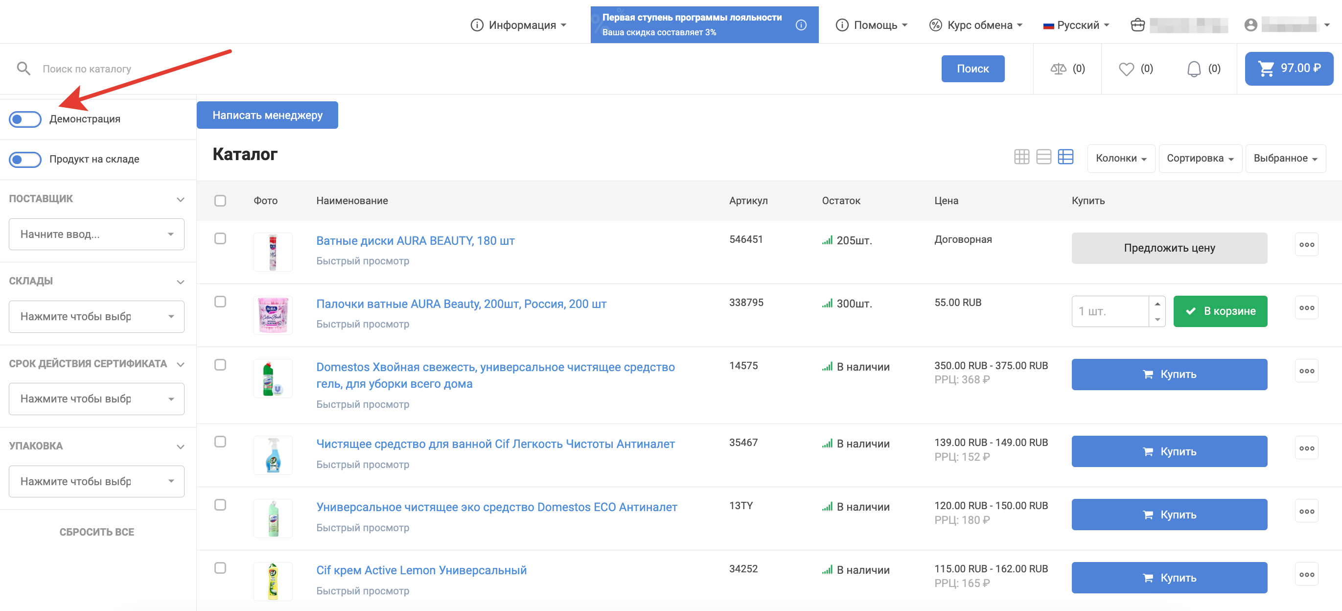 Режим демонстрации позволяет скрыть в каталоге цены, которые доступны зарегистрированному пользователю, оставив при этом рекомендованную розничную цену (РРЦ). Это нужно в случаях, когда сторонние клиенты знакомятся с каталогом в офисе поставщика/покупателя или в рамках онлайн-встречи и не имеют своего доступа к платформе. Функционал демонстрации каталога сначала должен подключить администратор платформы в административной панели.
