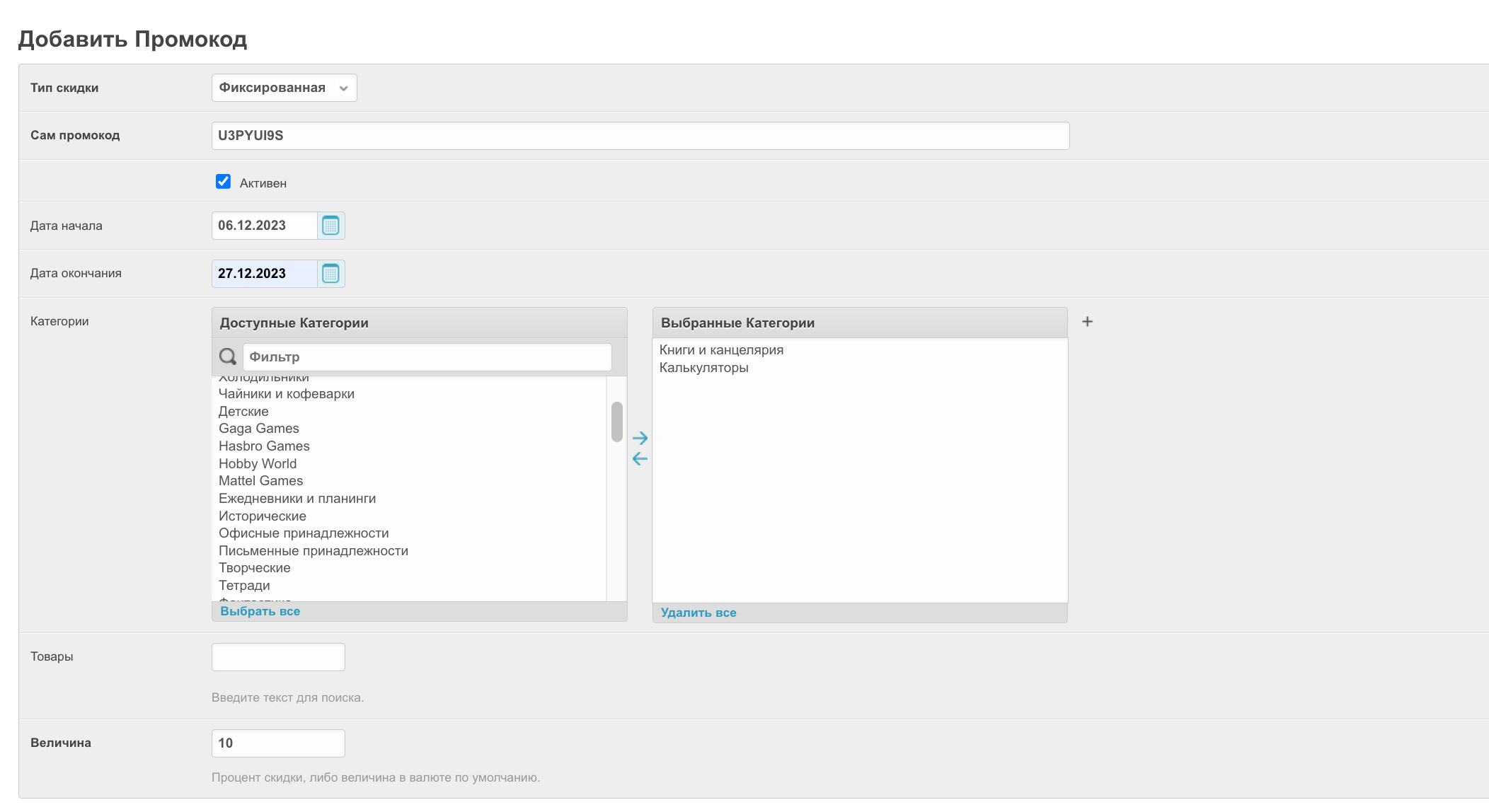 - Категории (категории товаров, на покупку которых будет распространятся промокод)
