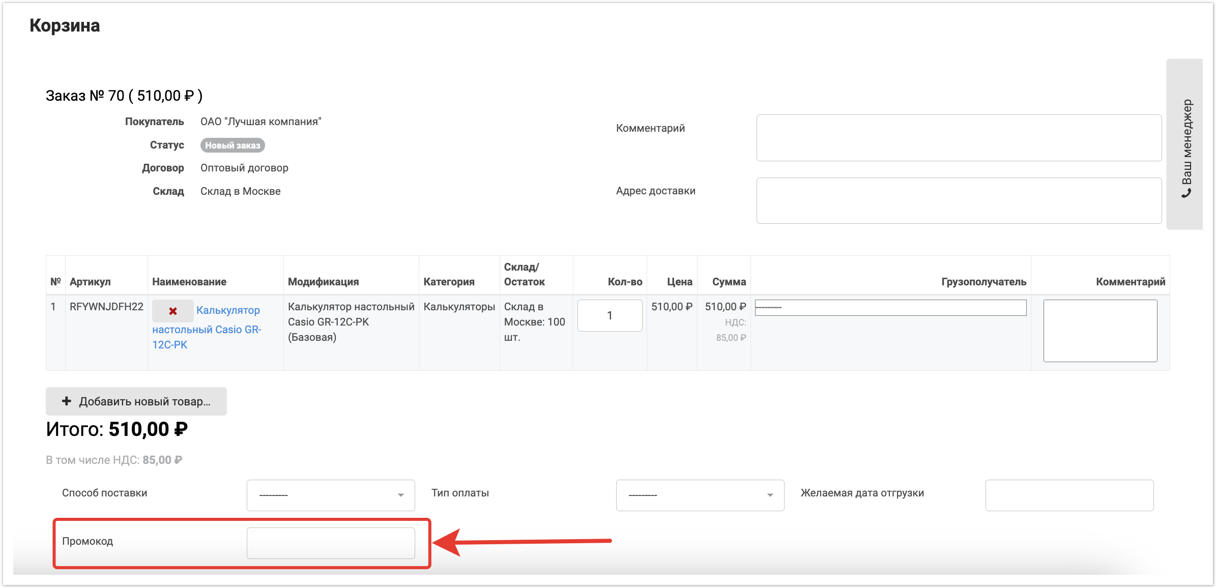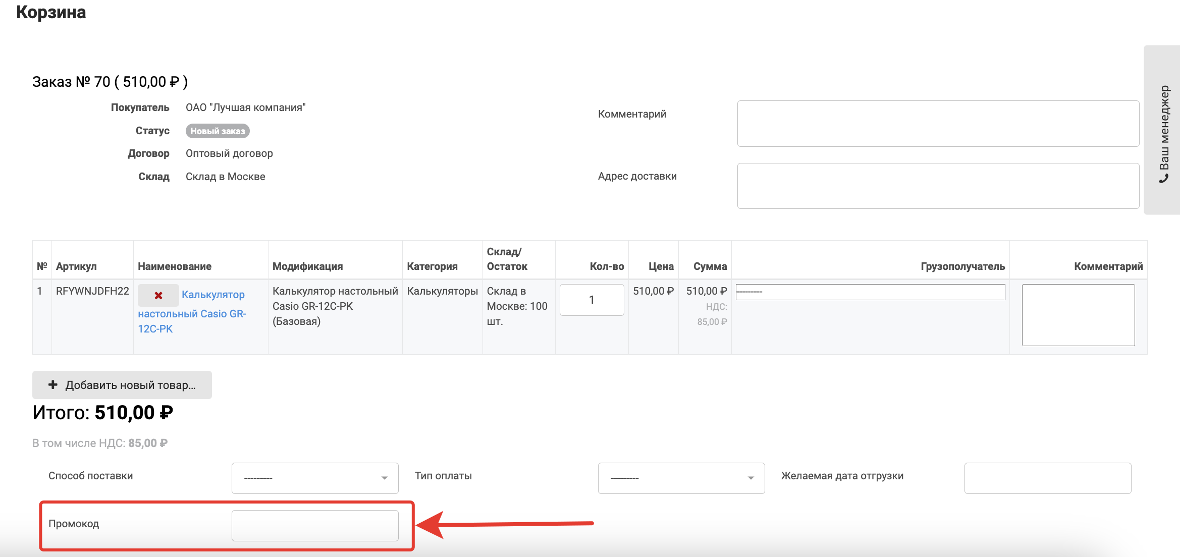 На этапе корзины у Покупателя появится возможность указать промокод в поле Промокод: