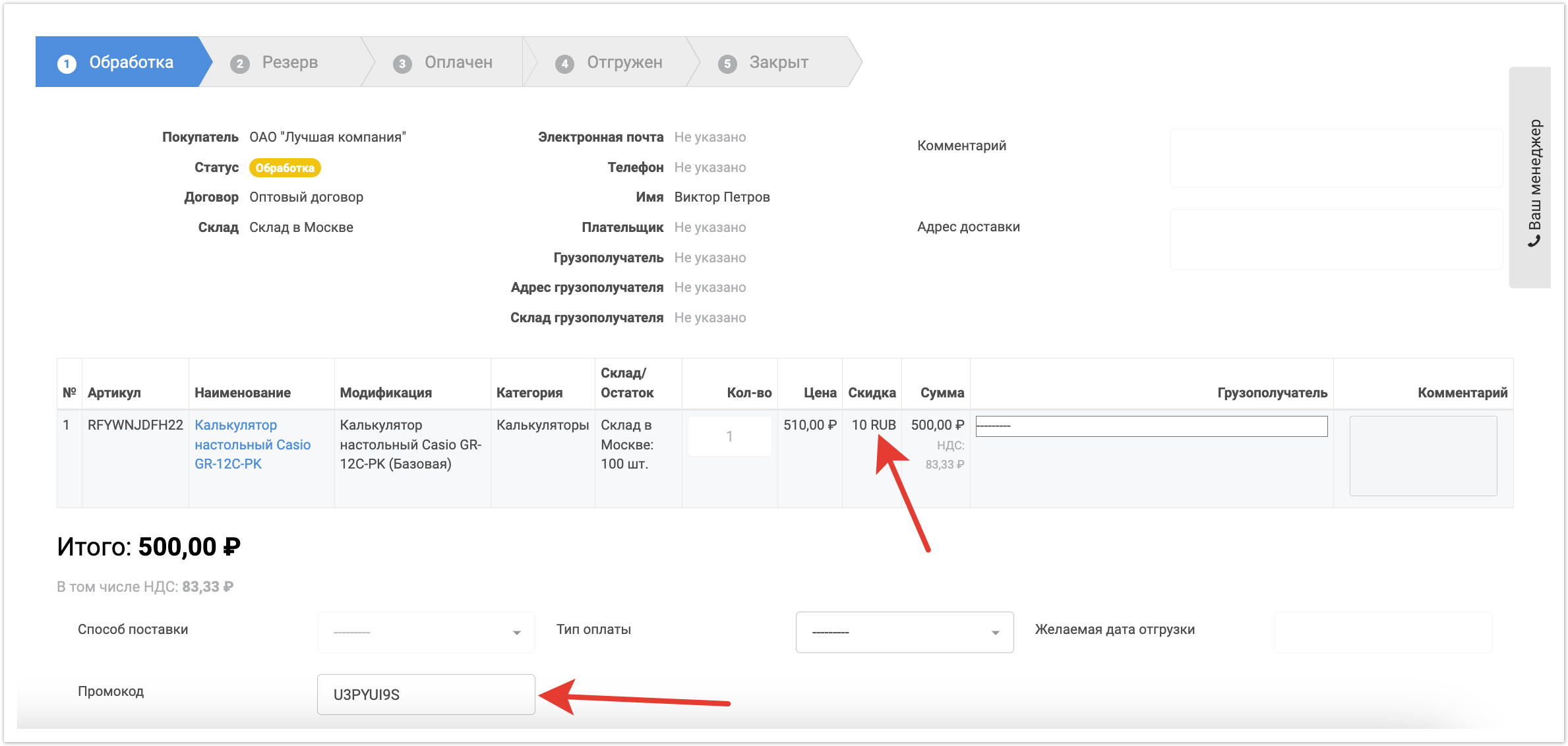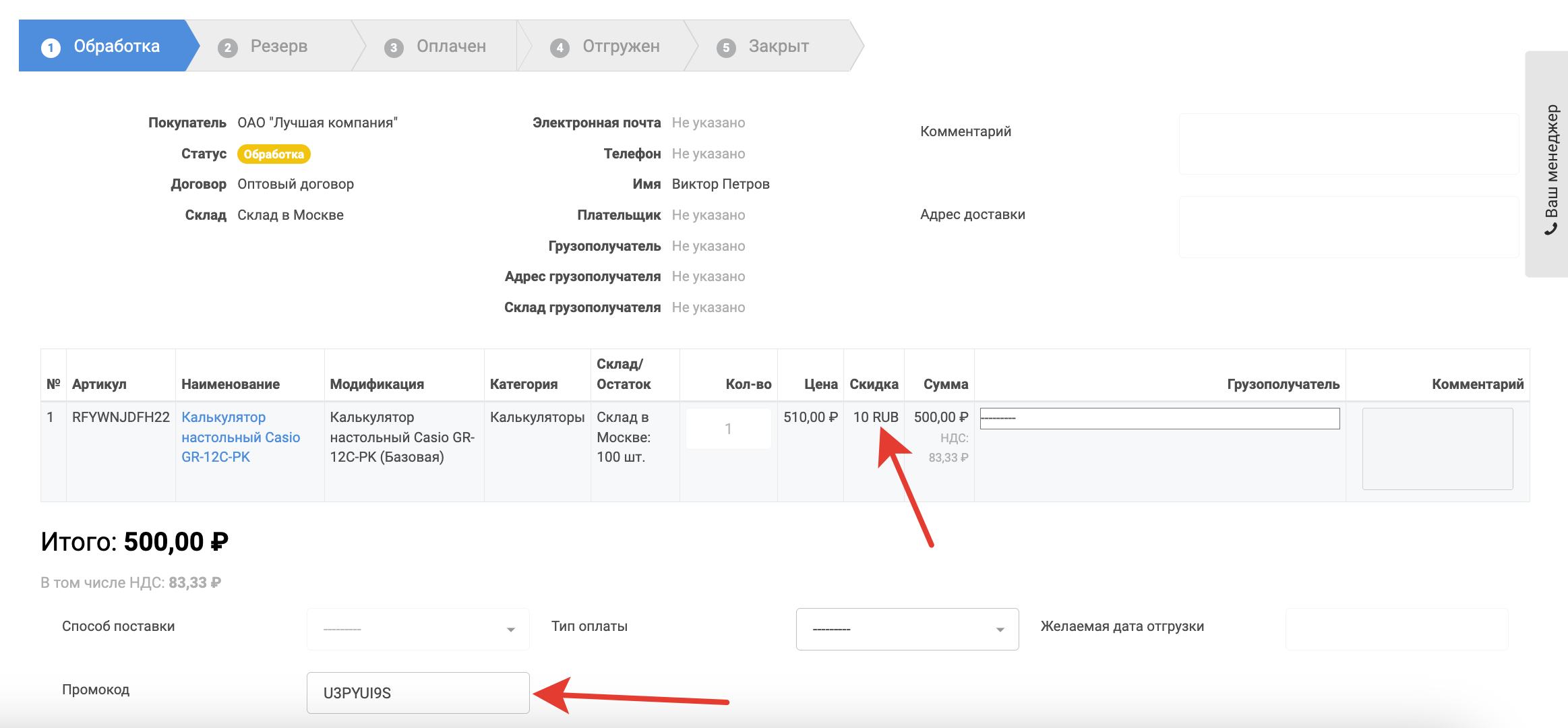 Будет сформирован заказ с суммой скидки, которая предоставляется по промокоду: