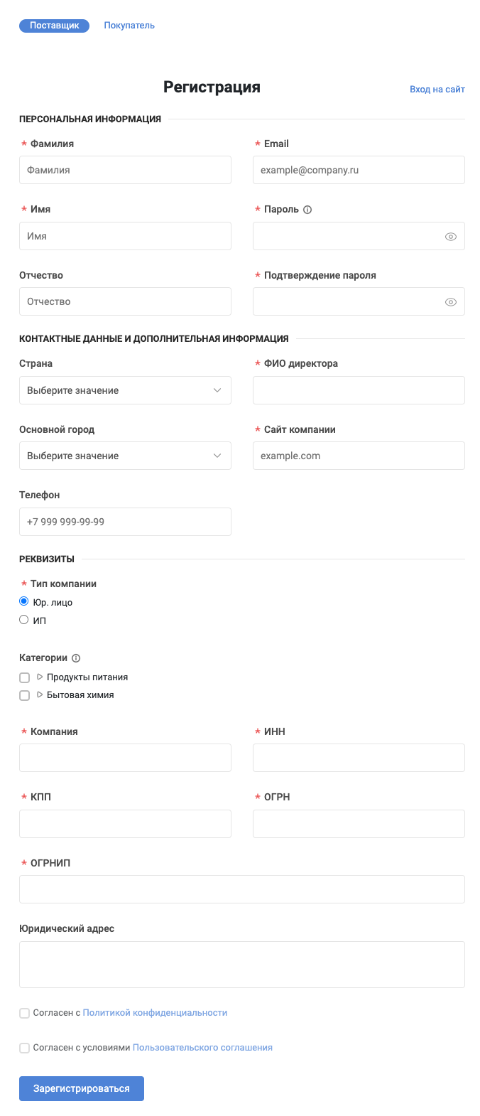 После этого происходит автоматическая переадресация на страницу личного кабинета поставщика, где уже и заполняются все остальные обязательные реквизиты компании: ИНН, КПП, ОРН, расчетный счет и прочее.