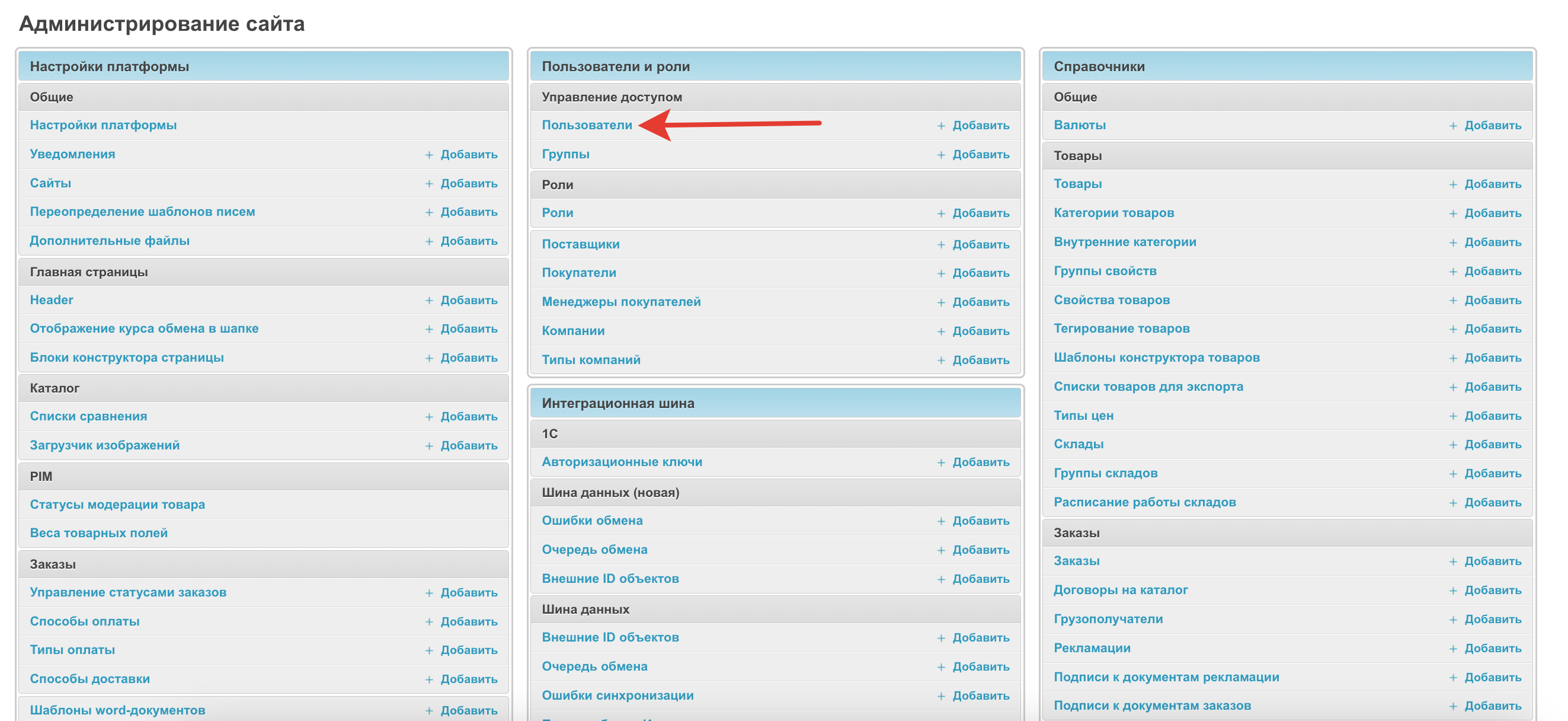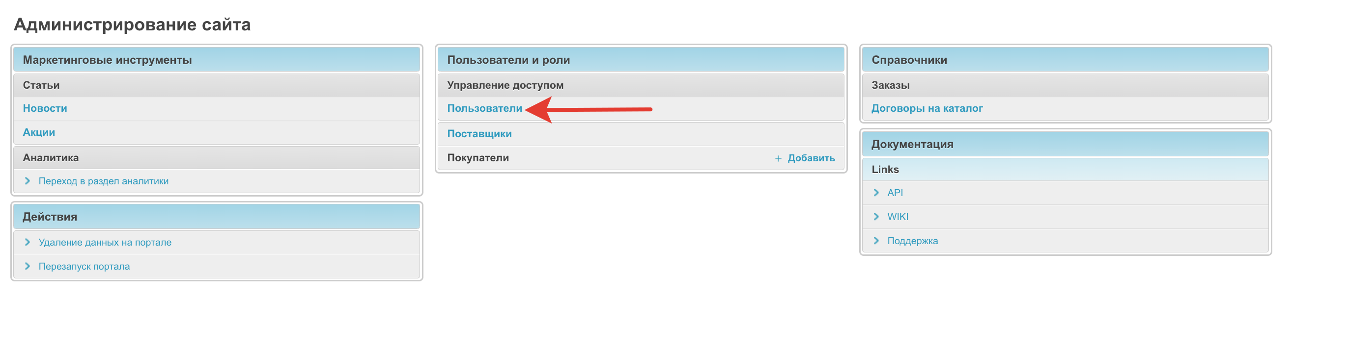 Чтобы дать права модератора, администратор системы должен зайти в раздел Пользователи административной панели: