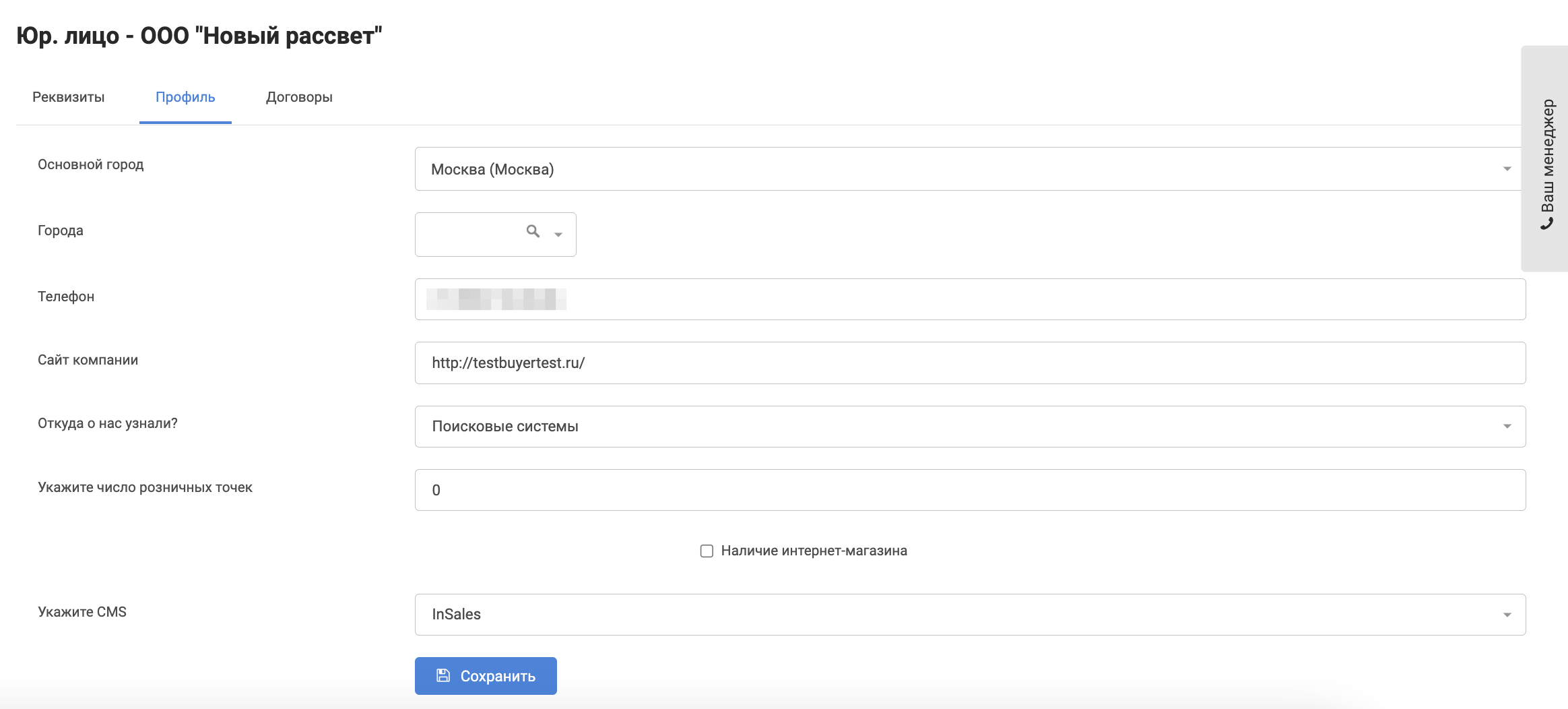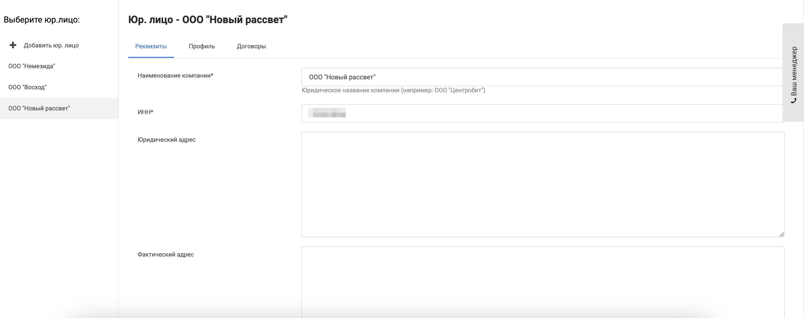 Здесь можно изменить реквизиты выбранного юр. лица или добавить юр. лицо.