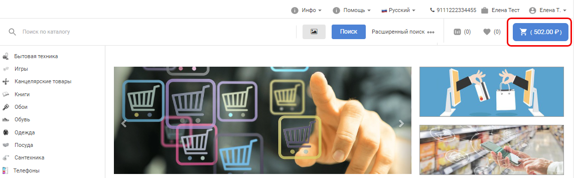 Чтобы открыть корзину, в личном кабинете покупателя нажмите на значок корзины с суммой заказа в правом верхнем углу: