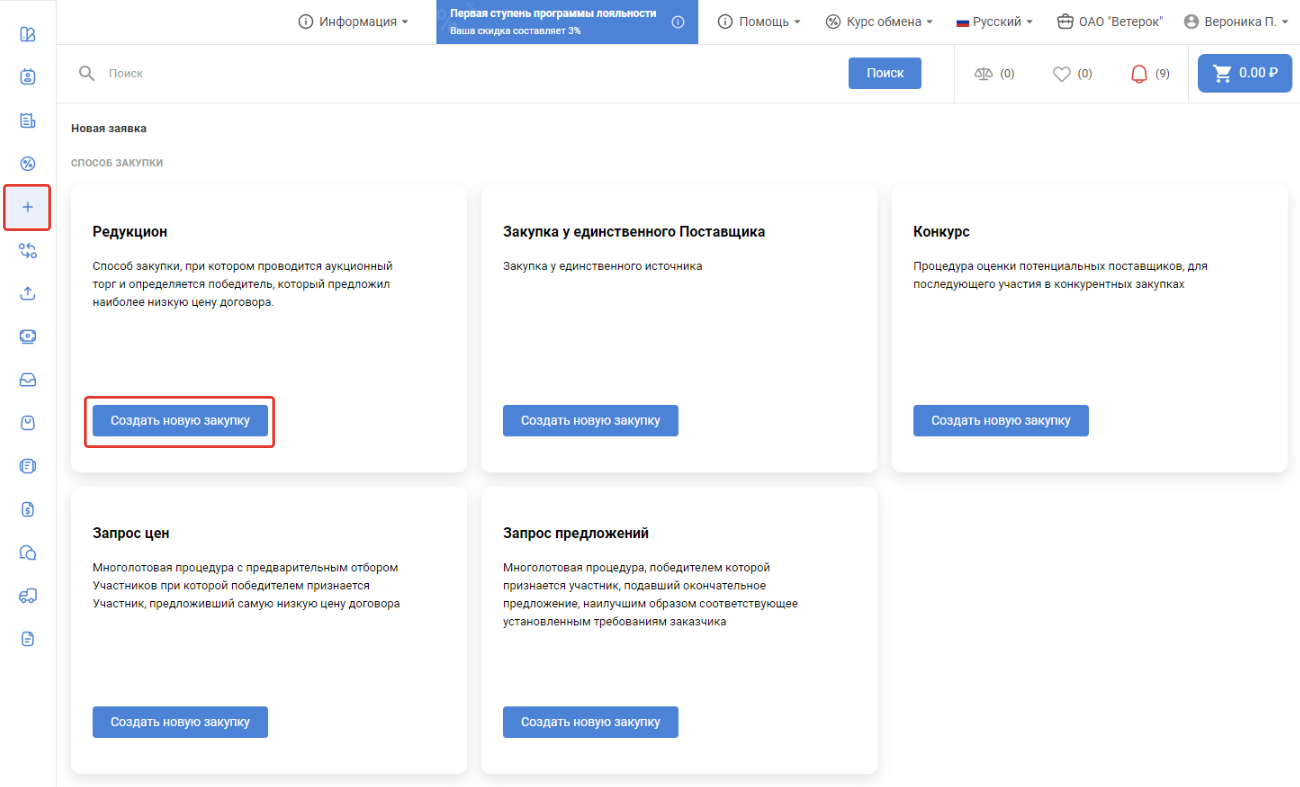 Для оформления запроса в личном кабинете покупателя нажмите в левом меню кнопку . На появившейся странице подведите курсор к области Редукцион и нажмите кнопку Создать новую закупку: