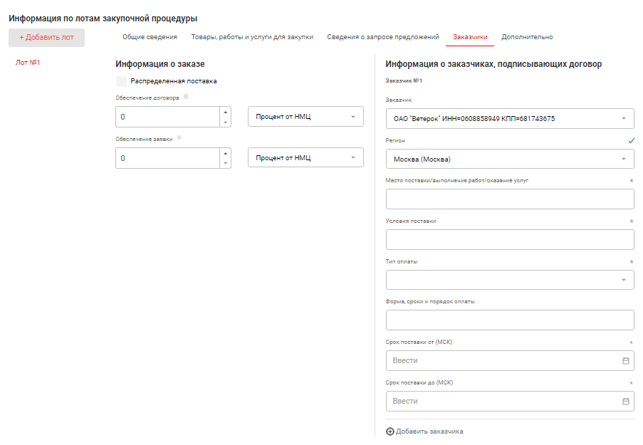 Для добавления еще одного заказчика нажмите Добавить заказчика.